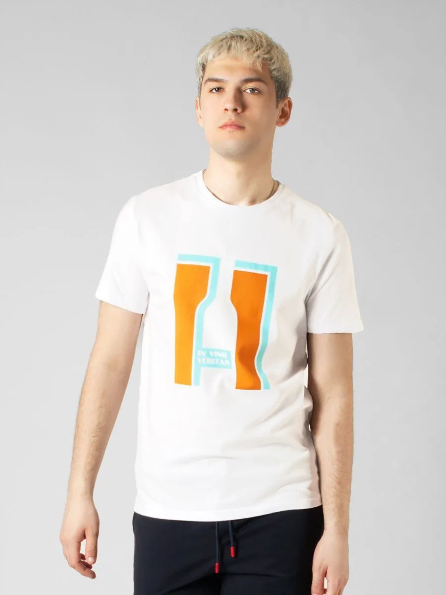 Белая хлопковая футболка с символичным ярким акцентом. В качестве принта на футболке изображен силуэт винной бутылки и знаменитая надпись "In vino veritas", значение которой известно многим. Такая футболка отлично подойдет для отдыха и встреч с друзьями, на которых за долгими диалогами рождается истина.