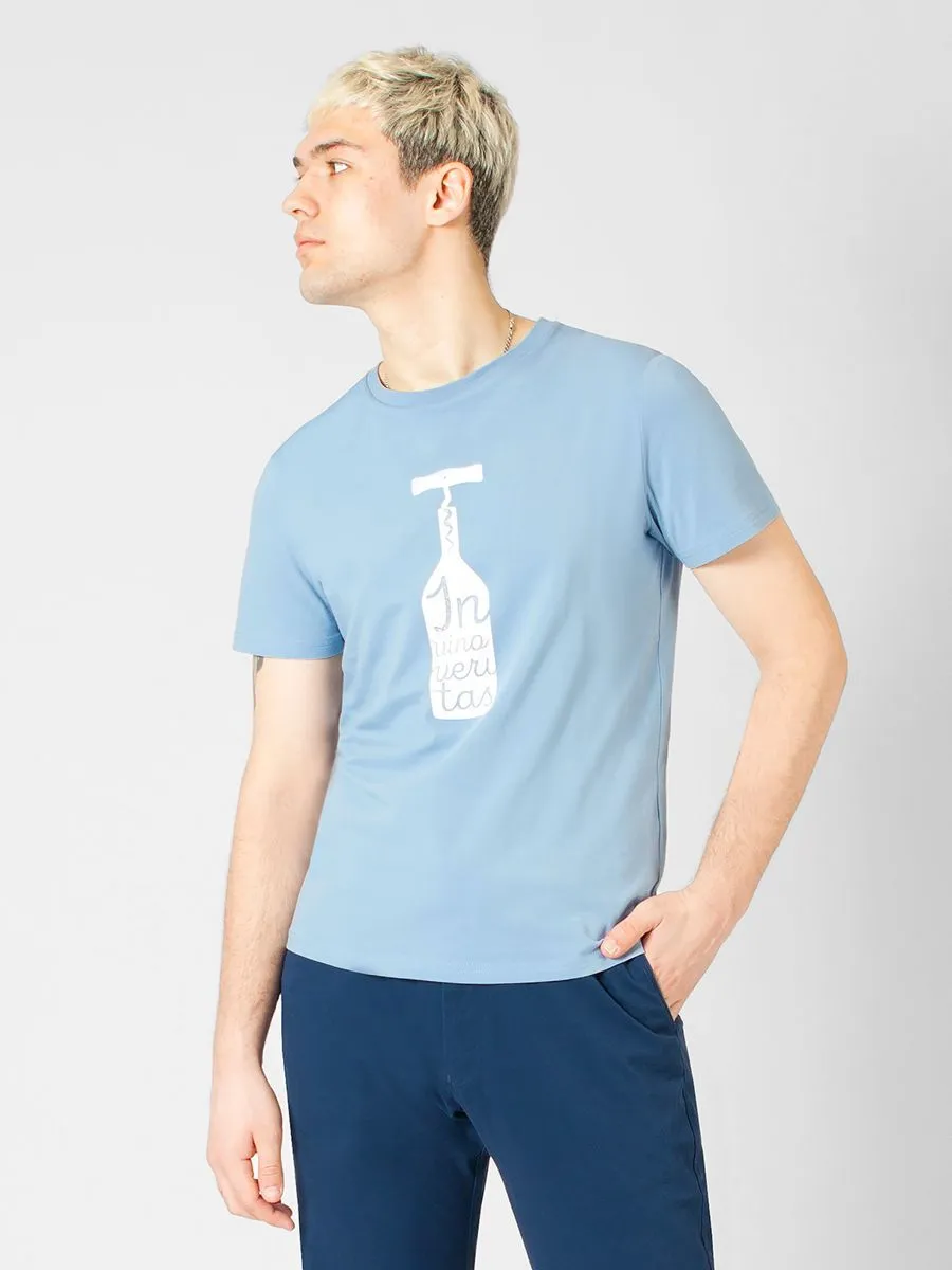 Мужская футболка приталенного силуэта серо-голубого оттенка с авторским принтом. Может быть отличным дополнением под кардиган, пиджак или лёгкую куртку/ветровку, а также выступать в качестве самостоятельного предмета гардероба. В составе присутствует лайкра, благодаря которой изделие не теряет форму на протяжении долгого периода времени