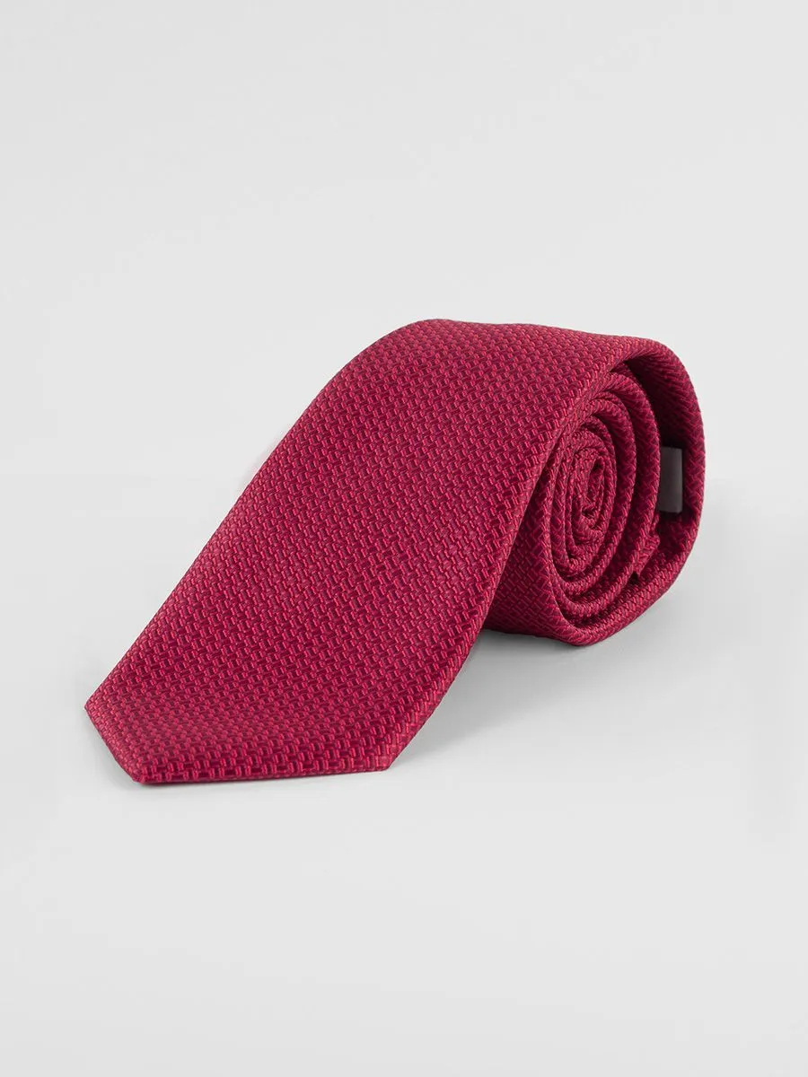 Красный галстук с малиновым оттенком и микродизайном послужит контрастным украшением к праздничному костюму или пиджаку. Пробуйте сочетать галстук с различными оттенками синего и голубого.