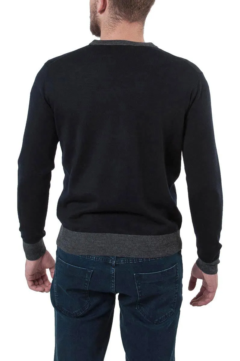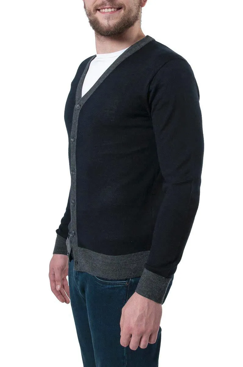 Темно-синий полушерстяной кардиган на пуговицах. Модель имеет V-образный вырез. Края изделия выполнены в сером цвете.
