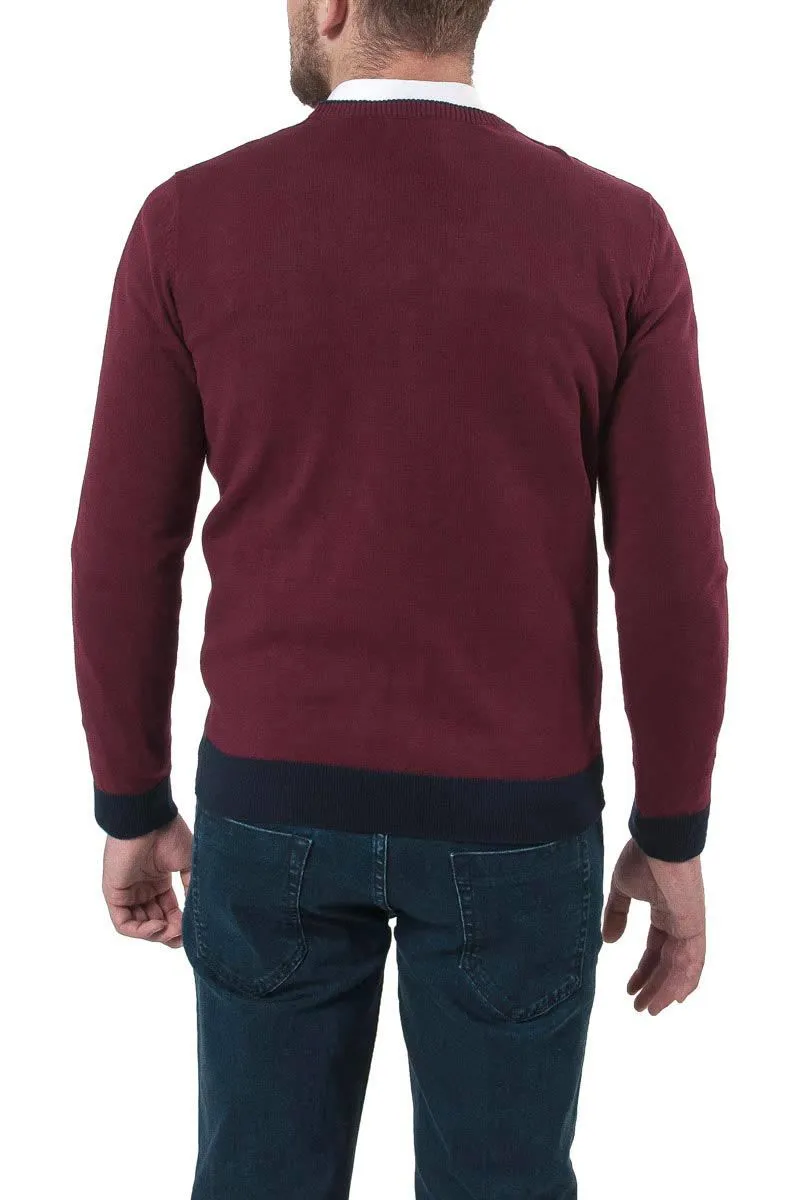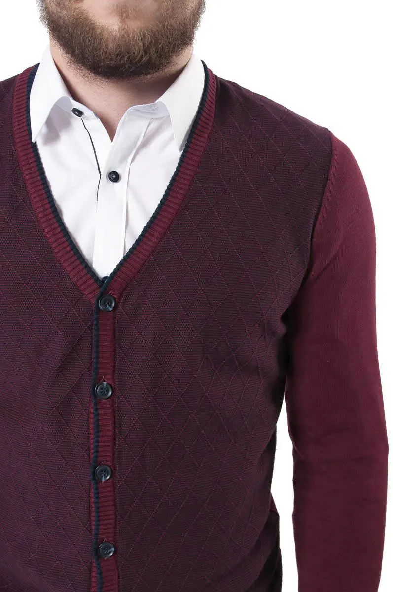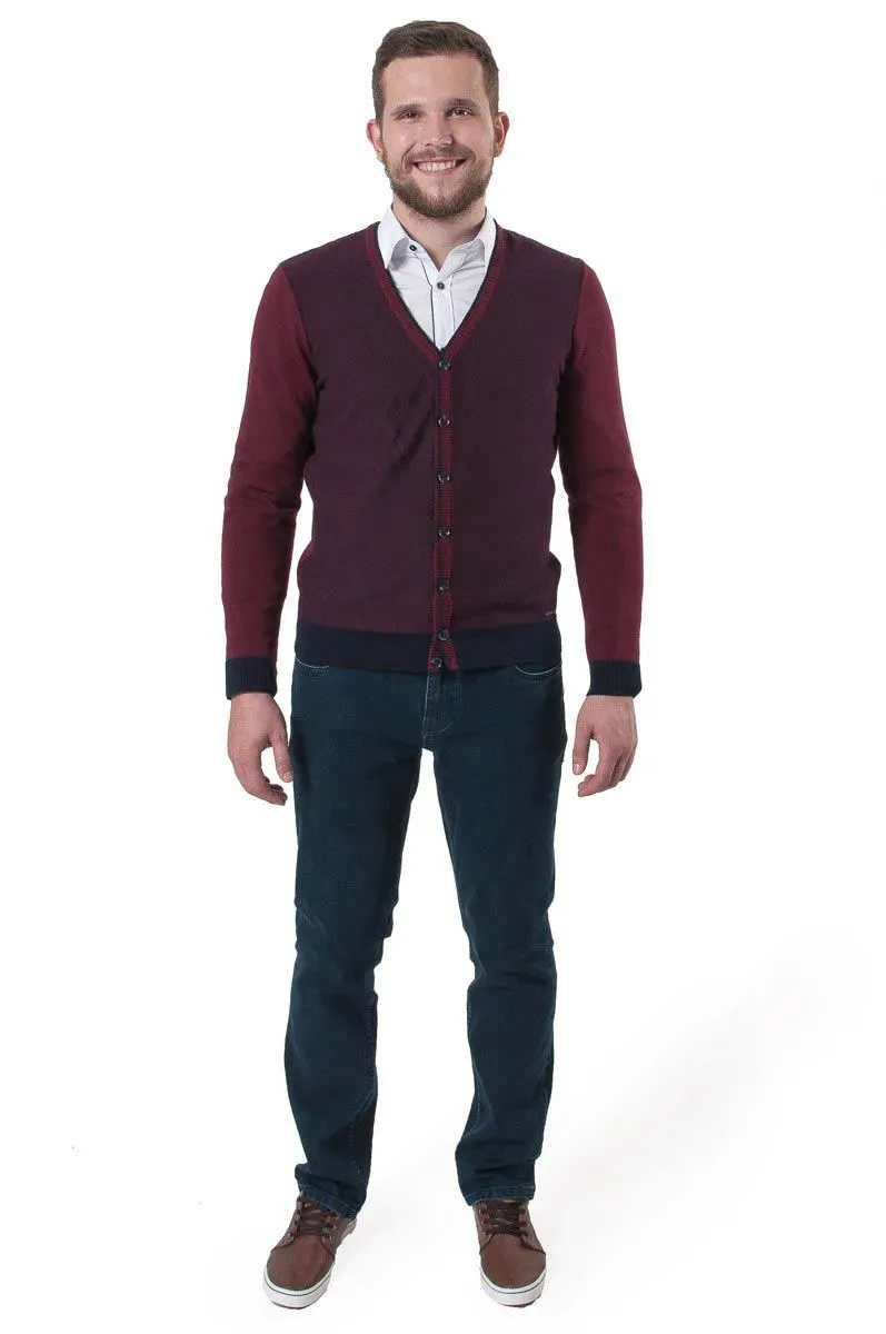 Бордовый кардиган, состоящий из 100% хлопка. Модель имеет V-образную горловину и застегивается на пуговицы. Лицевая часть имеет текстурный рисунок, а также нашитый металлический лейбл "Peplos". Низ и манжеты в черном цвете выполнены в виде резинок.