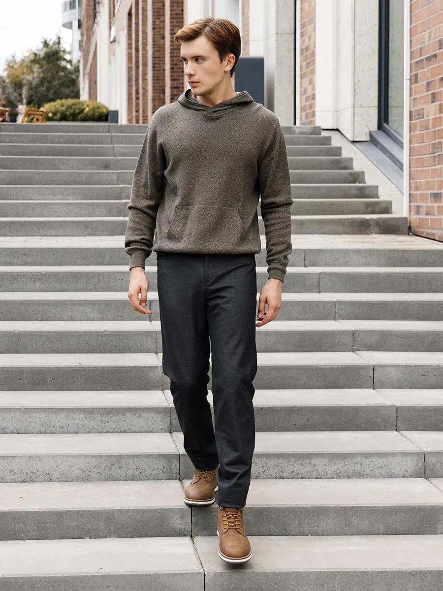 Мужское вязаное худи зеленого цвета.Модель имеет нерегулируемый капюшон и удобный карман «кенгуру» спереди. Достоинство худи заключается в том, что эту одежду можно носить всем мужчинам вне зависимости от их возраста и комплекции - хорошо садится на фигуру всех типов. Это спортивная модель, но она сочетается не только с одеждой соответствующего стиля, но и с обычной повседневной одеждой – джинсами и брюками в стиле casual.