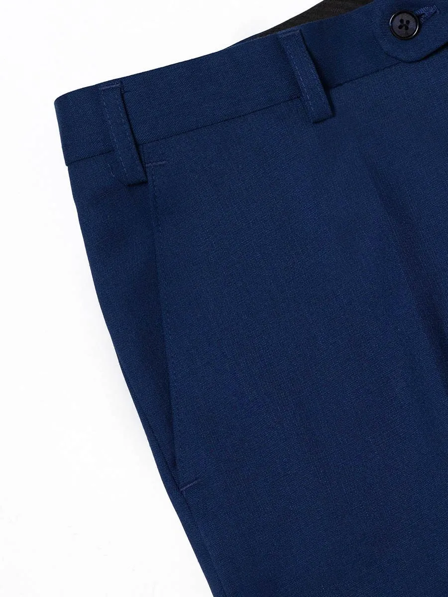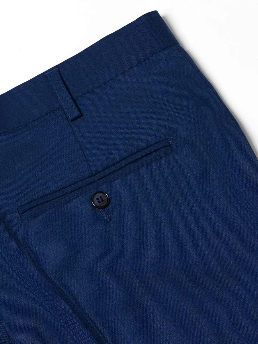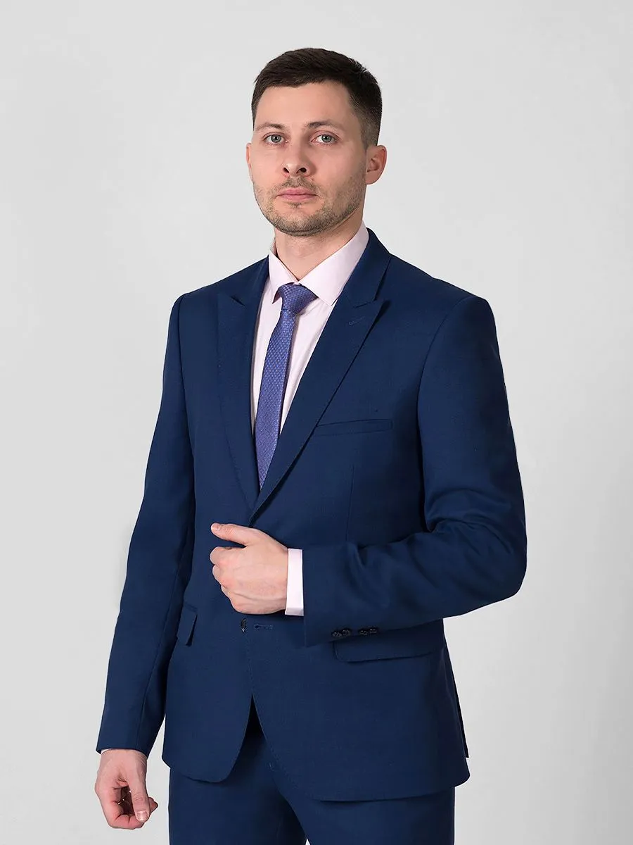 Мужской темно-синий однотонный костюм приталенного фасона является идеальным вариантом для стройных мужчин. Он одинаково хорош и для деловой встречи, и для "выхода в свет". Ткань имеет интересную фактуру, напоминающую клетку за счет особого пересечения продольных и поперечных нитей. Костюм имеет приталенный пиджак с острым лацканом и внутреннее моделирование подклада. Под внутренним моделированием подразумевается необычная внутренняя отделка пиджака из двух тканей - тканью с переливающимся рисунком прошита спинка, окантовка внутреннего кармана и окантовка самого подклада. Отличительной особенностью пиджака также является вспушка подборта из светло-синих ниток.