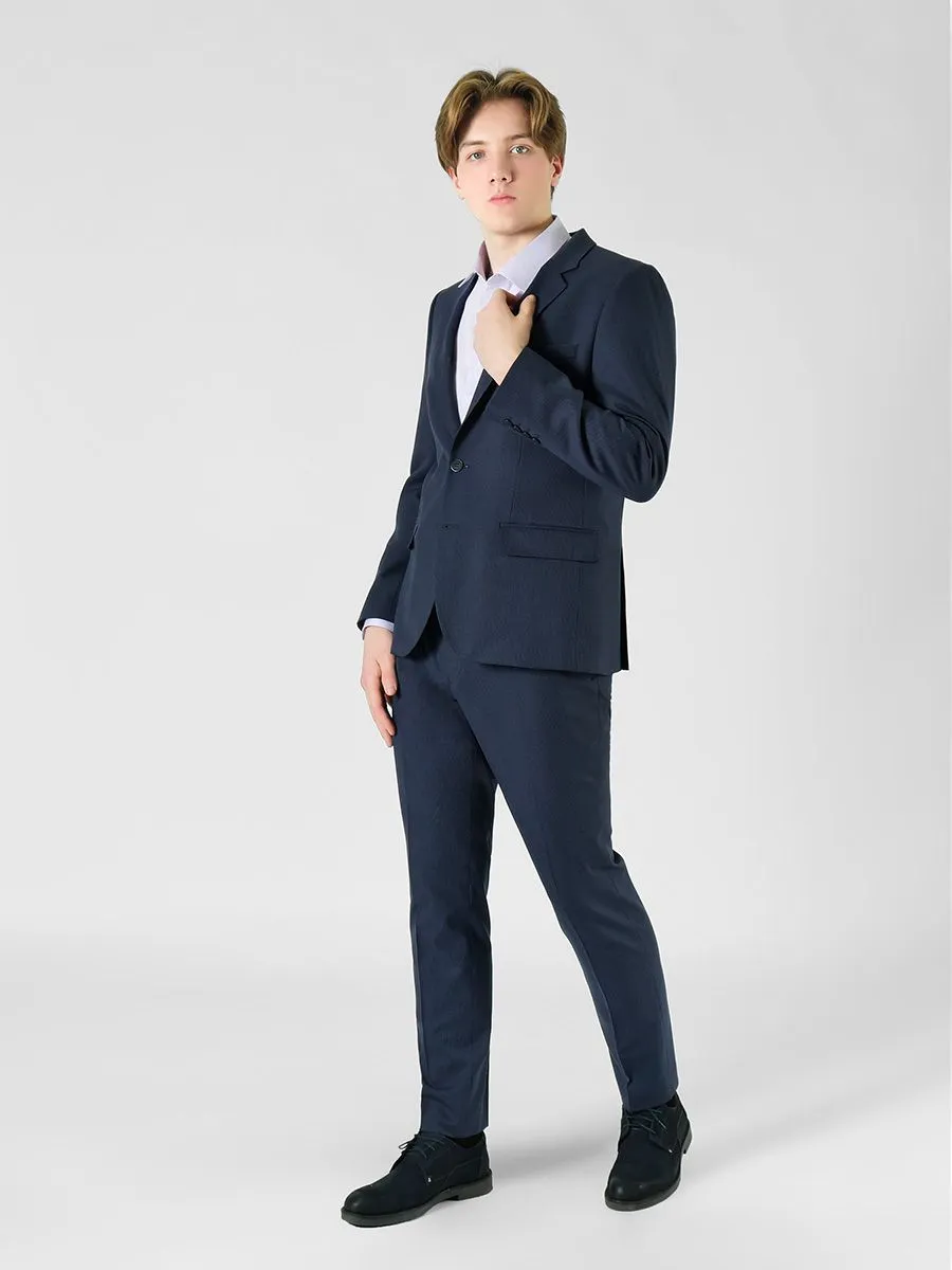 Синий мужской костюм изготовлен в полуприлегающем силуэте, что означает среднюю свободу по талии. Брюки равномерно заужаются к низу. Ткань с микродизайном издалека выглядит однотонной. Подклад пиджака вносит нотку расслабленности, ведь он изготовлен из двух тканей, и одна из тканей имеет рисунок в виде бело-голубой крапинки. В целом, костюм можно отнести к строгому классическому стилю, поэтому он будет подходящим вариантом для офисных будней и деловых встреч.