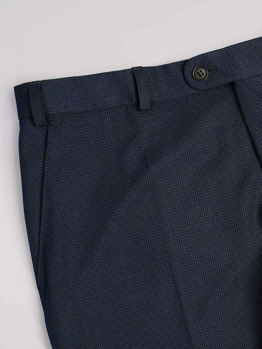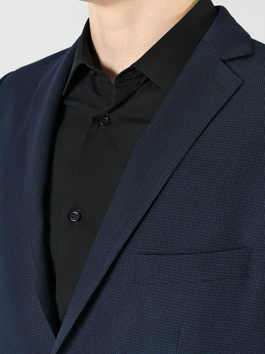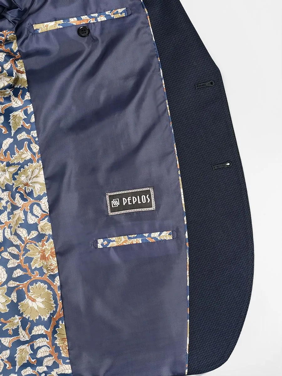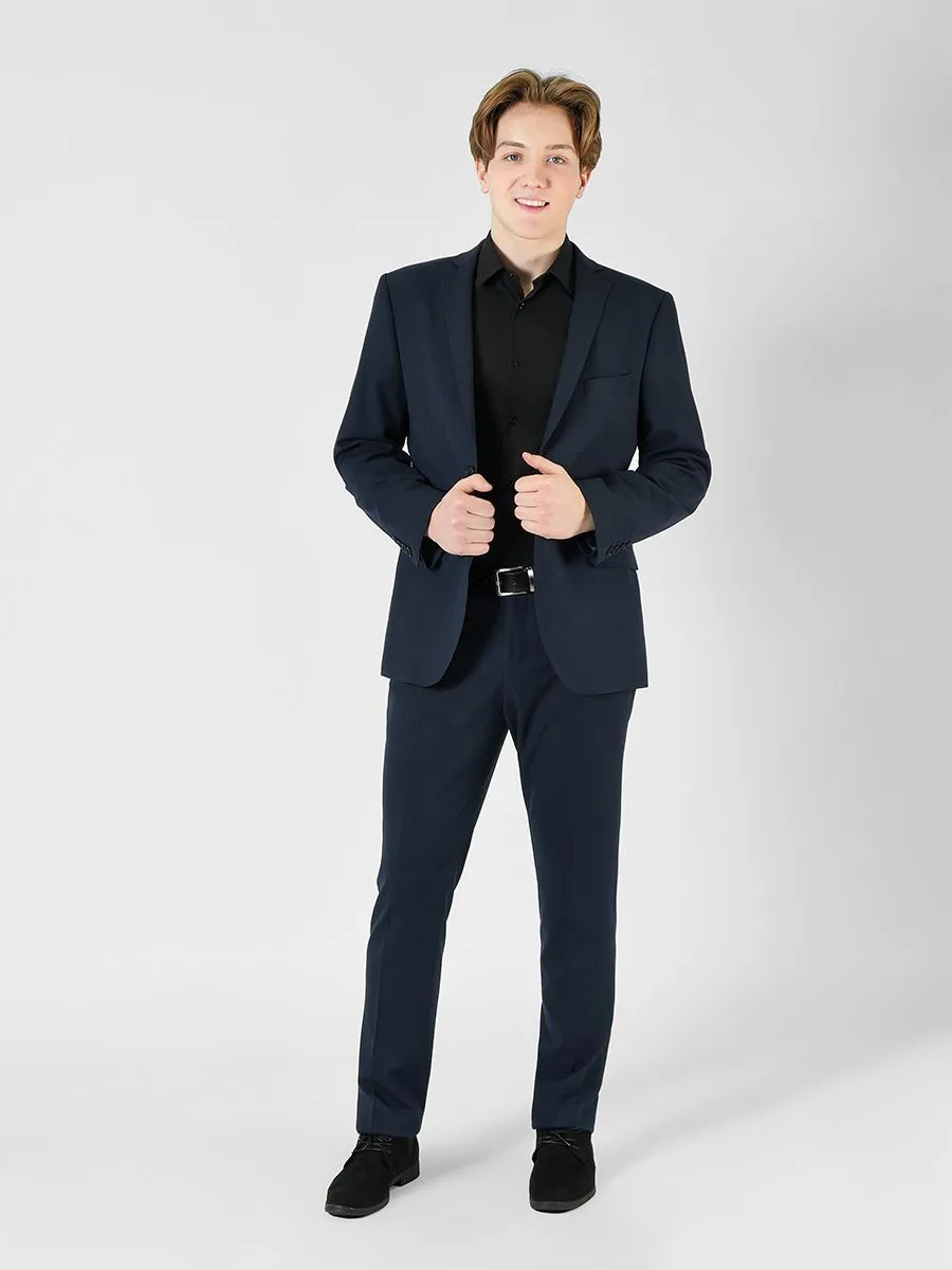 Стильный и строгий мужской костюм от Peplos подойдет для деловых будней и важных встреч. Костюм подчеркивает все контуры фигуры благодаря приталенному силуэту пиджака и зауженному крою брюк. Про мужчину в таком костюме можно будет сказать " одет с иголочки", ведь тщательно продуманные лекала обеспечивают точную посадку по фигуре. В составе ткани есть спандекс, благодаря чему она будет растягиваться и не сковывать движения. Рисунок ткани образуется за счет переплетения синих и черных нитей, в результате чего у ткани появляется фактурность и сложный цвет.