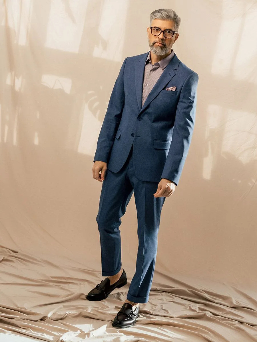 Первое, что притягивает взгляд- это небесно-голубой цвет ткани, при этом она не однородна, имеет микродизайн. Второе, на что сразу обращаешь внимание - это манжеты на брюках. Поэтому лучше всего костюм носить в теплое время года, тогда костюм проявит себя лучше всего. В нем будет легко и свежо, благодаря дышащему составу и светлому оттенку ткани, небольшой плотности ткани и продуманной моделе.