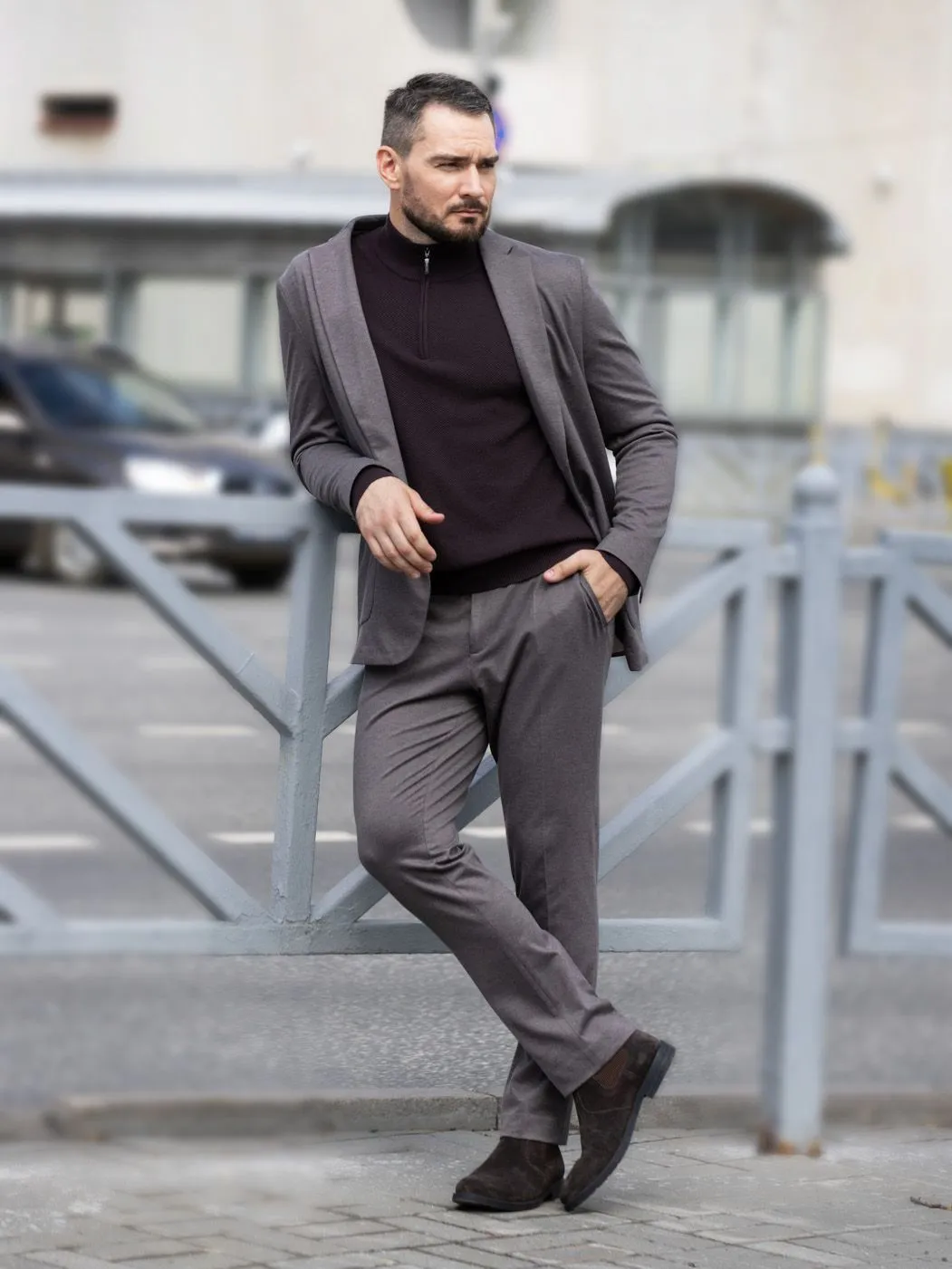 Трикотажный мужской костюм темно-бежевого цвета. Пиджак выполнен с частичным эластичным подкладом (рукава-верхняя часть спинки). Благодаря этому подкладу, пиджак идеально садится по фигуре, не сковывая движений. Элегантные накладные карманы добавляют практичности, при этом не нарушая общей изысканности дизайна .В комплект входят комфортные брюки без подклада.