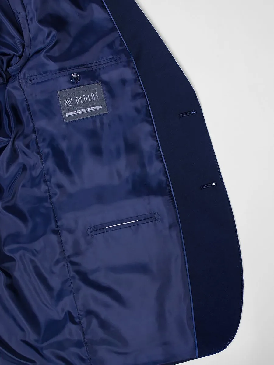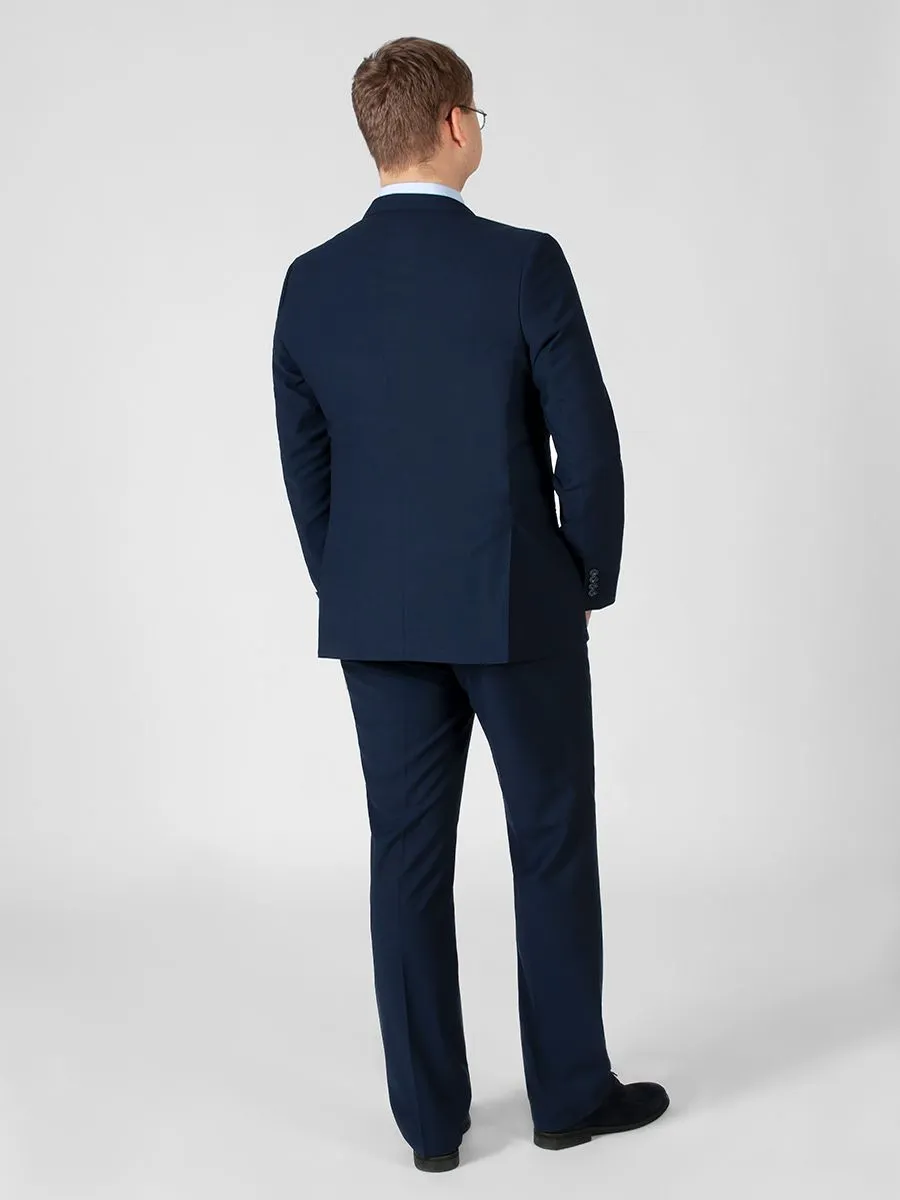 Базовый темно-синий костюм должен быть в гардеробе каждого мужчины, ведь более универсальную вещь найти трудно. Такой костюм пройдет самый строгий дресс-код. Ткань у костюма однотонная без микродизайна. Состав ткани максимально практичен, ведь полиэстер хорошо держит форму, обладает хорошей износостойкостью. Поэтому костюм можно смело использовать для каждодневной носки, в отличие от шерстяных костюмов. Силуэт у костюма полуприлегающий.