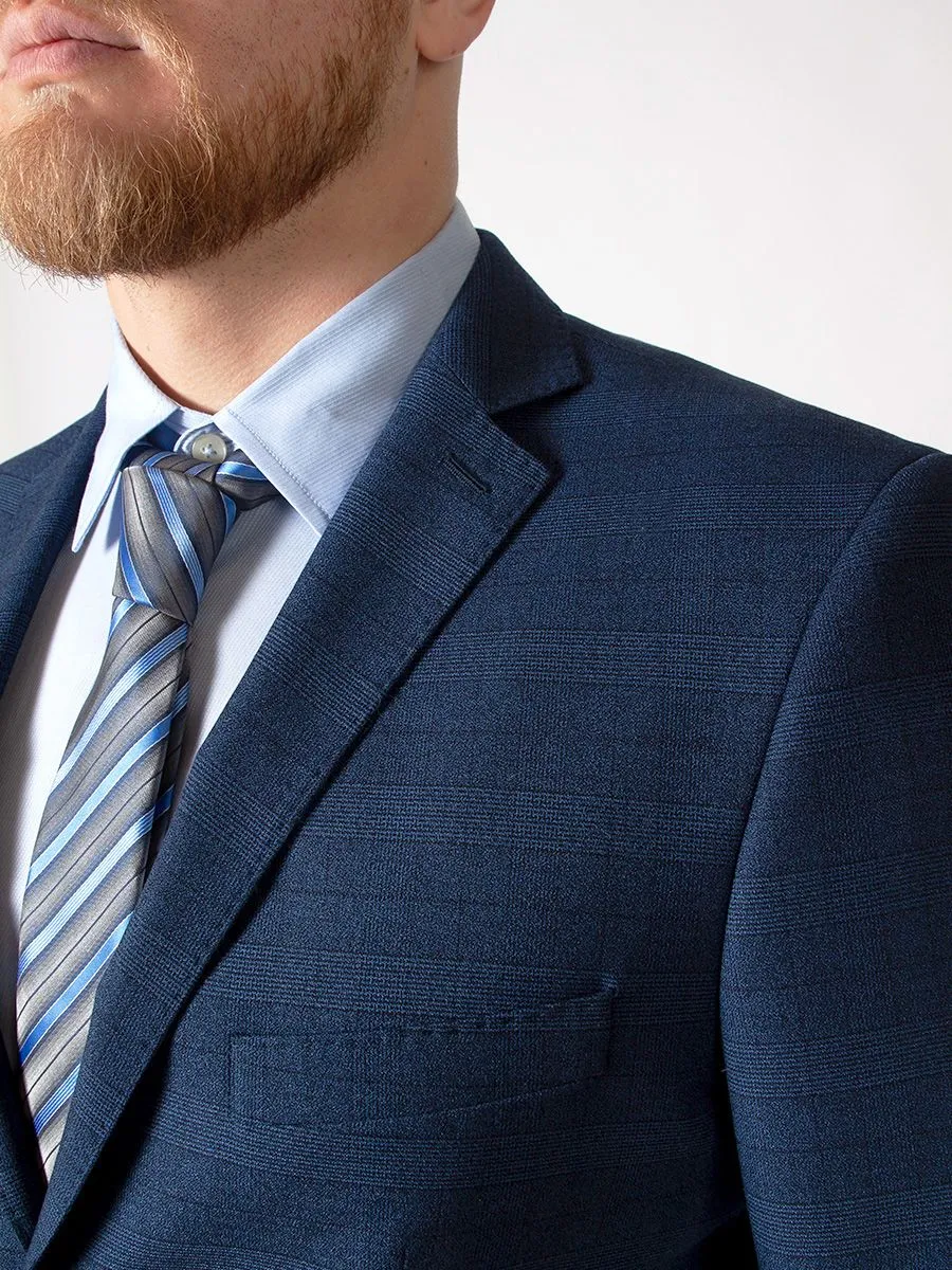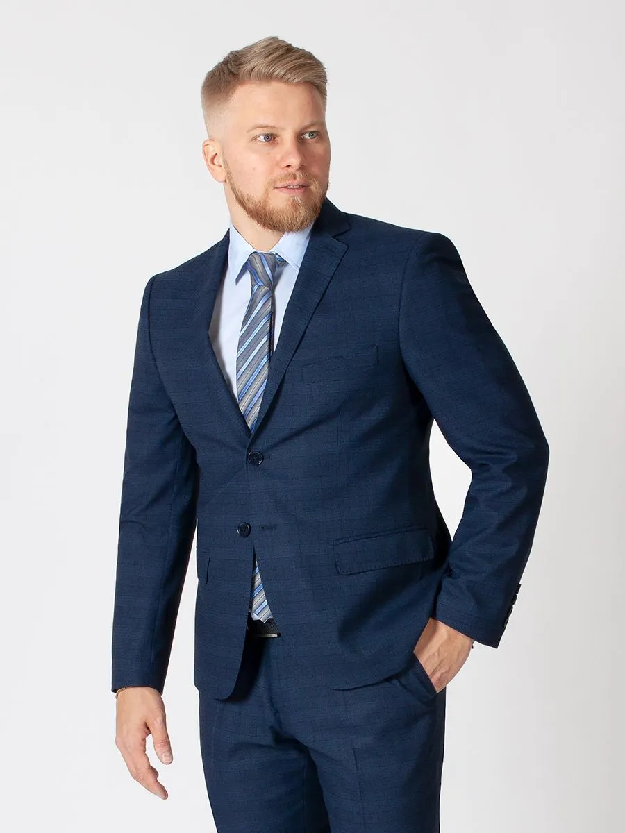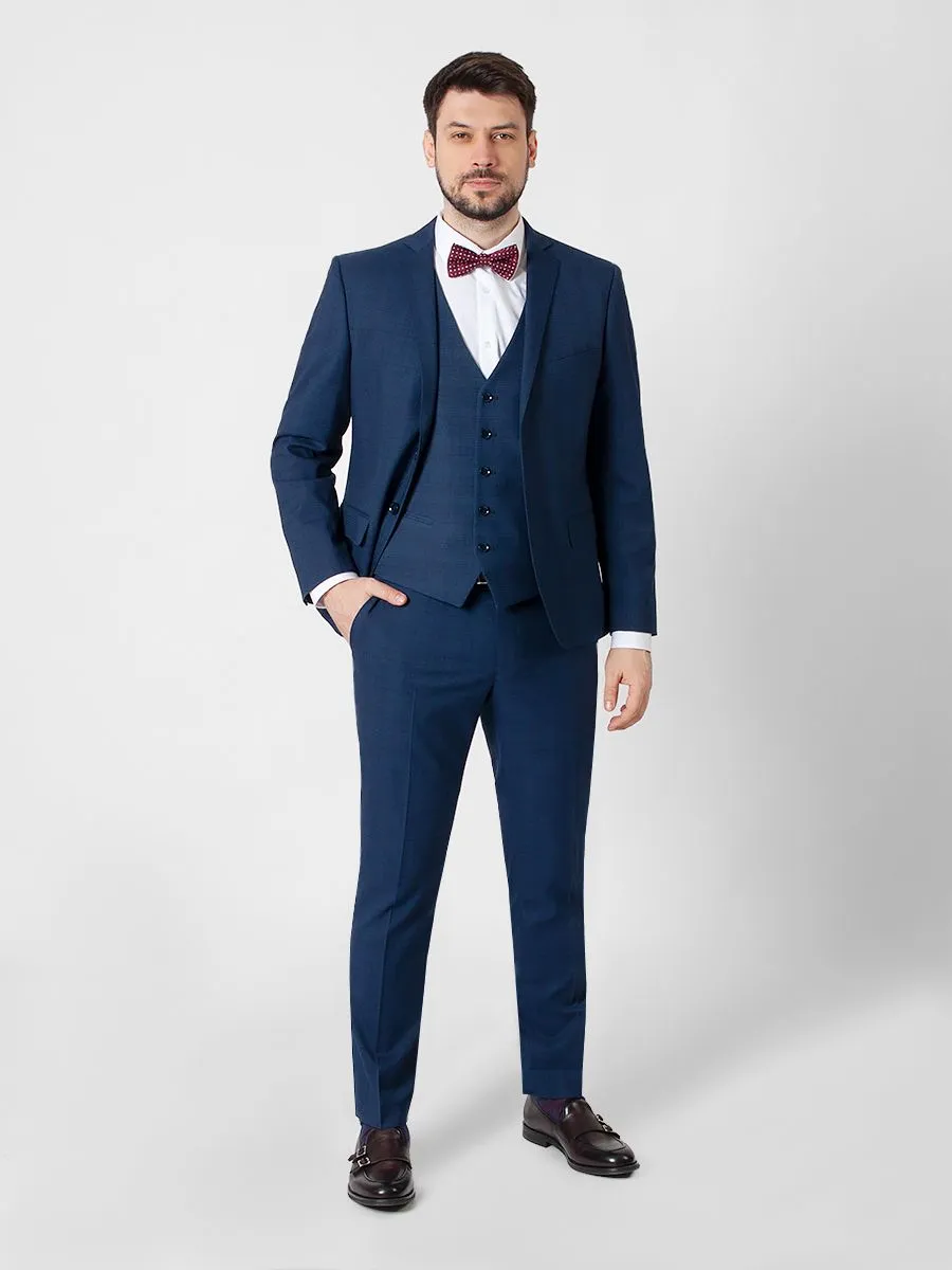 Мужчина всегда выглядит отменно в темно-синем костюме в клетку. В сочетании с голубой сорочкой образ получается довольно сдержанным, но при этом стильным. Модель пиджака имеет полуприлегающий силуэт, благодаря которому владелец может подчеркнуть свою фигуру. Прилегающие по всей длине и слегка зауженные к низу штанины откроют обувь и сделают ноги стройнее. В качестве дополнения к этому ансамблю, стоит выбрать черные лоферы.