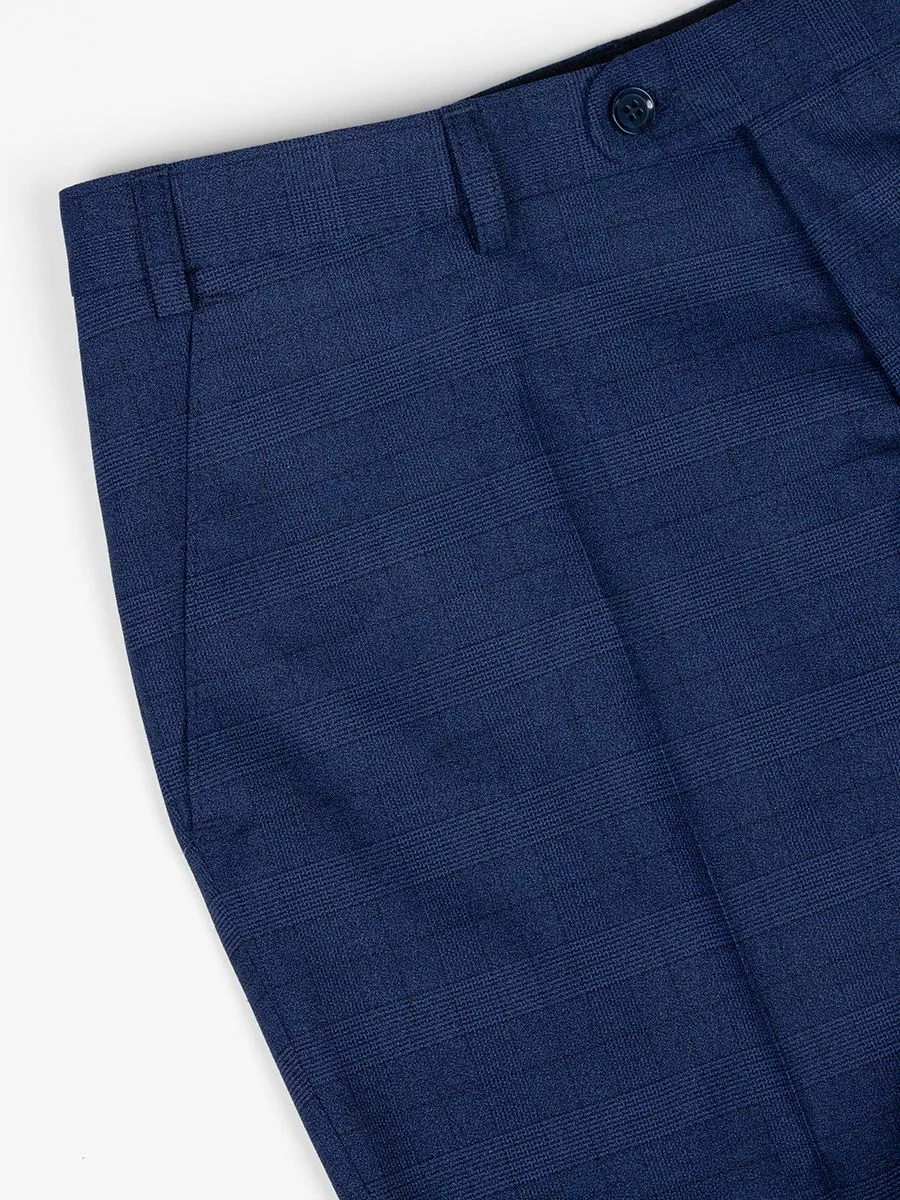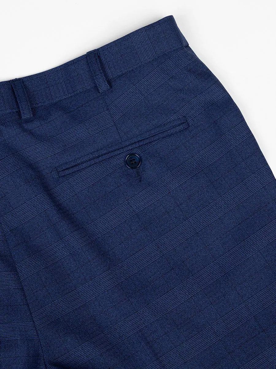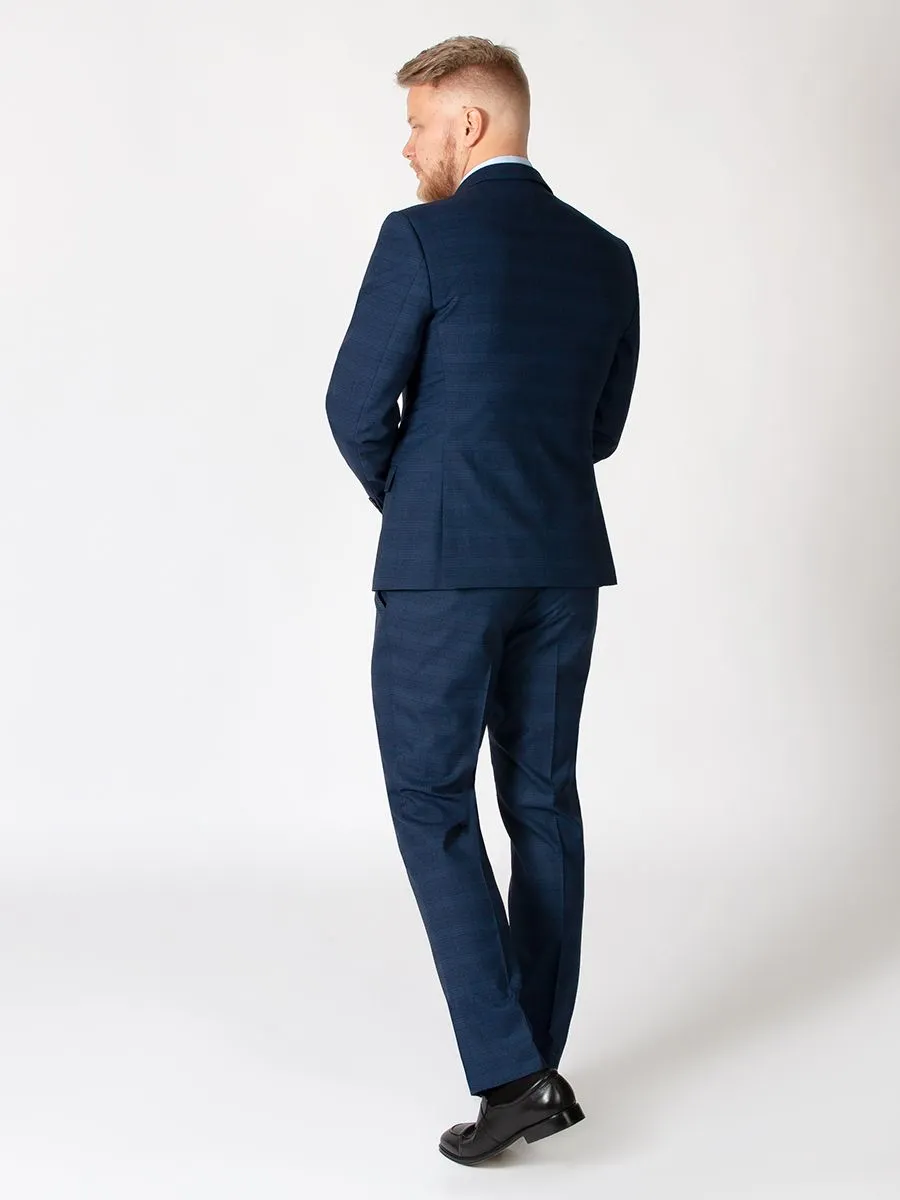 Мужчина всегда выглядит отменно в темно-синем костюме в клетку. В сочетании с голубой сорочкой образ получается довольно сдержанным, но при этом стильным. Модель пиджака имеет полуприлегающий силуэт, благодаря которому владелец может подчеркнуть свою фигуру. Прилегающие по всей длине и слегка зауженные к низу штанины откроют обувь и сделают ноги стройнее. В качестве дополнения к этому ансамблю, стоит выбрать черные лоферы.