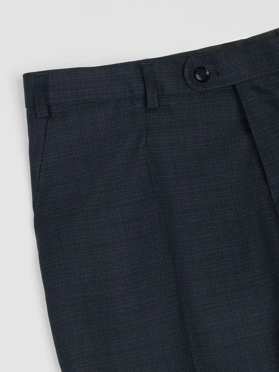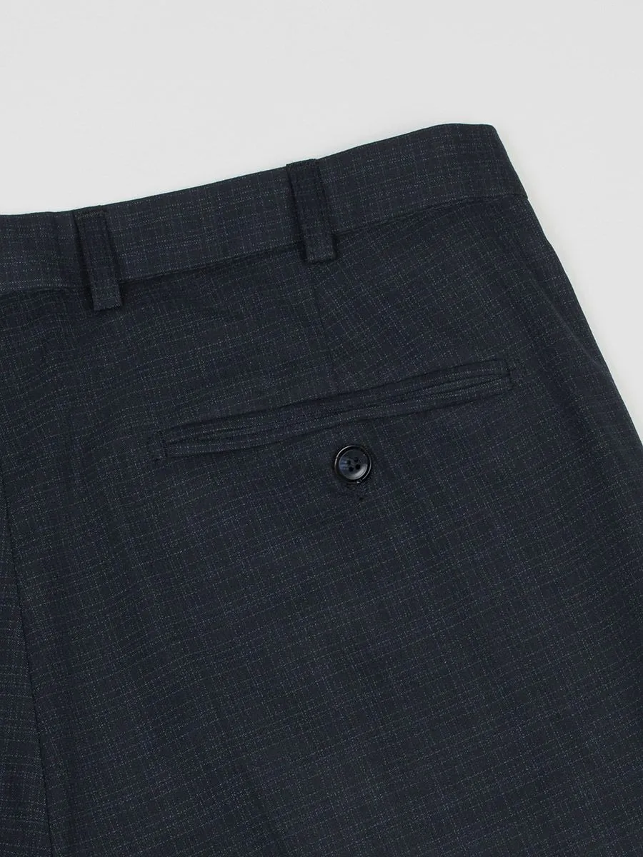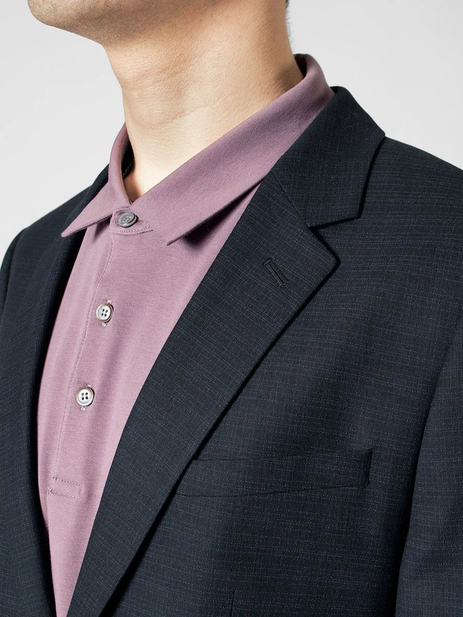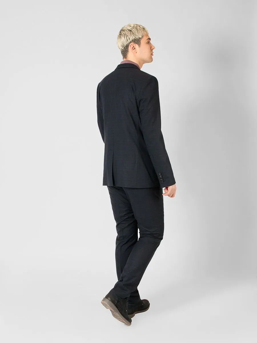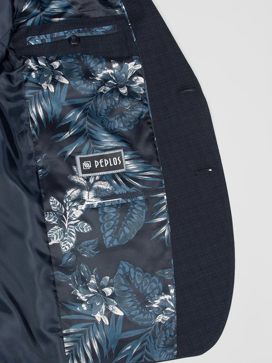 Темно-синий костюм в приталенном силуэте лучше всего сядет на подтянутых мужчин, для тех, кому нужно больше свободы в области талии предпочтителен костюм в полуприлегающем силуэте SU21013-R. Ткань костюма имеет рисунок в виде пересекающихся прерывистых тонких полос, однако, на классическую клетку рисунок не похож. Также у подклада пиджака интересный растительный принт из двух цветов, что придает некоторую экзотику.