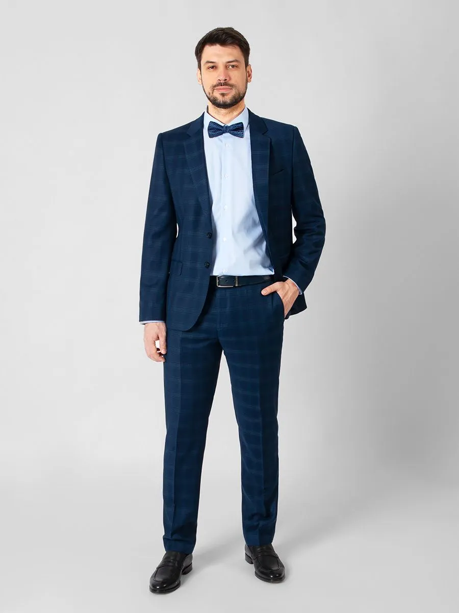 Мужской костюм насыщенного синего цвета с рисунком клеткой хорошо подойдет мужчинам, которые только начали разбавлять гардероб однотонных костюмов. Клетка ненавязчива, но при этом заметна, тонкие голубые нити освежают цвет костюма и в целом внешний вид его обладателя. Модель пиджака тщательно продумана и доработана - есть прибавка по ширине верха рукава, талии и бедер, также увеличена длина пиджака на 1,5см по сравнению с аналогичной моделью. Брюки имеют слегка заниженную талию и небольшое сужение внизу брючин. Все это сделано для комфорта носки и безупречной посадки.