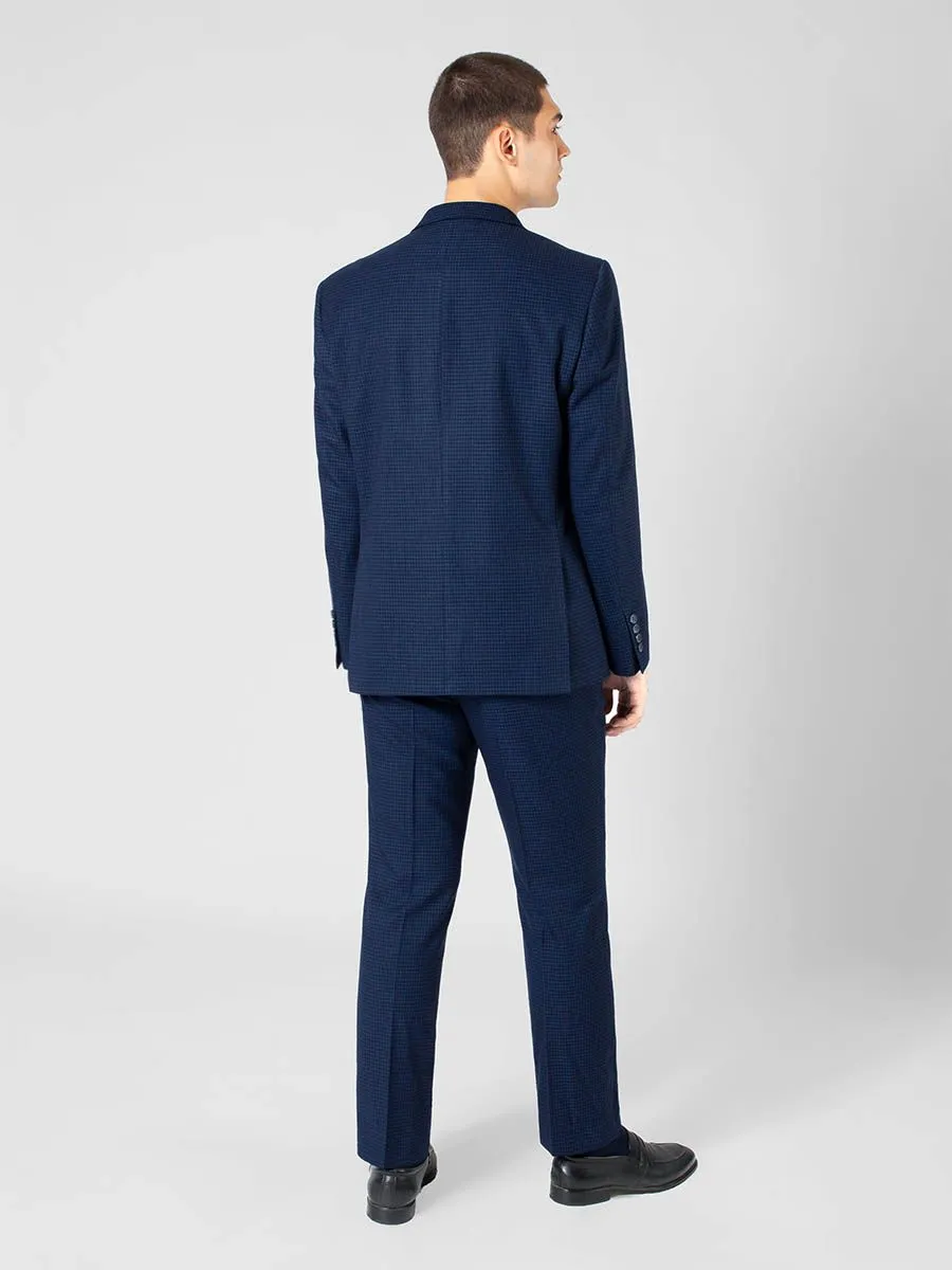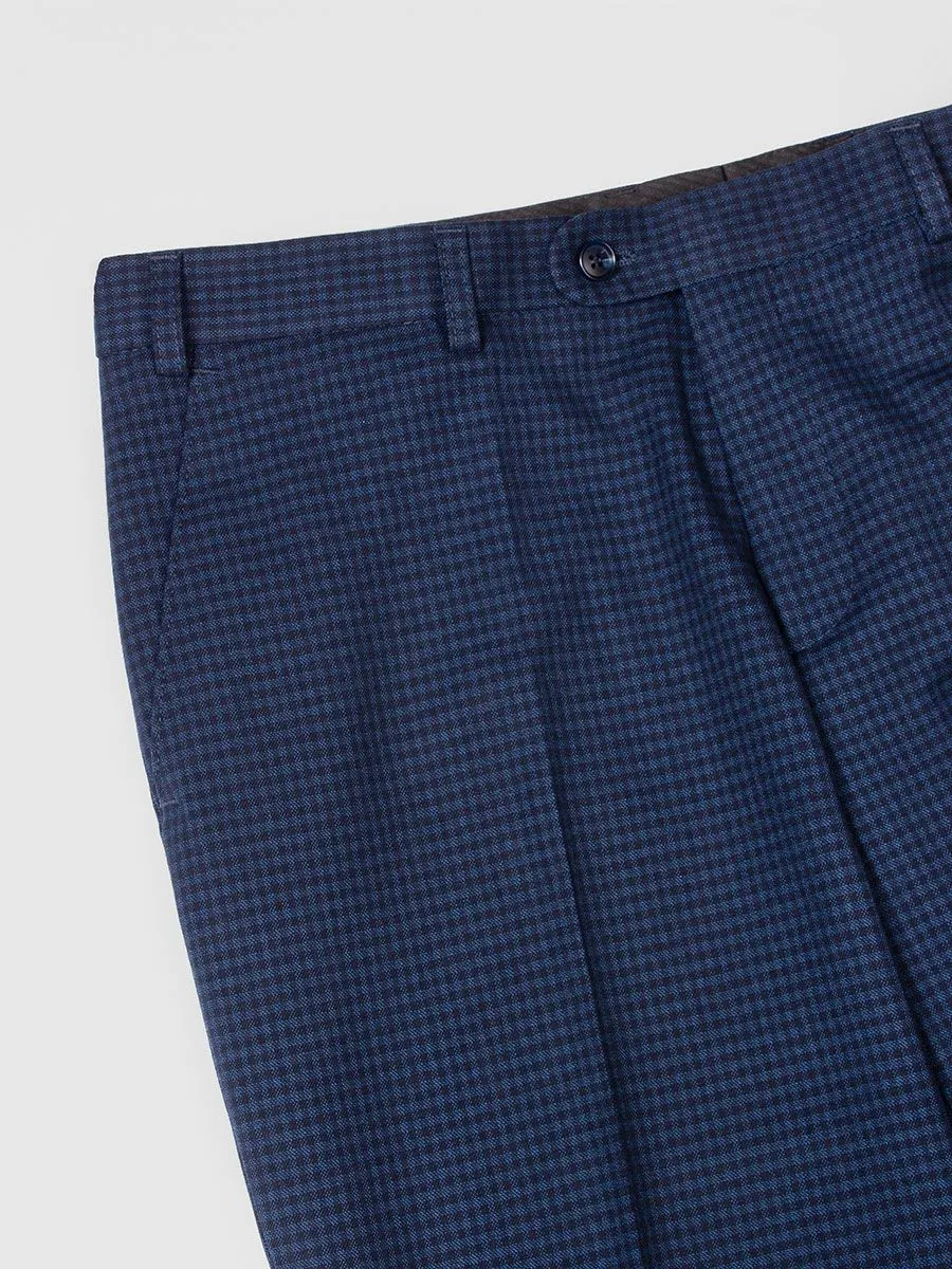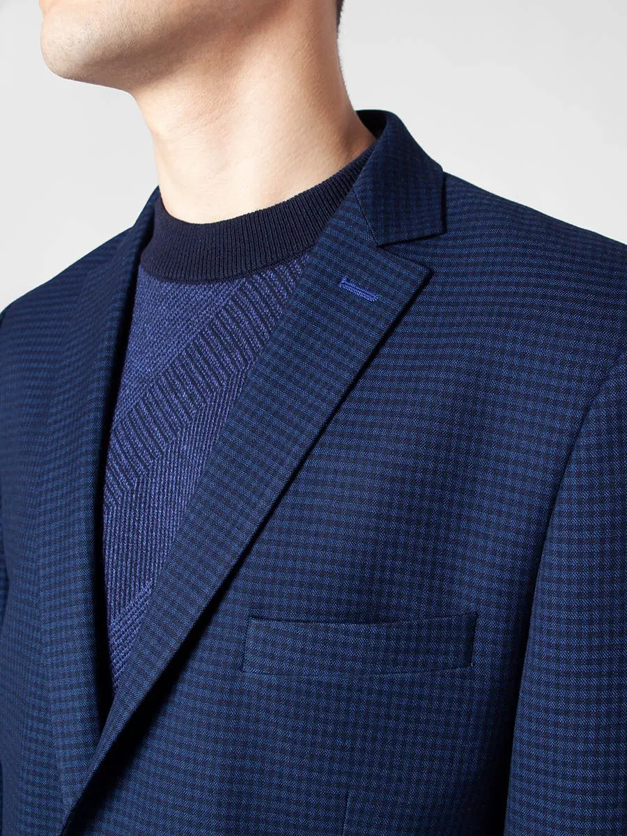 Деловой костюм в классическом силуэте с микродизайном в виде мелкой клетки отлично разбавит гардероб однотонных костюмов. Клетка образована переплетением темно-синих и черных полосок, поэтому не сильно бросается в глаза, но при этом создает фактурность. Классический силуэт пиджака свободно садится по фигуре, под него в холодное время года можно надеть водолазку или джемпер, например, джемпер KN22J014. Две шлицы на спинке также обеспечивают более свободную посадку, благодаря чему удобней класть руки в карманы брюк, что так важно для некоторых мужчин.