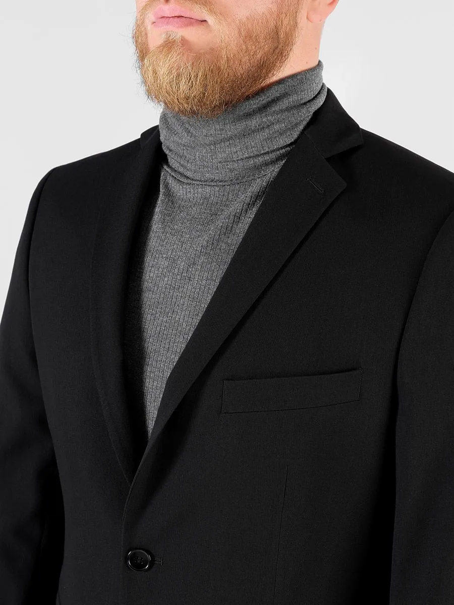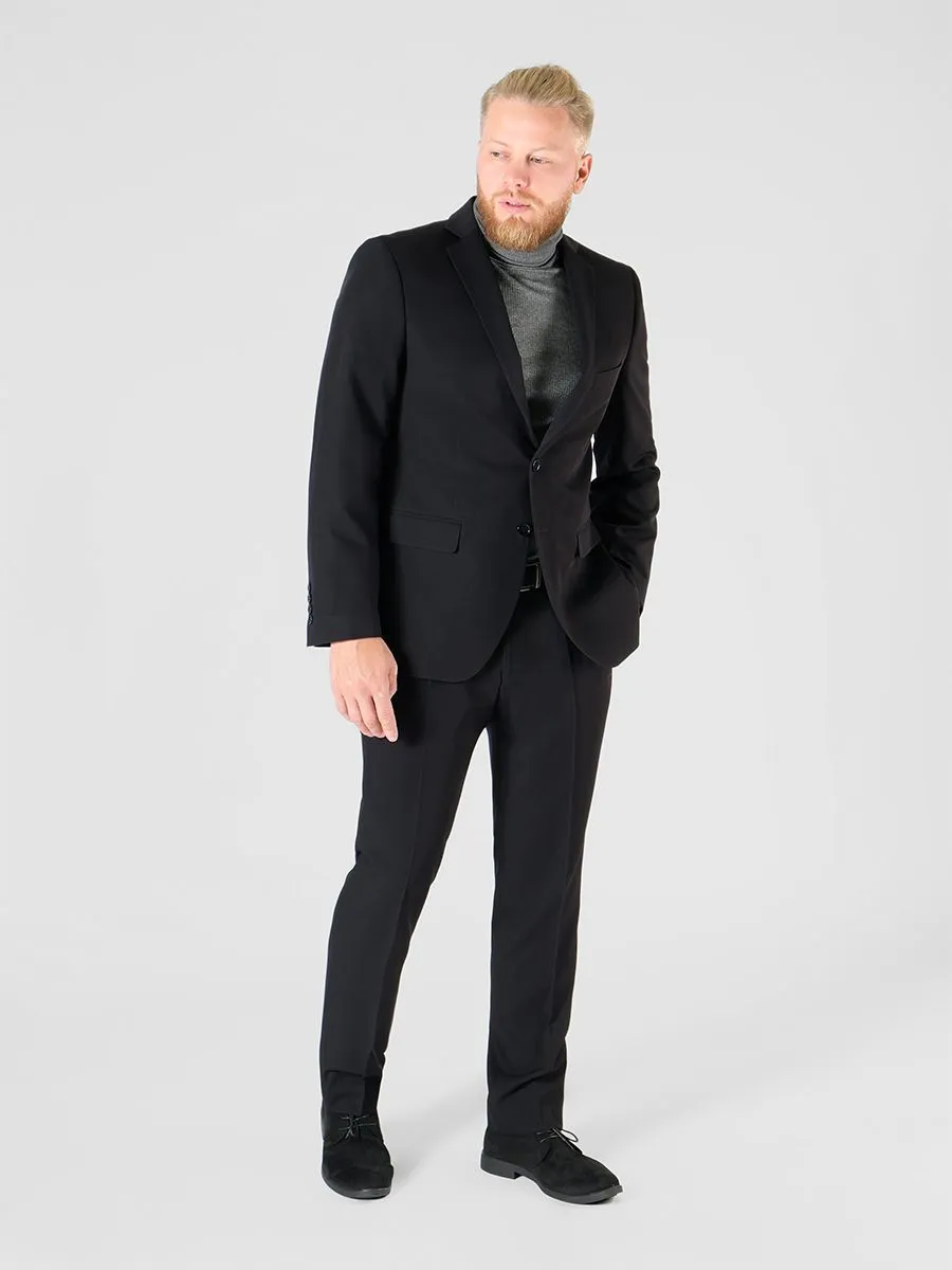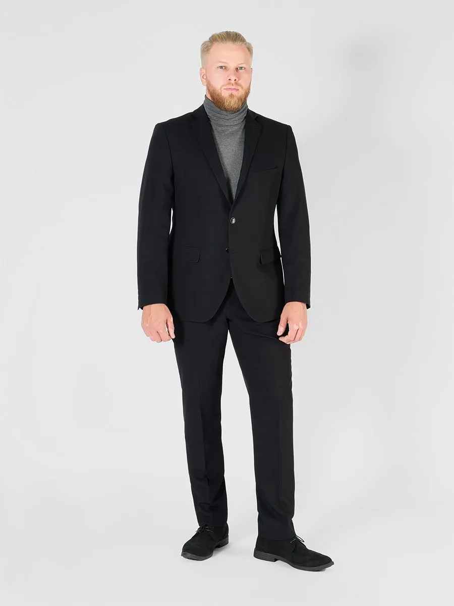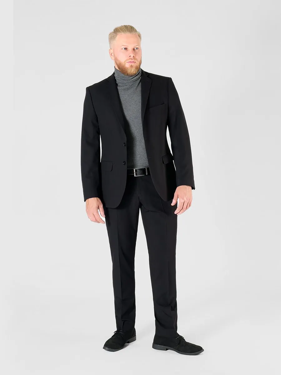Элегантный черный мужской костюм садится точно по фигуре, благодаря приталенному силуэту пиджака и зауженным брюкам. Костюм выглядит современно и модно, особенно в не самом классическом сочетании с водолазкой, например, SW23W001, джемпером или лонгсливом. Брюки выполнены в модели на резинке, что позволяет носить их без ремня и ощущать больше комфорта, но в то же время есть шлевки для ремня. Такой костюм будет отлично смотреться на самых торжественных мероприятиях в сочетании с сорочкой и бабочкой, так и в деловые будни в более расслабленном образе.
