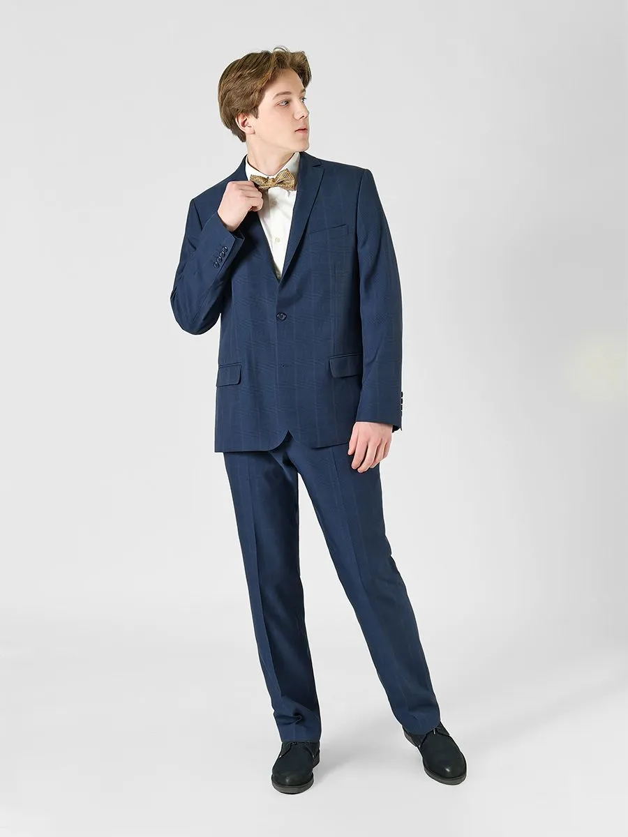 Мужской костюм выполнен в классическом силуэте, что означает прямой крой пиджака и наибольшую свободу по талии среди других силуэтов. Для брюк была использована одна из самых популярных моделей брюк П-263. Данная модель обладает прямым силуэтом и лишь слегка заужается к низу. У ткани костюма сложный составной рисунок в виде клетки, при этом линии, которые ее образуют имеют разные цвета, толщину и компоновку. Небольшой контраст задают полупрозрачные бежевые линии, именно к ним можно подобрать аксессуар в виде галстука или золотистой бабочки (158165-6), как в данном случае.