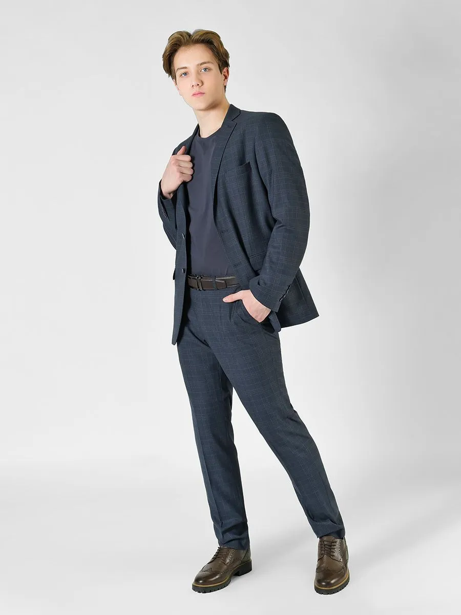 Мужской костюм выполнен в приталенном силуэте, что означает плотное прилегание в области талии. Костюм изготовлен из красивой ткани с рисунком в виде сложной клетки. Клетка образована пересечением линий различных цветов: бордового, приглушенного голубого, темно-синего, черного. Такой набор цветов образует единый сложный оттенок серо-синего цвета. Брюки, входящие в костюм, имеют зауженный силуэт.