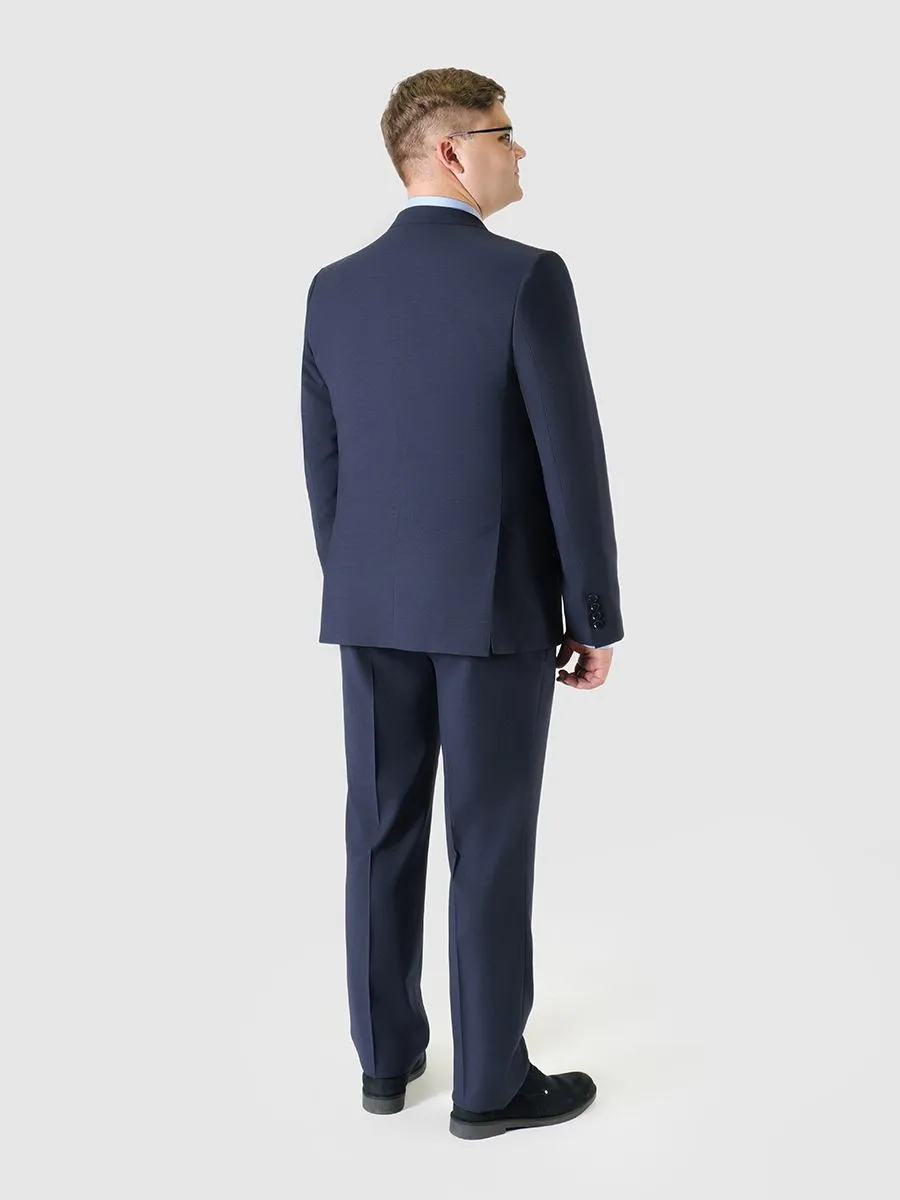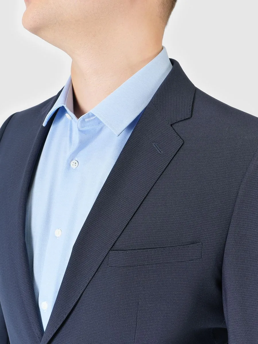 Полуприлегающий мужской костюм Peplos синего цвета с фактурным рисунком в мелкую клетку порадует даже самого требовательного мужчину. Силуэт костюма характеризуется более мягким прилеганием по линии груди, чем в приталенном варианте, неплотным прилеганием в области талии и бёдер, спокойным расширением книзу. Полуприлегающий силуэт повторяет очертания фигуры, но полностью не выявляет её. Пиджак оснащен боковыми карманами с клапанами, а также нагрудным и внутренными карманами. Изящность костюму придает контрастная декоративная обтачка внутренних карманов. Материал изделия отлично хранит тепло, практически не мнется и износостойкий. Модель брюк имеет приятную особенность - пояс на резинке. Резинка дает удобство и комфорт при носке брюк, но при этом на поясе есть шлевки для ремня. Костюм идеально подойдет современному мужчине как для деловых всреч, так и для торжественных мероприятий.