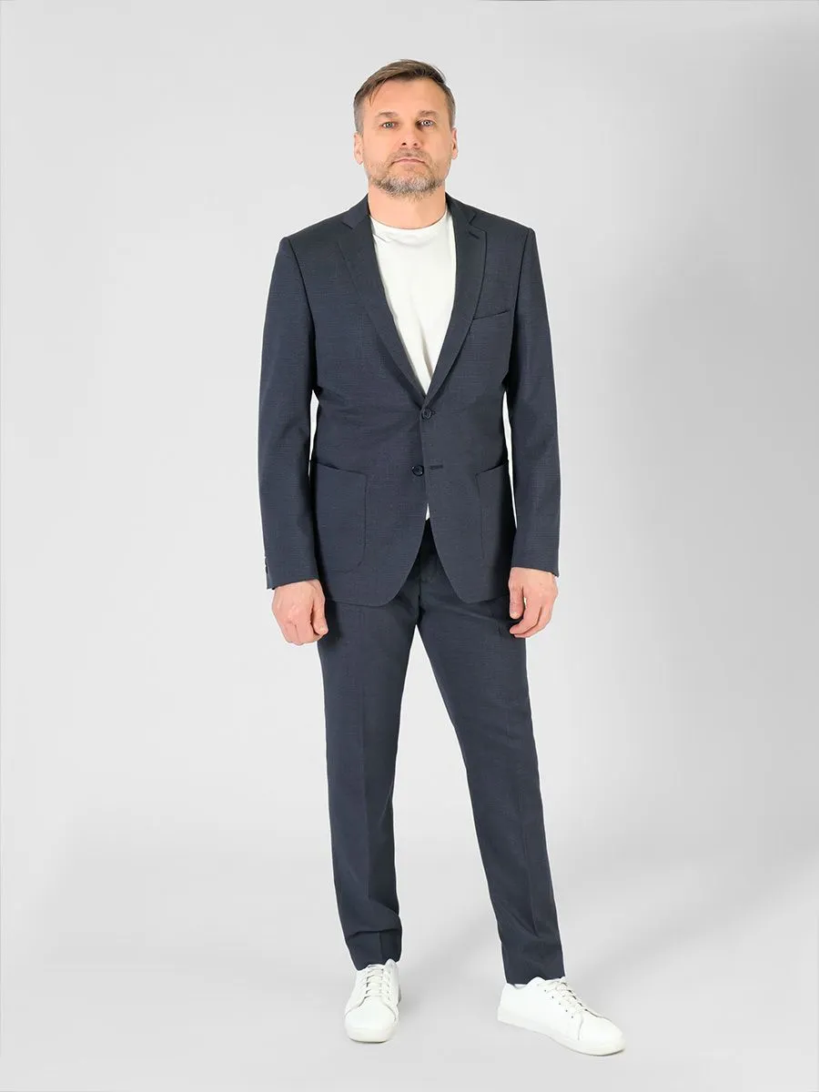Костюм от Peplos в приталенном силуэте подойдет и для ежедневной носки, и для более важных мероприятий. Модель пиджака выглядит чуть более расслаблено за счет накладных карманов. Брюки имеют резинку на поясе, что позволяет носить их без ремня. В сочетании с футболкой молочного цвета TS23103 получается образ в стиле Smart Casual, но если за основу взять сорочку, то образ станет деловым.