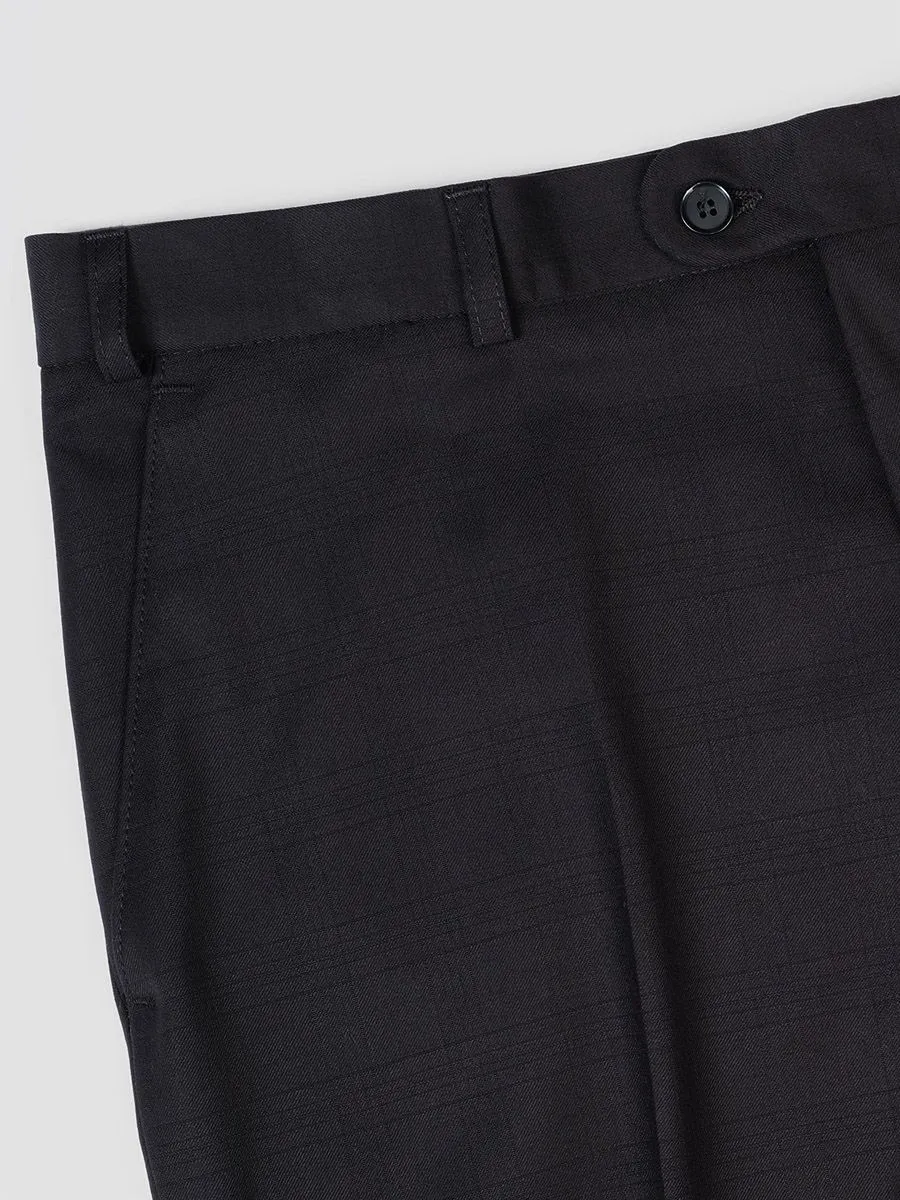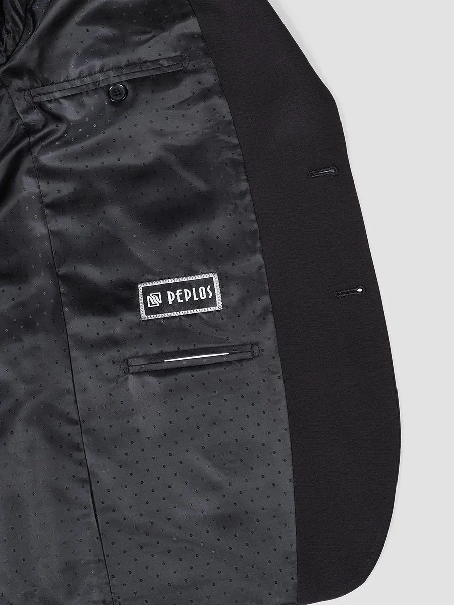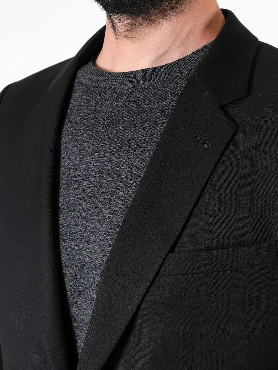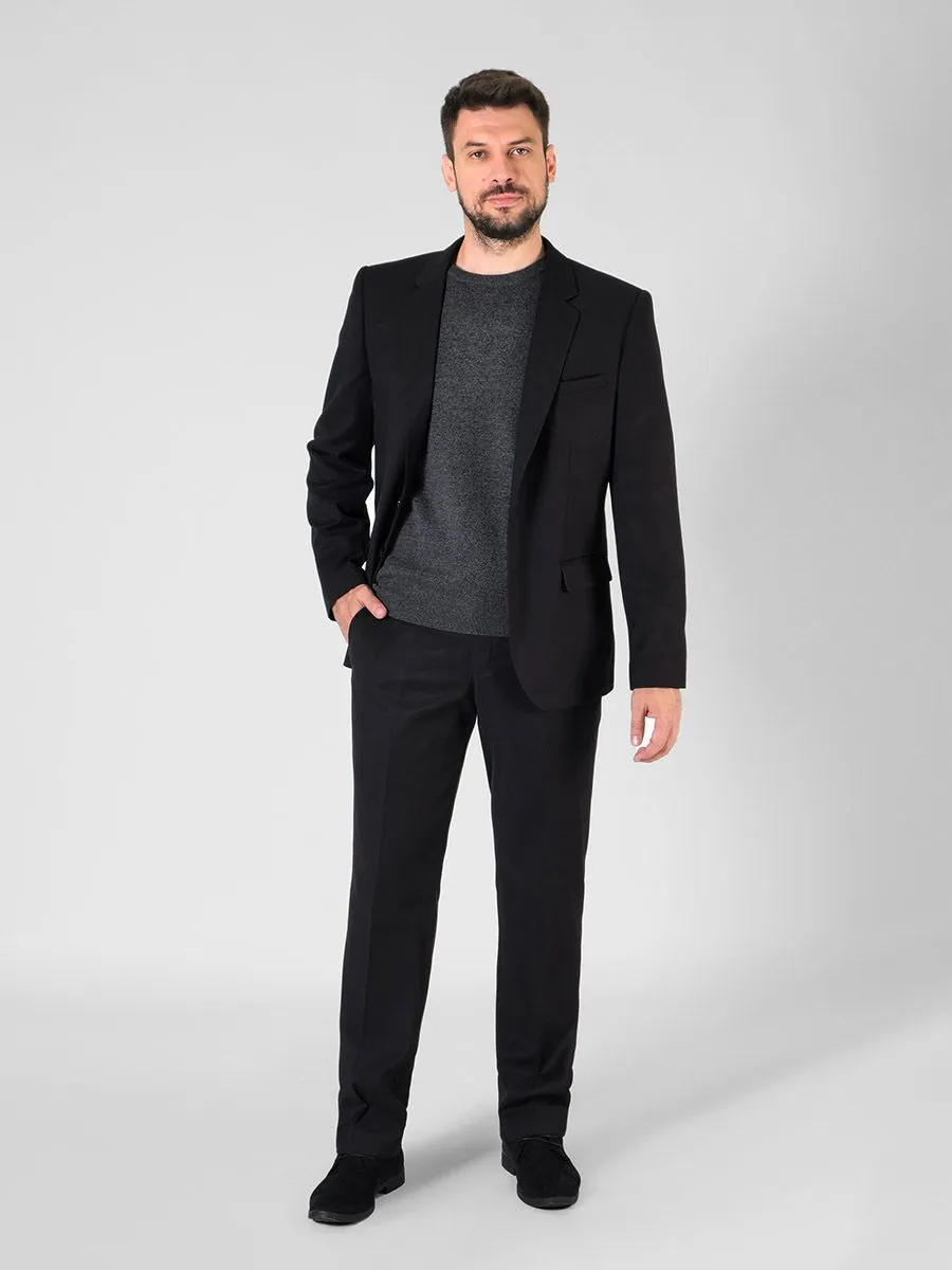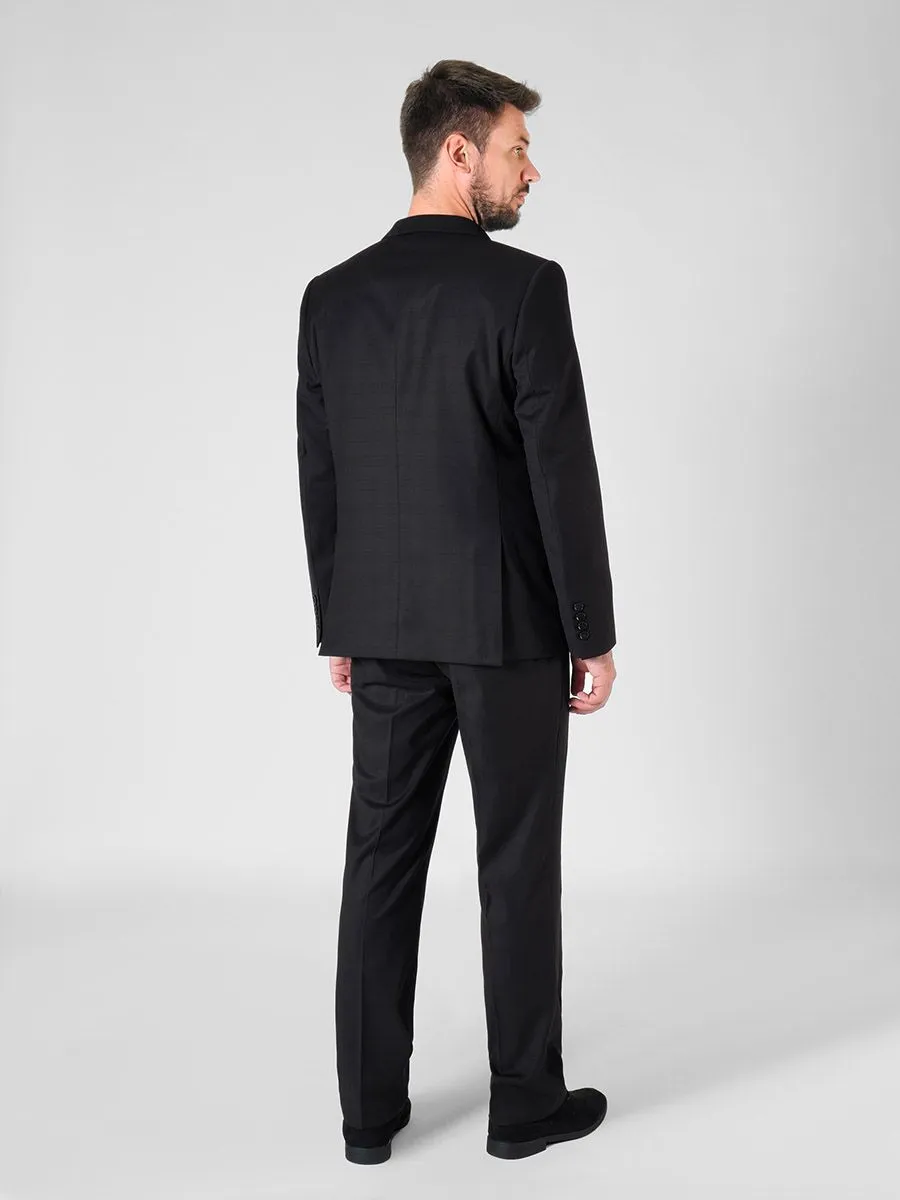 Черный мужской костюм всегда будет актуален. Данная модель привлекает внимание своим рисунком в виде неконтрастной клетки. Точнее клетка черная и ее видно только при ближайшем рассмотрении, но фактуру, которую создает рисунок, идно и с более дальнего расстояния. Силуэт у пиджака полуприлегающий, а брюки прямые, поэтому костюм сядет на многие типы фигур. Для более худых мужчин костюм есть в приталенном силуэте SU24001-SL.