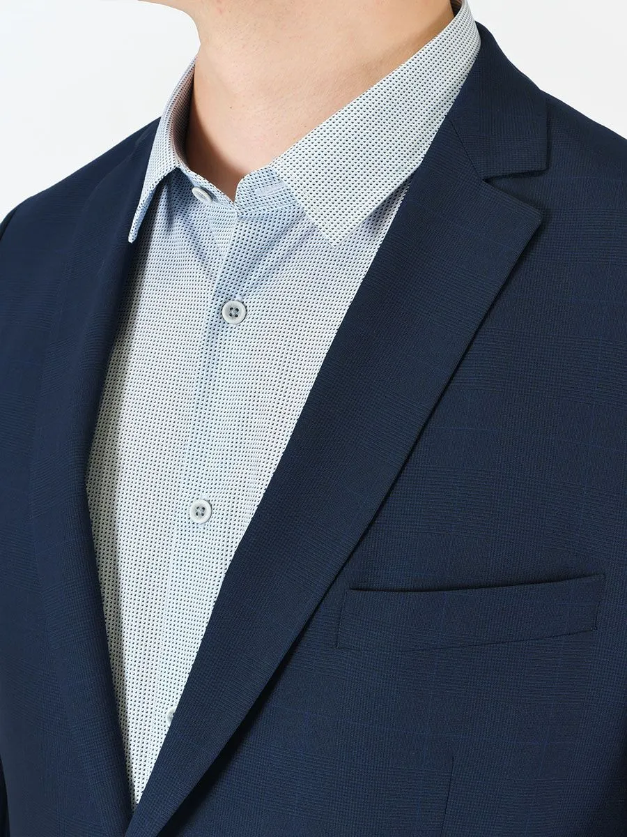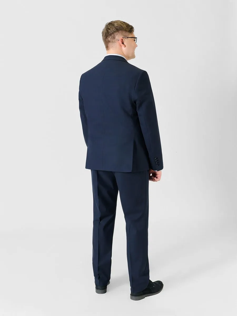 Данный костюм темно-синего цвета подойдет для многих поводов. С одной стороны, строгий классический синий цвет, который принято использовать для деловых встреч. С другой стороны, неконтрастная клетка, которая едва заметна, но при этом выгодно подчеркнет индивидуальность владельца и позволит использовать костюм при более торжественном случае. Силуэт у пиджака и брюк прямой, что означает наибольшую свободу облегания.