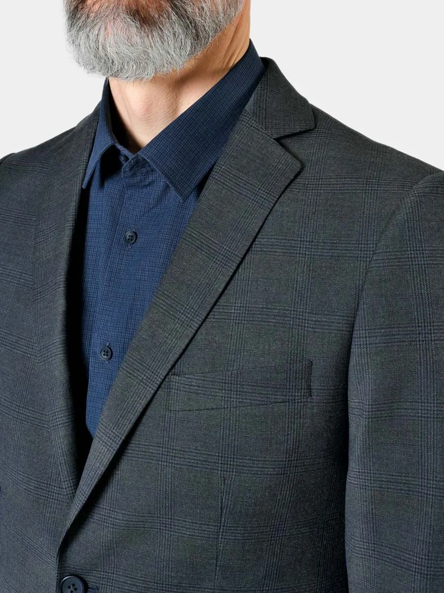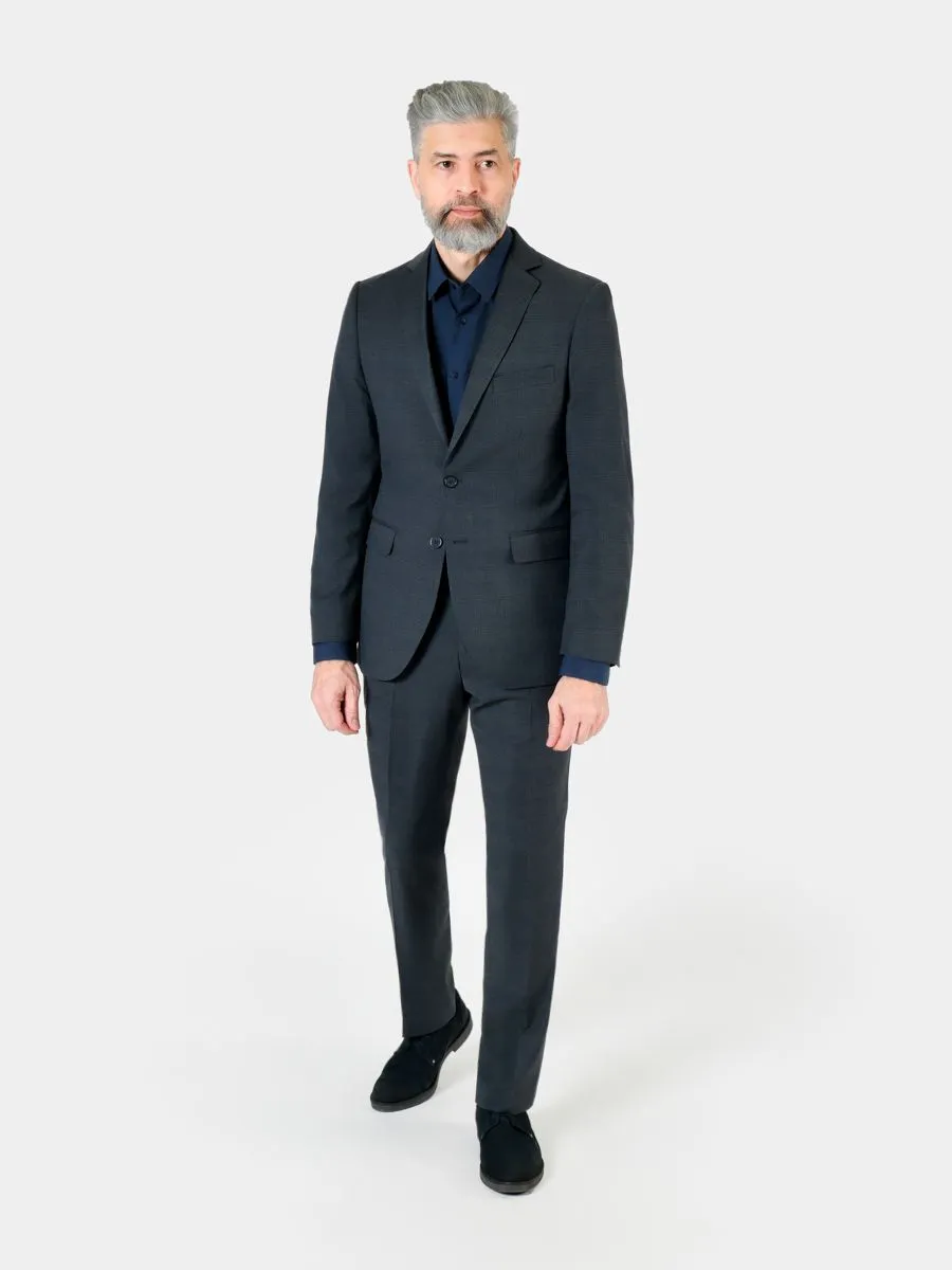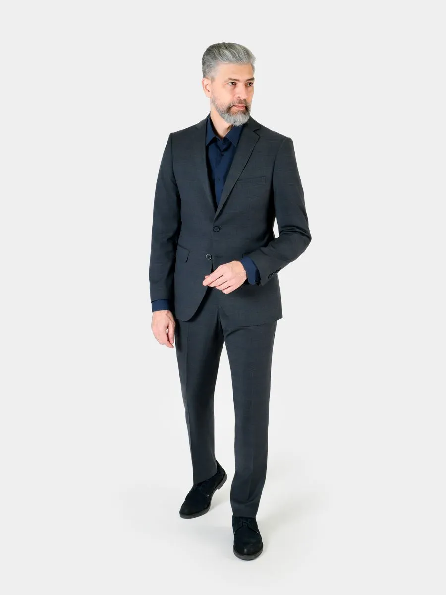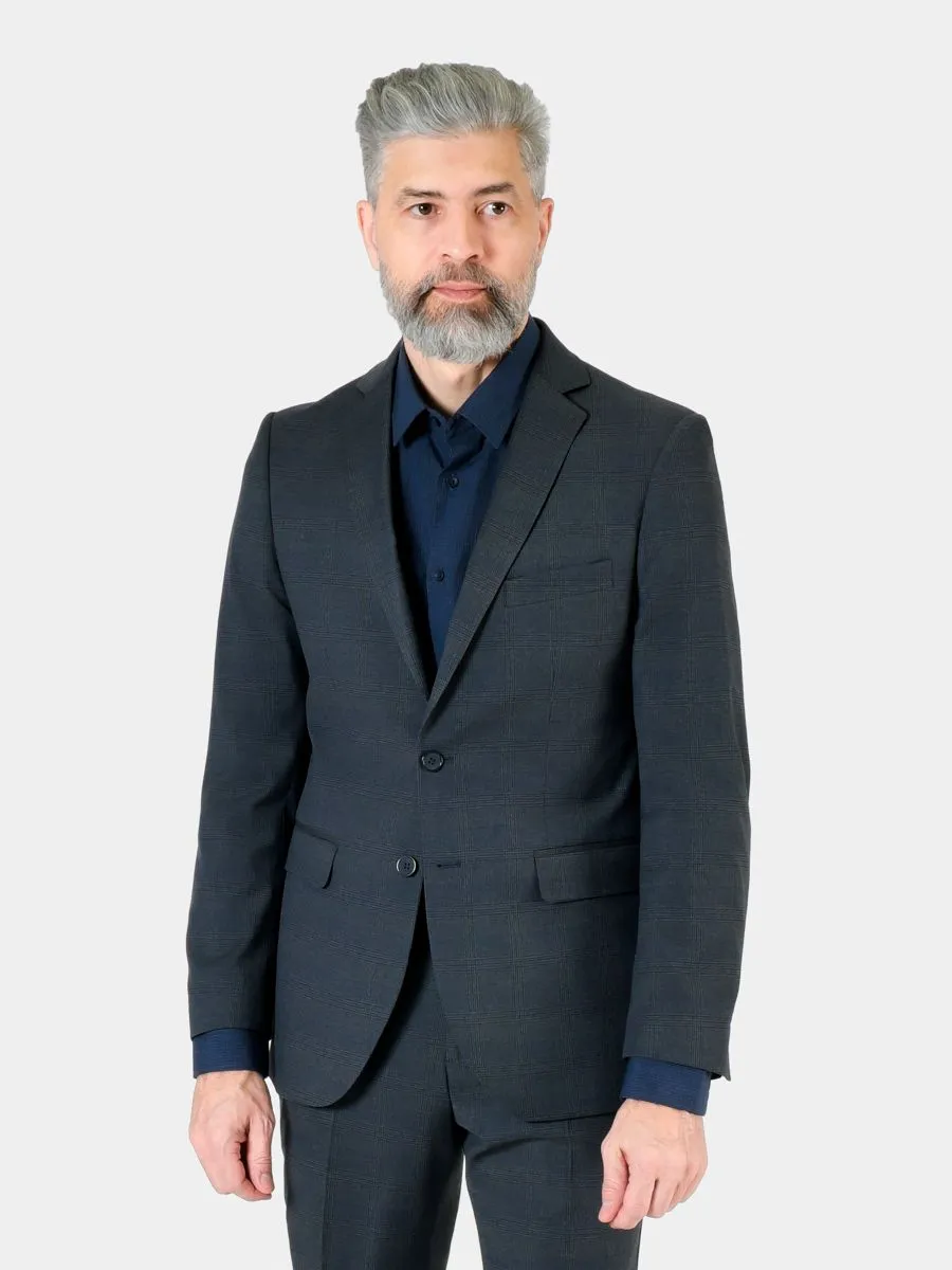Приталенный костюм подойдет высоким и подтянутым мужчинам, поскольку пиджак довольно плотно облегает фигуру. У костюма красивый темно-серый цвет с неконтрастной клеткой. Костюм можно отнести к базовой коллекции в гардеробе мужчины, но при этом клетка придает костюму больше индивидуальности, ее хочется рассмотреть поближе. И при ближайшем рассмотрении можно заметить, что клетка образована переплетениями темно-синих нитей. Поэтому костюм будет гармонично выглядеть с сорочкой темно-синего цвета.