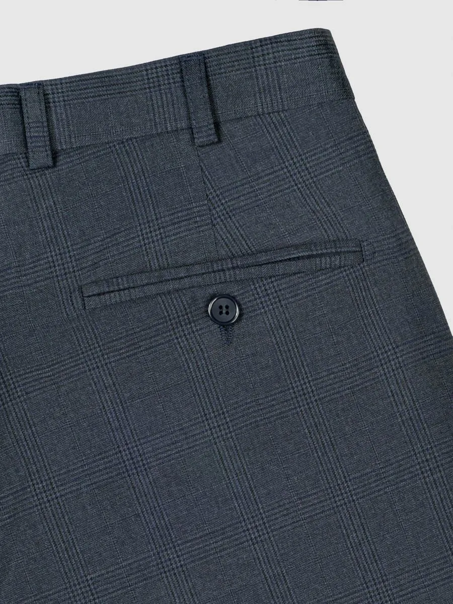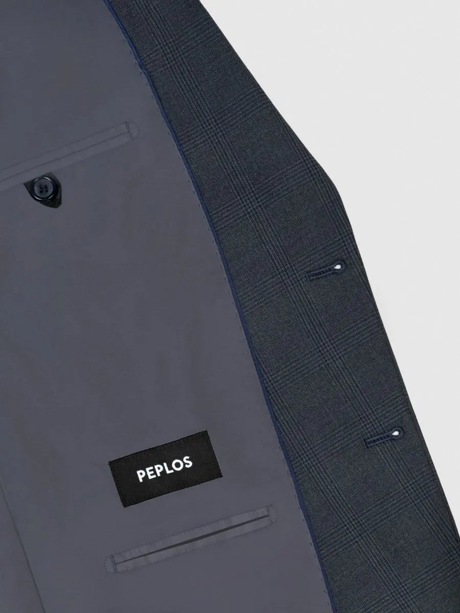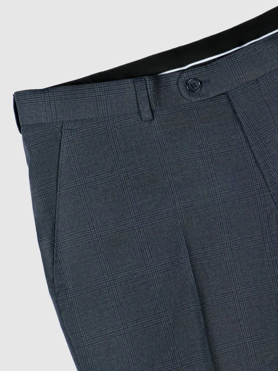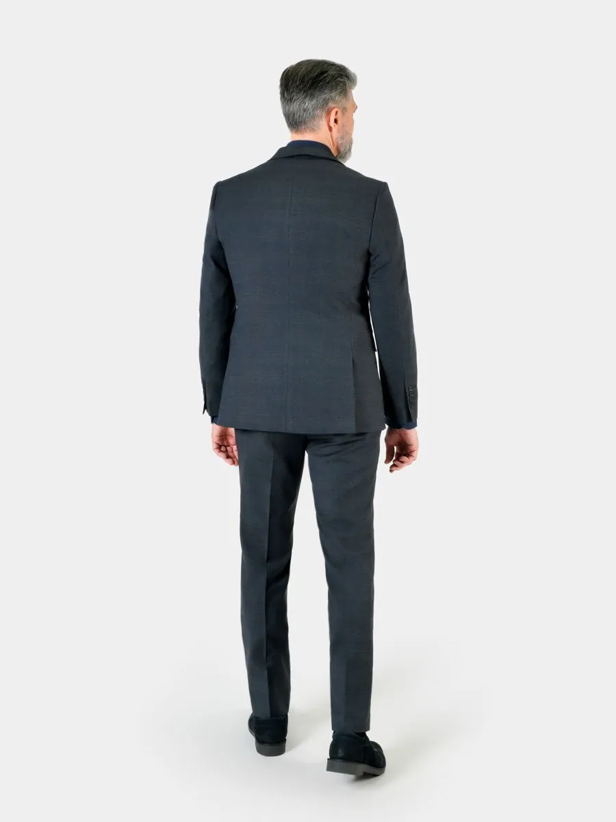 Приталенный костюм подойдет высоким и подтянутым мужчинам, поскольку пиджак довольно плотно облегает фигуру. У костюма красивый темно-серый цвет с неконтрастной клеткой. Костюм можно отнести к базовой коллекции в гардеробе мужчины, но при этом клетка придает костюму больше индивидуальности, ее хочется рассмотреть поближе. И при ближайшем рассмотрении можно заметить, что клетка образована переплетениями темно-синих нитей. Поэтому костюм будет гармонично выглядеть с сорочкой темно-синего цвета.