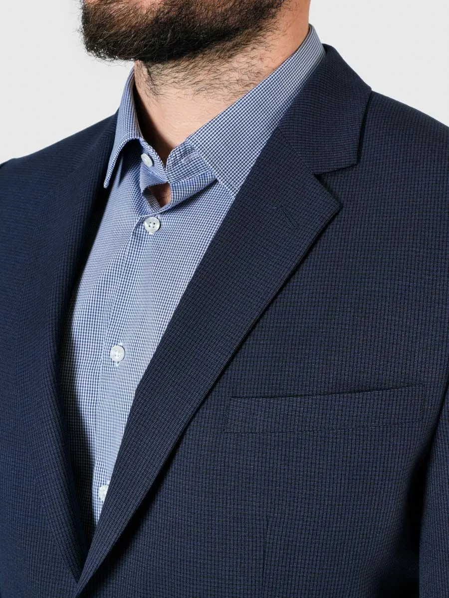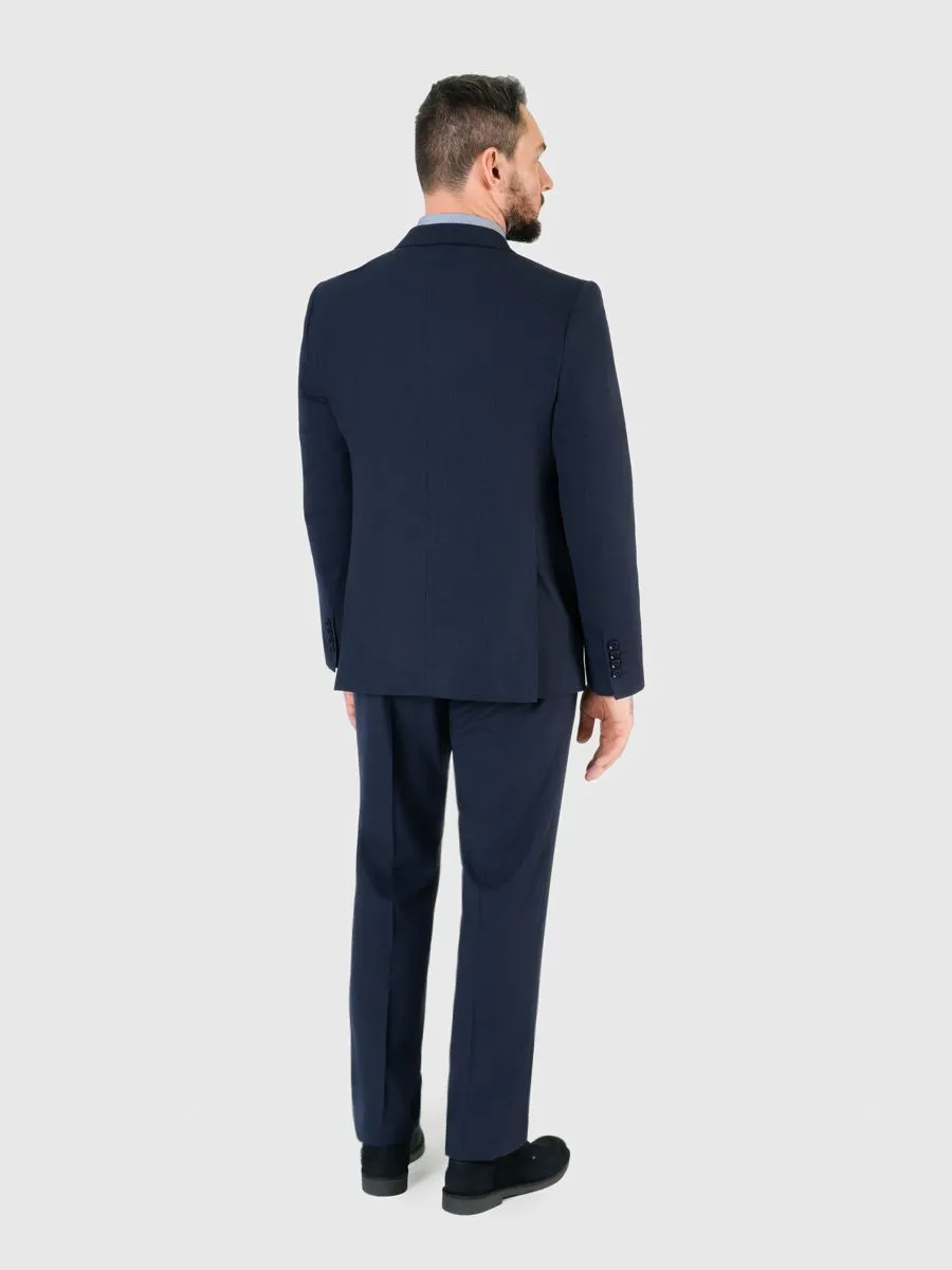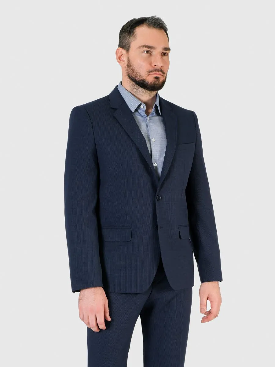 Основой делового гардероба мужчины является темно-синий костюм. Цвет практичен, легко сочетается с другими оттенками, не надоедает глазам, символизирует собой стабильность и надежность. При этом едва заметный микродизайн придает костюму фактурности и индивидуальности. Все элементы костюма классические - на пиджаке два накладных кармана с клапанами, два внутренних кармана, центральная застежка на две пуговицы, полный подклад. Брюки имеют прямой силуэт, два глубоких боковых кармана, частичный подклад.