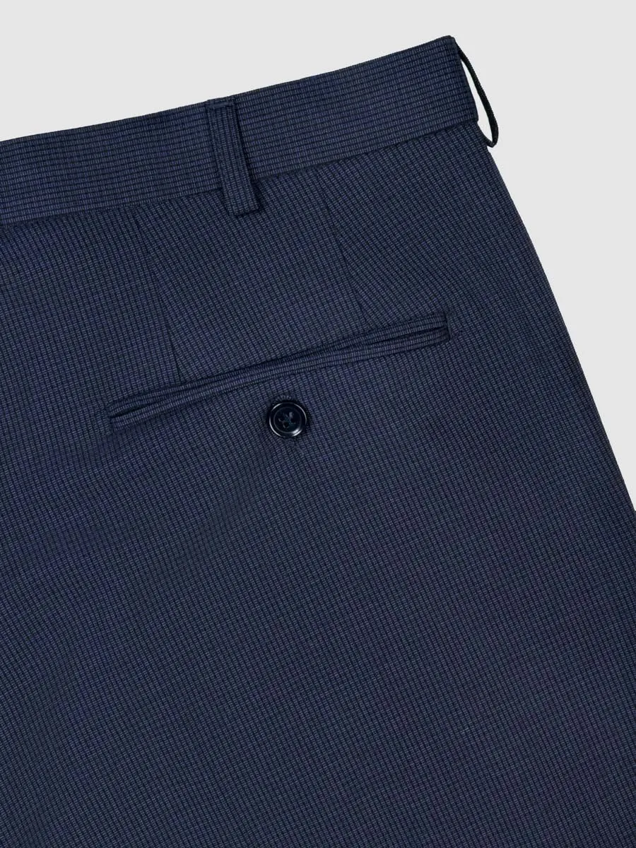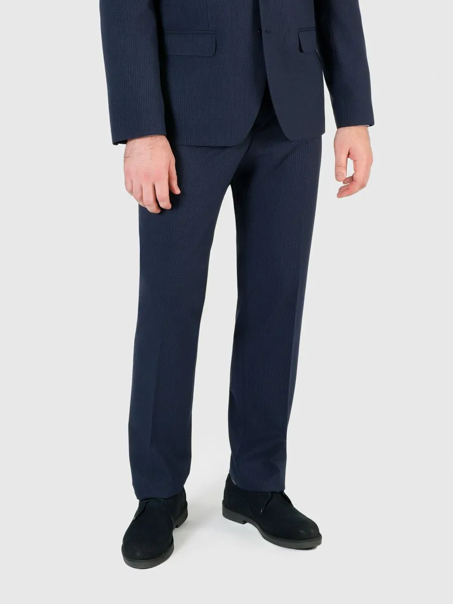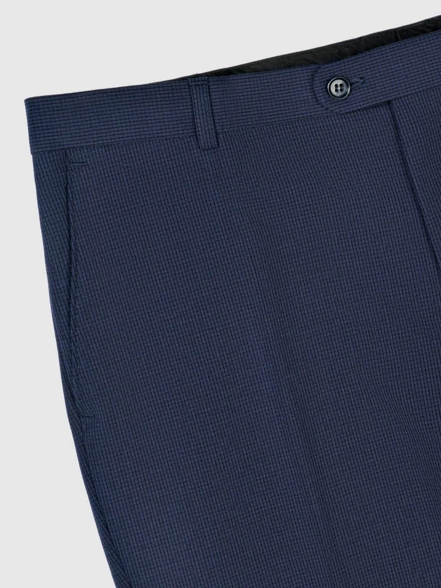 Основой делового гардероба мужчины является темно-синий костюм. Цвет практичен, легко сочетается с другими оттенками, не надоедает глазам, символизирует собой стабильность и надежность. При этом едва заметный микродизайн придает костюму фактурности и индивидуальности. Все элементы костюма классические - на пиджаке два накладных кармана с клапанами, два внутренних кармана, центральная застежка на две пуговицы, полный подклад. Брюки имеют прямой силуэт, два глубоких боковых кармана, частичный подклад.