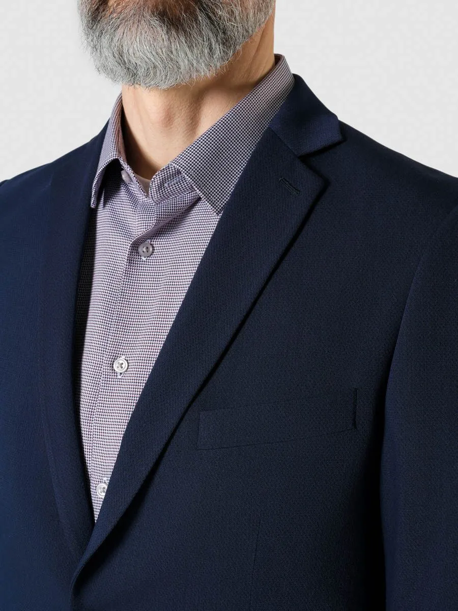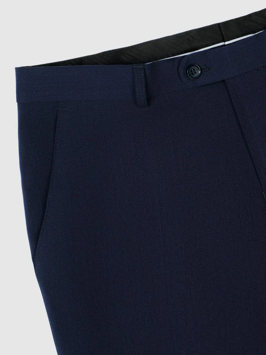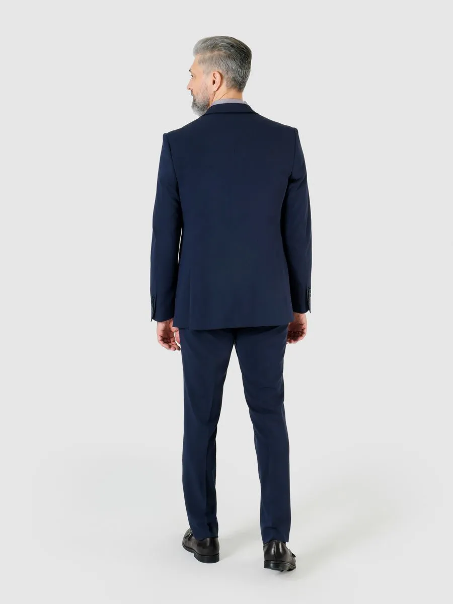 Костюм мужской выполнен в темно-синем цвете в приталенном силуэте. Пиджак оснащен боковыми прорезными карманами с листочкой. На рукавах есть шлицы с четырьмя отделочными петлями и четырьмя пуговицами. Воротник и лацканы пиджака выполнены в отложном стиле, на левом лацкане пиджака присутствует отделочная петля для фрачника. Брюки у костюма заужены к низу, на поясе есть шлевки для ремня. Такой костюм подойдет как для офиса, так и для торжественных мероприятий. Он идеально подчеркнет стройную фигуру и стиль владельца. Кроме того, темно-синий цвет всегда актуален и легко комбинируется с различными оттенками сорочек и галстуков. Этот костюм обязательно станет ключевым элементом гардероба мужчины, который ценит качество и стиль.
