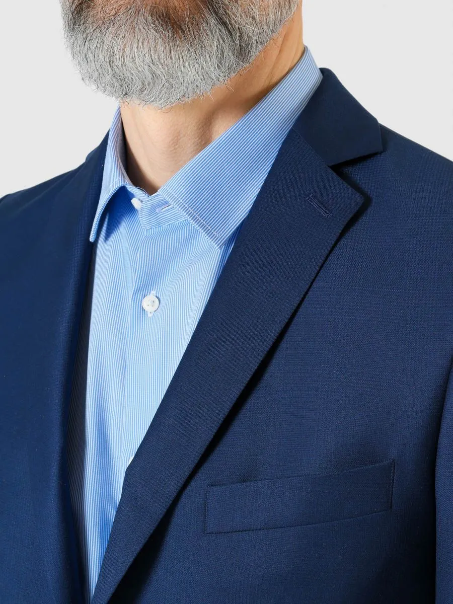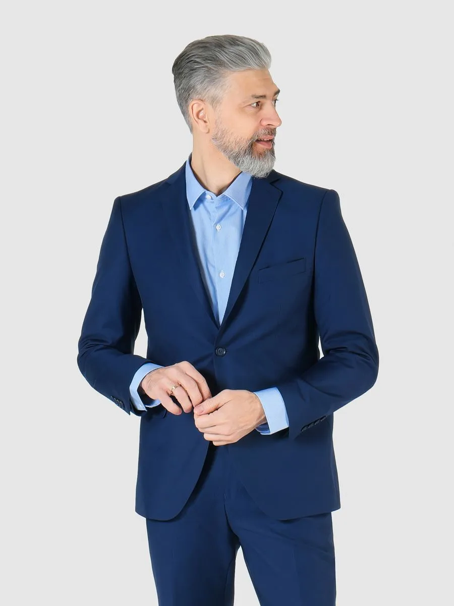 Приталенный костюм идеально сядет на фигуру стройного мужчины и будет выглядеть как "с иголочки". Костюм подойдет тем, кто устал от мрачных будней и хочет привнести красочности в повседневный гардероб, поскольку цвет костюма ярче классических темно-синих оттенков и есть рисунок в виде неконтрастной клетки. В остальном костюм имеет все классические элементы, только силуэт более современный зауженный. Подклад костюма имеет еще более светлую контрастную отделку кармана и борта. В таком костюме можно смело идти на торжественное мероприятие и быть уверенным в своем безупречном виде.