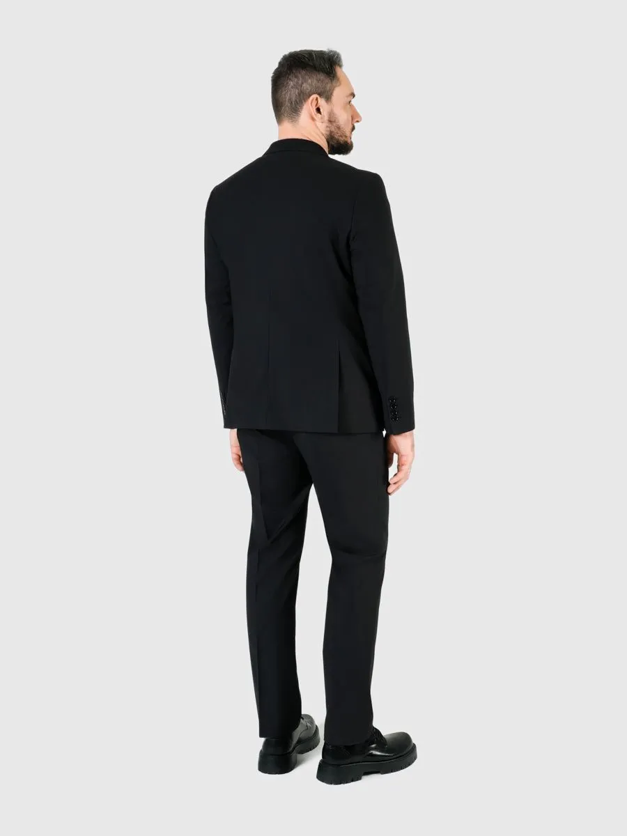 Классика на все времена- черный костюм в полуприлегающем силуэте. В этом сезоне черный цвет обрел новое дыхание и стал трендом. С таким костюмом можно создать самый торжественный образ с белой сорочкой и черной бабочкой, так и более современный, дерзкий с базовой футболкой или лонгсливом черного цвета. Полуприлегающий силуэт пиджака, прямой силуэт брюк и спандекс, входящий в состав ткани, делают движения в костюме максимально комфортными, не стягивают тело. Выбрав черный костюм, вы приобретете несколько образов для любого события.