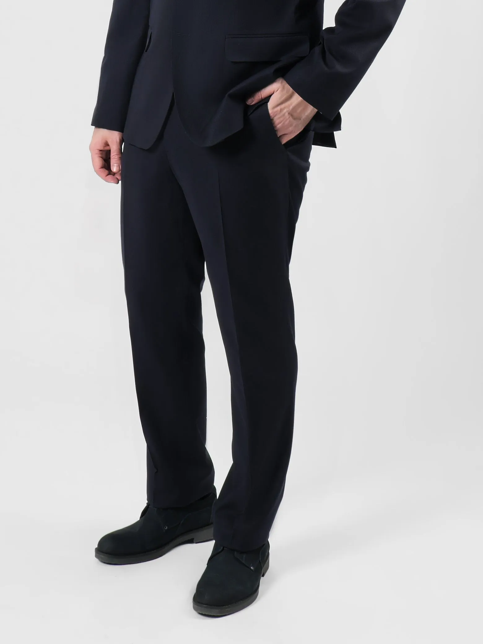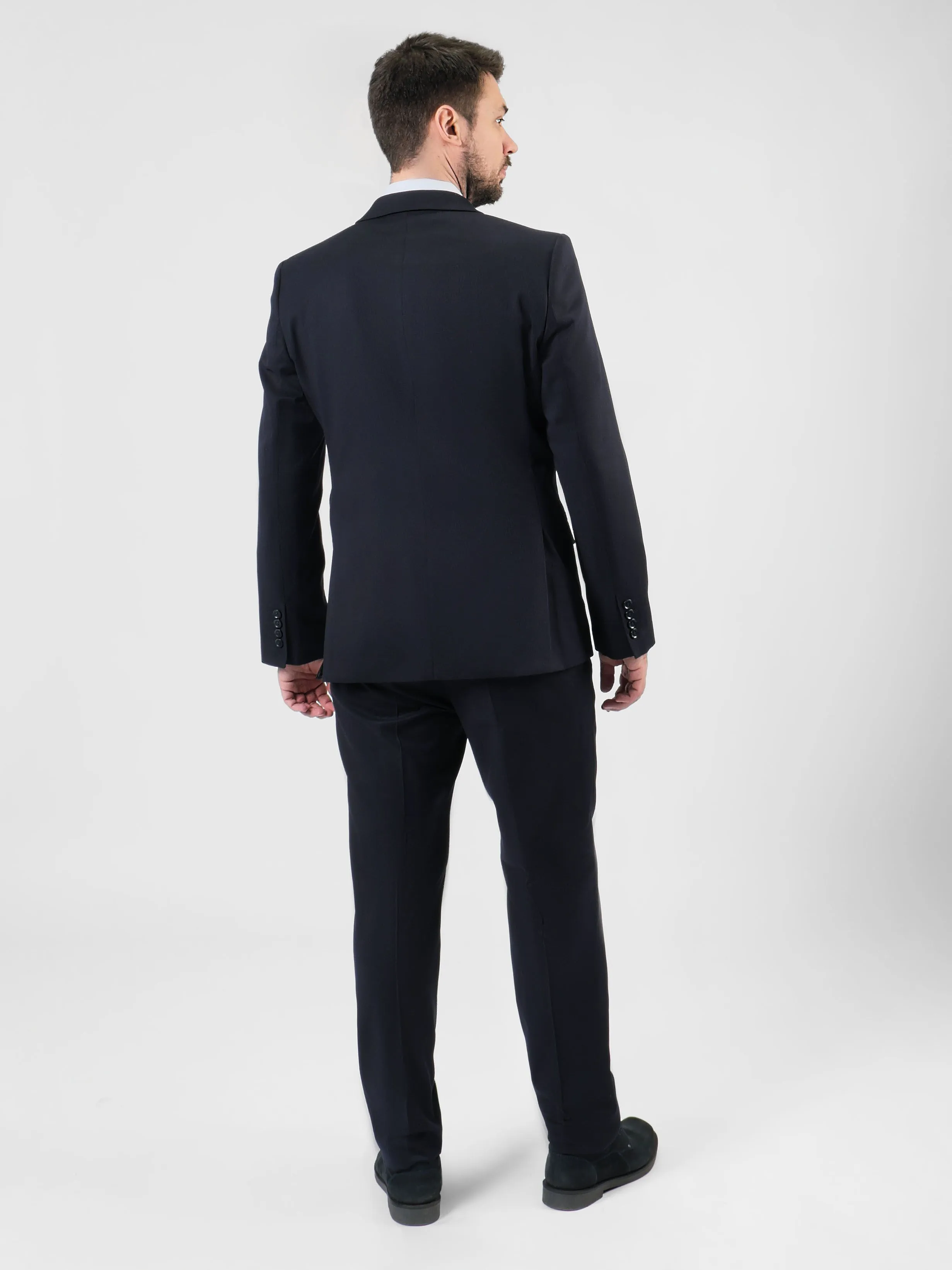 Полуприлегающий силуэт сочетает в себе элементы классического и приталенного стилей. Он слегка облегает фигуру, но не так сильно, как приталенный. Пиджак имеет более узкие линии по сравнению с классическим, подчеркивая форму тела, но не стягивая её. Брюки могут быть как прямыми, так и слегка зауженными, что создает более современный вид.