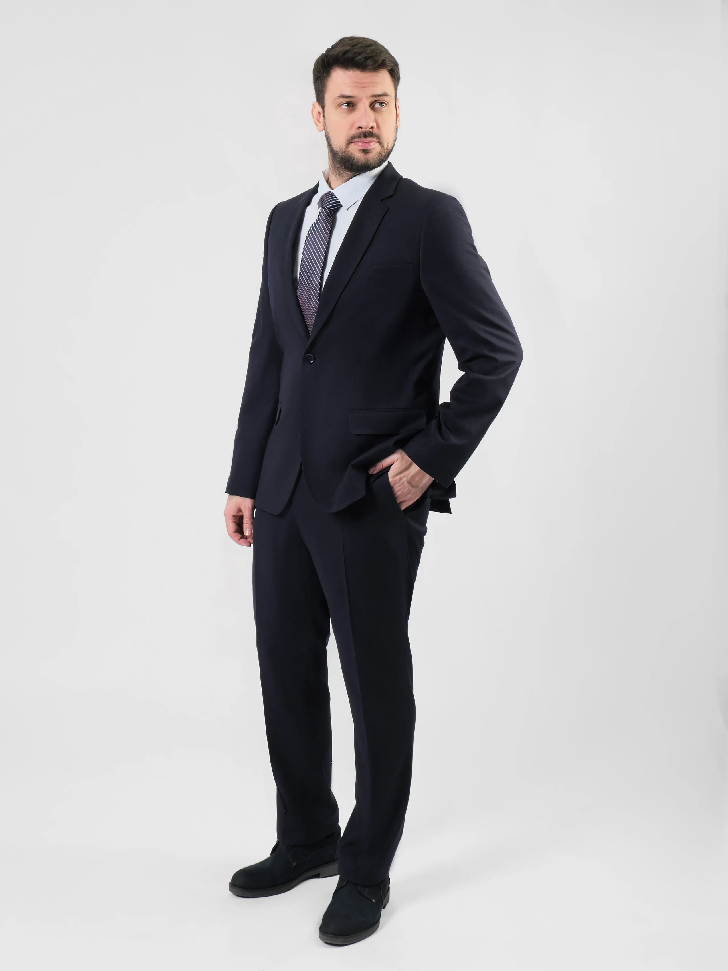 Классический силуэт костюма имеет свободный и расслабленный крой. Он не облегает тело, позволяя свободное движение и комфорт. Пиджак имеет более широкие плечи, что создает сбалансированный вид. Брюки обычно прямые, без излишней утяжки. Этот стиль подходит для различных случаев, включая деловые встречи и торжественные мероприятия.