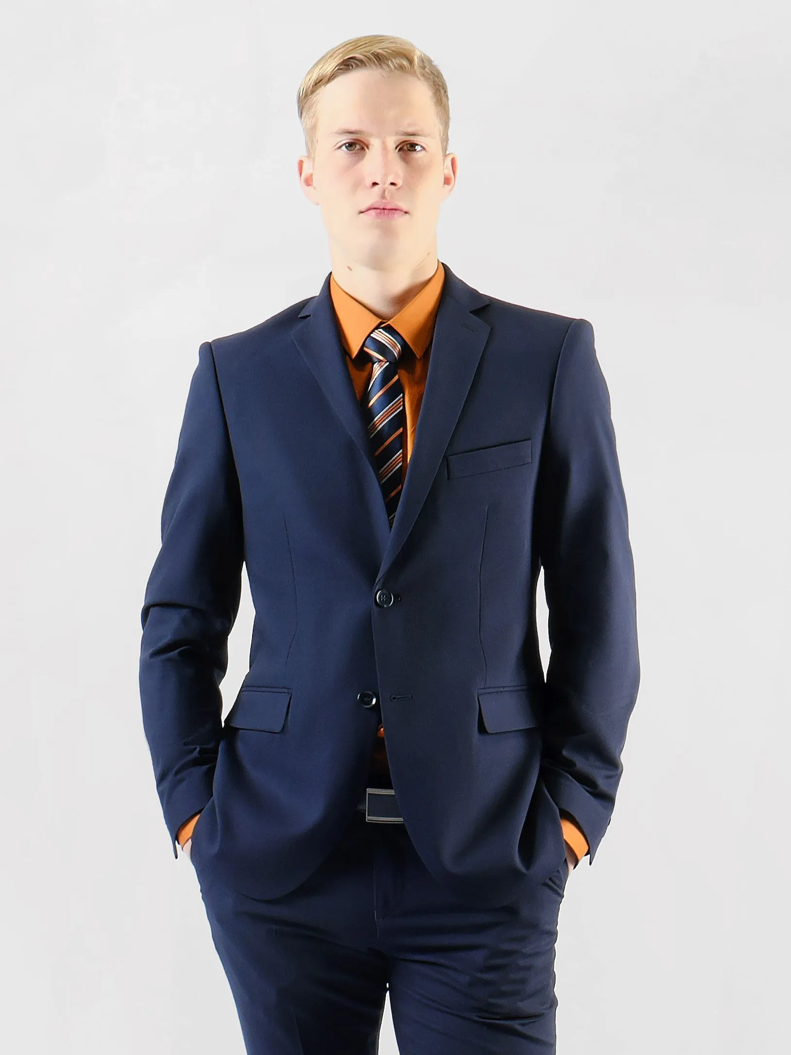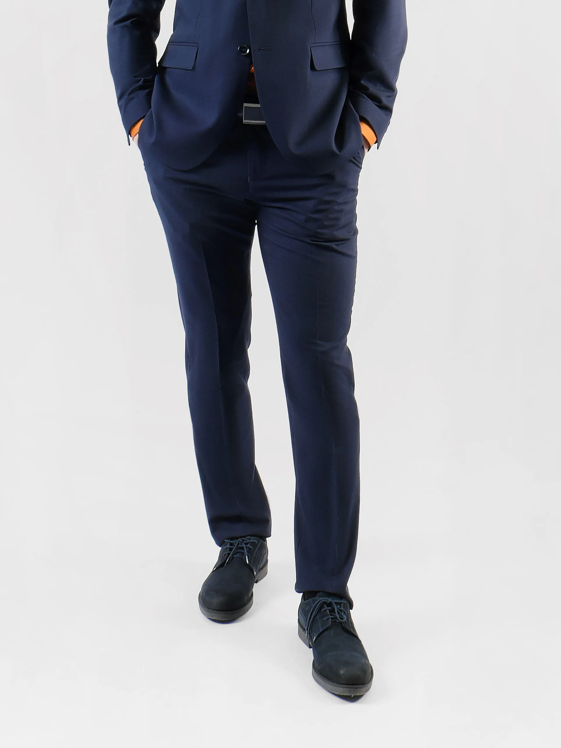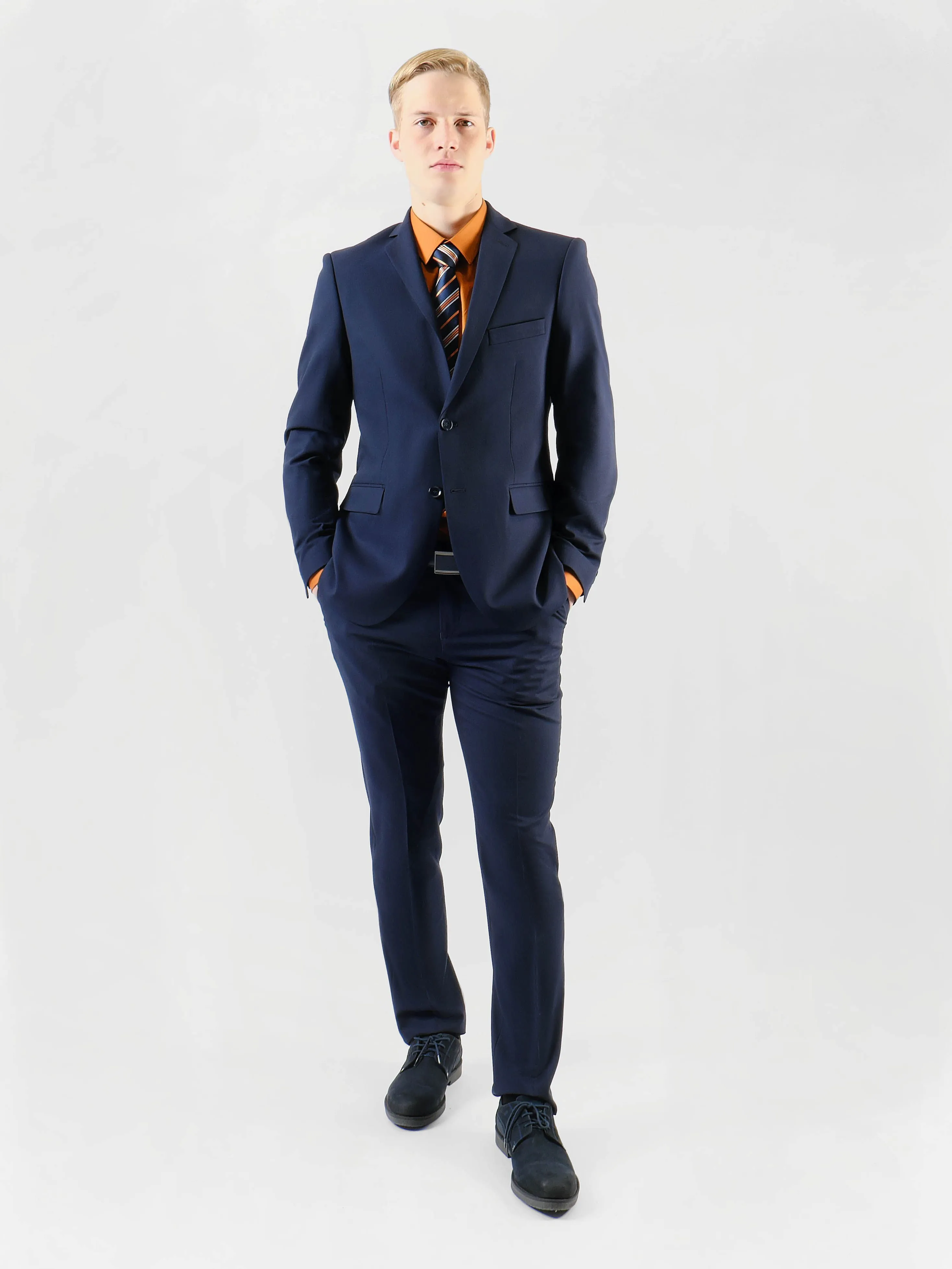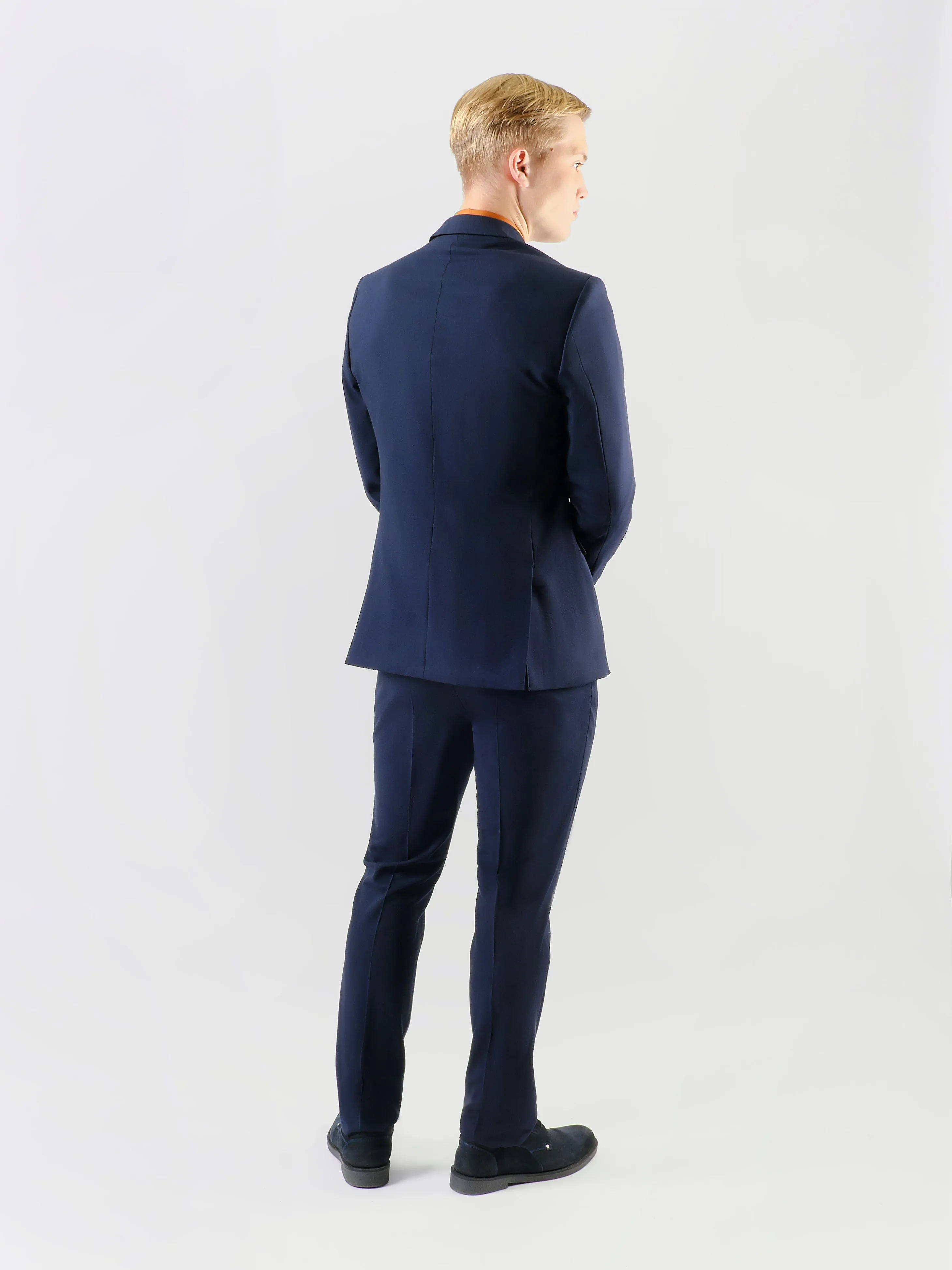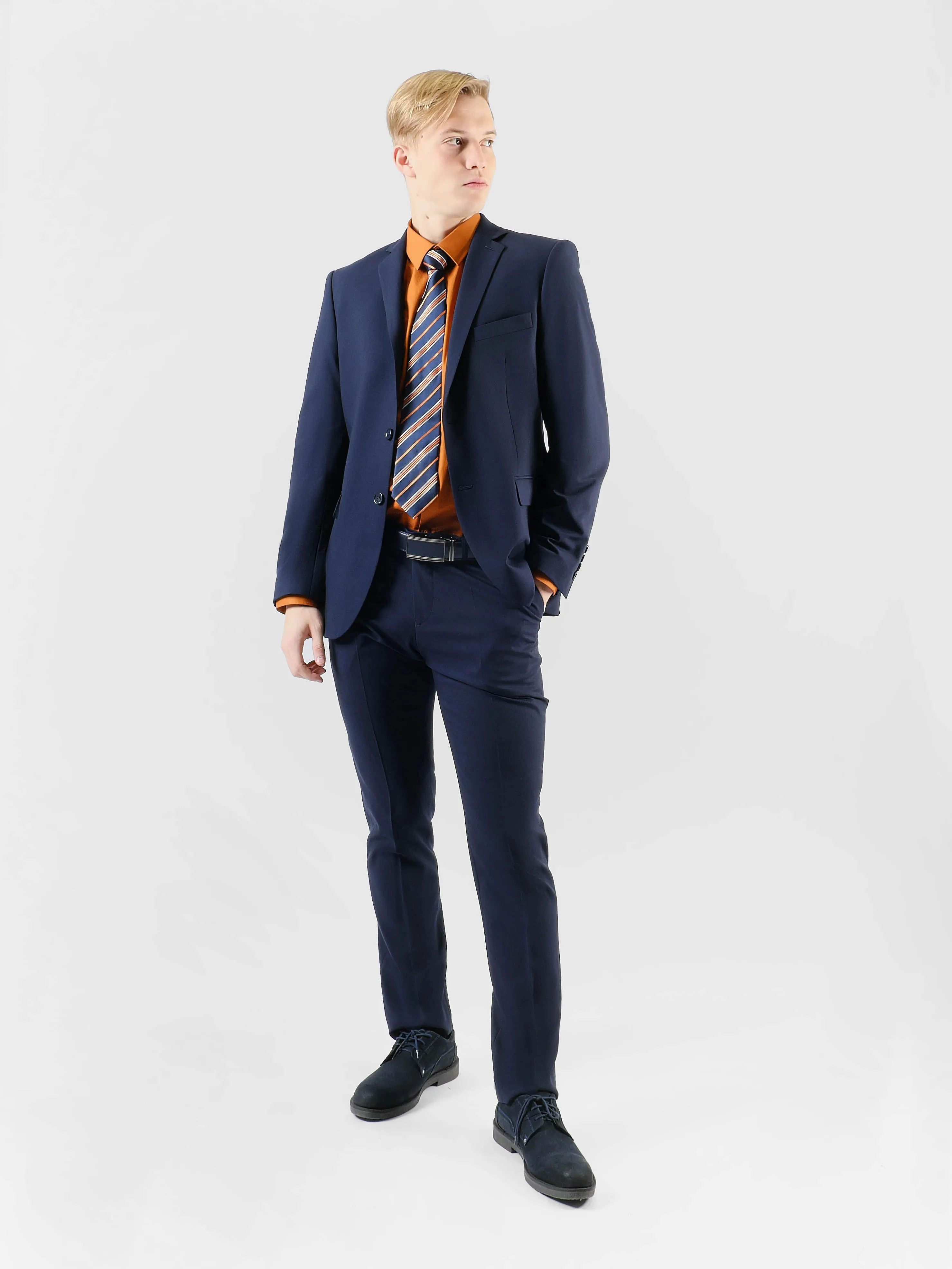 Темно-синий мужской костюм, выполненный в приталенном силуэте, идеально подходит для любого торжественного события или деловой встречи. Однотонная гладь ткани придаёт костюму строгий и утонченный вид, акцентируя внимание на безупречном вкусе хозяина.Петличка на лацкане добавляет стилевую изюминку, позволяя привнести немного индивидуальности с помощью аксессуаров, таких как бутоньерка или значок. Две шлицы на пиджаке обеспечивают дополнительную свободу движений, придавая образу современную невесомость.Брючины костюма аккуратно дополнены стрелками, что создаёт иллюзию удлиненных ног и добавляет ещё больше строгости общему внешнему виду. В таком костюме каждый мужчина сможет чувствовать себя уверенно и привлекательно в самых различных ситуациях, будь то вечерний прием или важная бизнес-встреча.