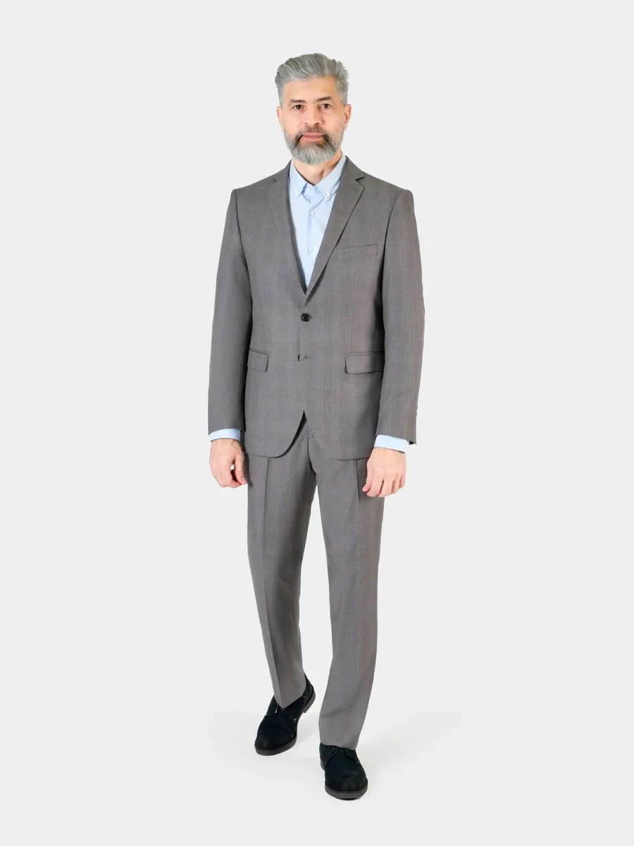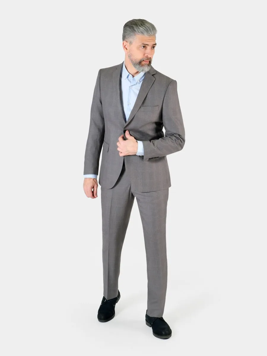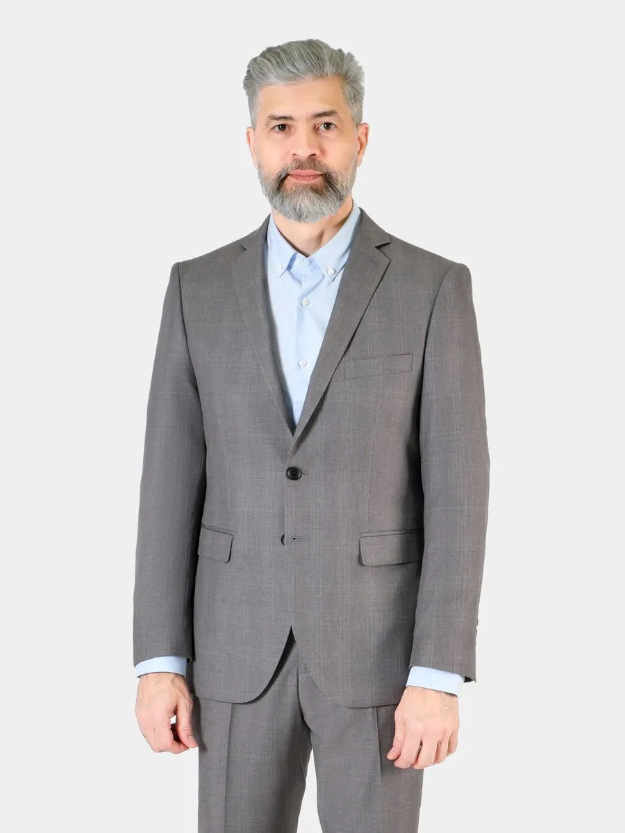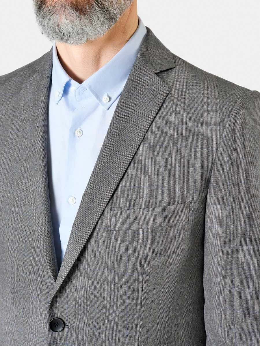 Костюм светлого оттенка всегда выглядит респектабельно, поскольку его чаще всего не используют для ежедневной носки, а приобретают для особенных событий. На светло-серой основе костюма хорошо просматривается клетка, которая имеет вкрапления синих нитей. Костюм выполнен в приталенном силуэте, поэтому подчеркивает контуры фигуры. С костюмом можно составить разнообразные образы с сорочкой, вязаным или кроенным поло, базовой футболкой.