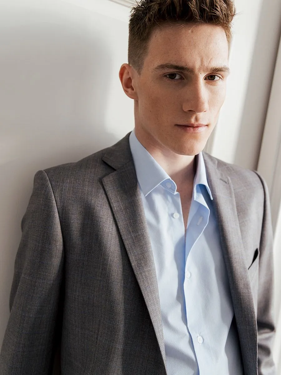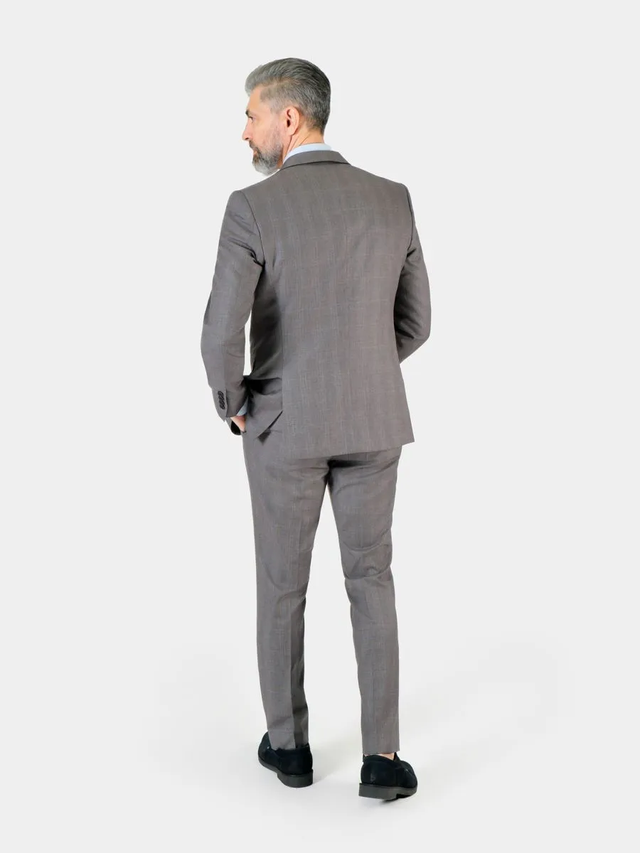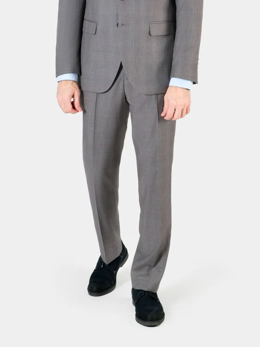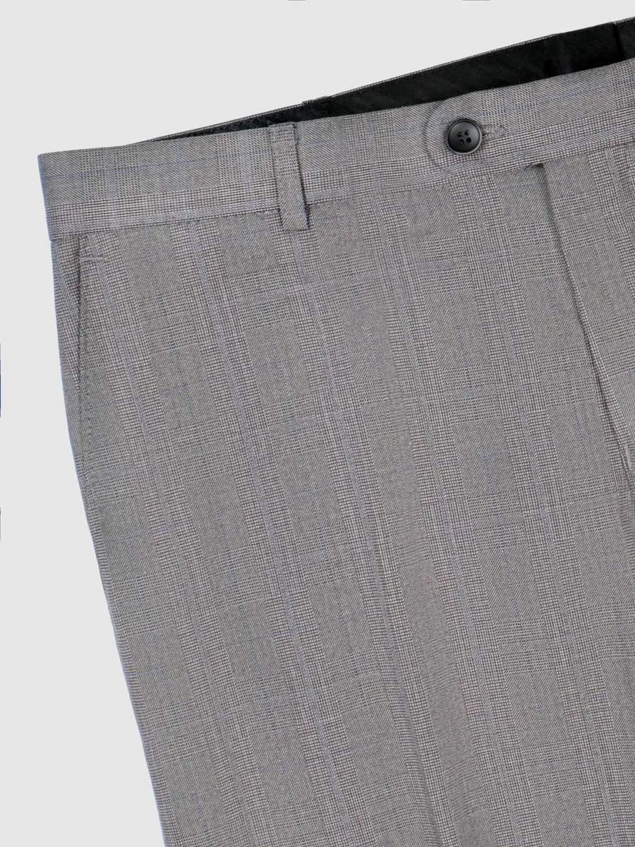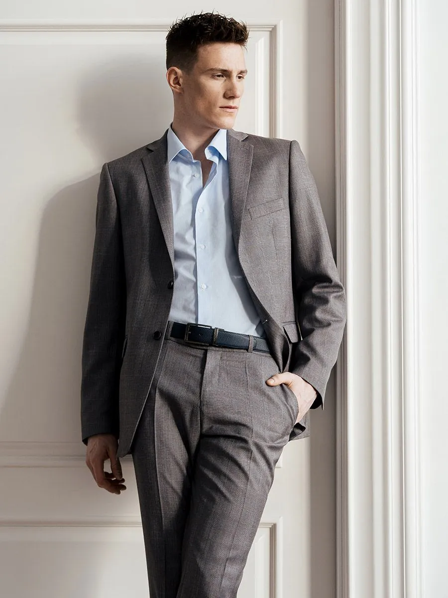 Костюм светлого оттенка всегда выглядит респектабельно, поскольку его чаще всего не используют для ежедневной носки, а приобретают для особенных событий. На светло-серой основе костюма хорошо просматривается клетка, которая имеет вкрапления синих нитей. Костюм выполнен в приталенном силуэте, поэтому подчеркивает контуры фигуры. С костюмом можно составить разнообразные образы с сорочкой, вязаным или кроенным поло, базовой футболкой.