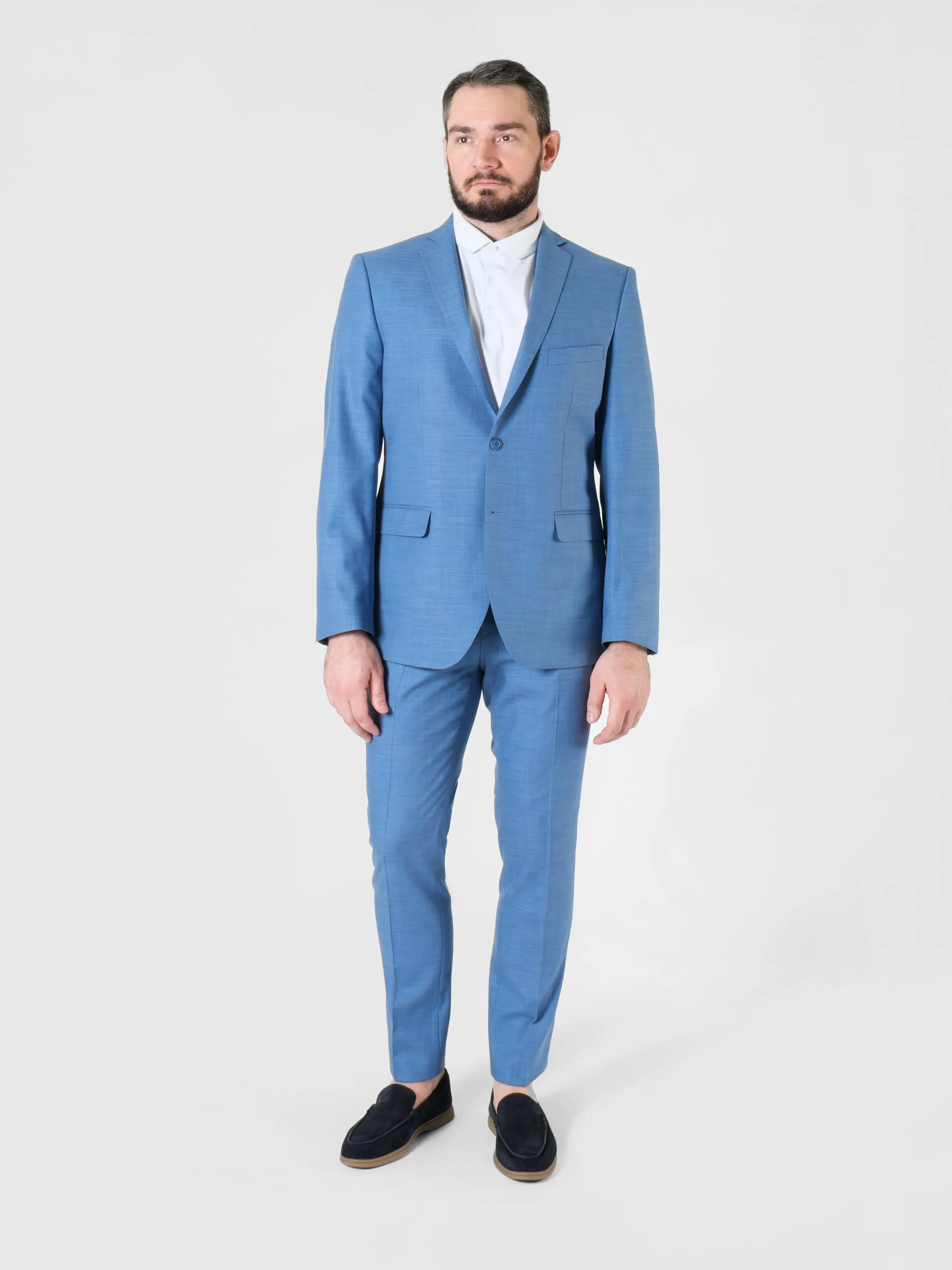 Полуприлегающий силуэт сочетает в себе элементы классического и приталенного стилей. Он слегка облегает фигуру, но не так сильно, как приталенный. Пиджак имеет более узкие линии по сравнению с классическим, подчеркивая форму тела, но не стягивая её. Брюки могут быть как прямыми, так и слегка зауженными, что создает более современный вид.
