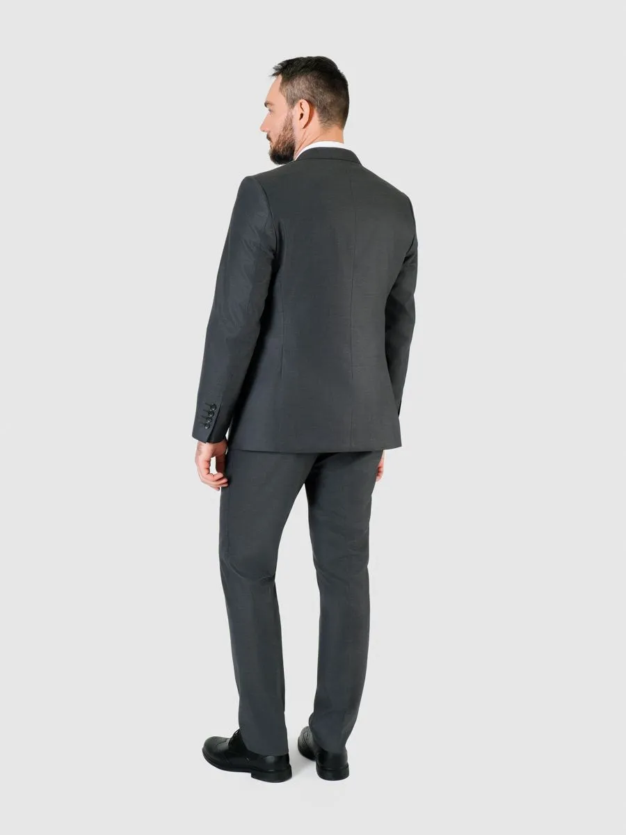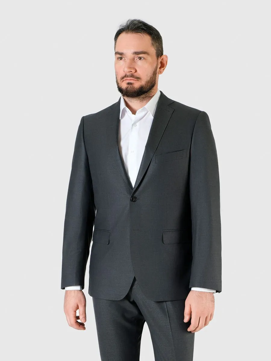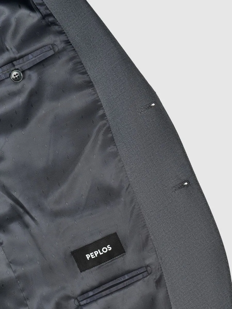Костюм от Peplos в темно-сером цвете выглядит строго и по-деловому. Издалека кажется, что костюм имеет некоторый металлический отблеск, такой эффект получается благодаря ребристой фактуре ткани. При выборе данного костюма следует обратить внимание на приталенный силуэт пиджака, который точно облегает контуры фигуры. Сочетание с сорочкой является классическим, при этом можно создать интересные образы и с джемперами тонкой вязки.