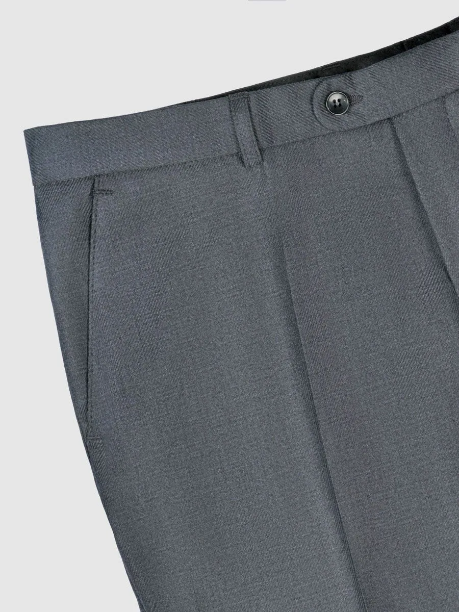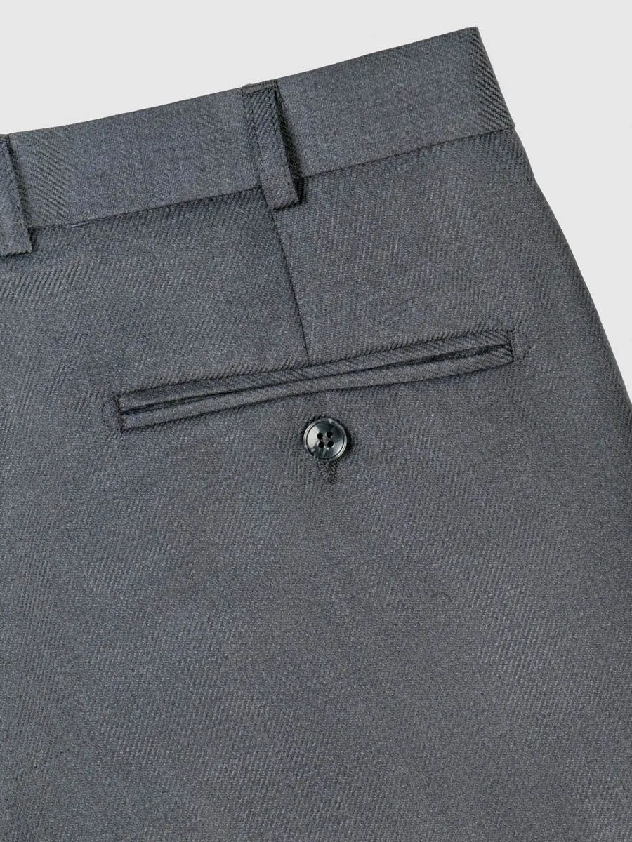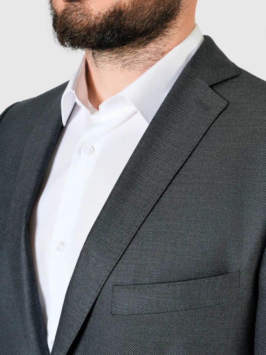 Костюм от Peplos в темно-сером цвете выглядит строго и по-деловому. Издалека кажется, что костюм имеет некоторый металлический отблеск, такой эффект получается благодаря ребристой фактуре ткани. При выборе данного костюма следует обратить внимание на приталенный силуэт пиджака, который точно облегает контуры фигуры. Сочетание с сорочкой является классическим, при этом можно создать интересные образы и с джемперами тонкой вязки.