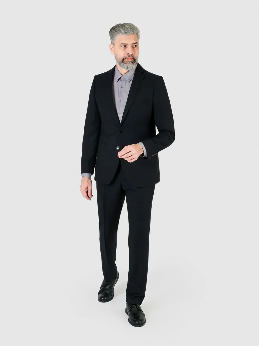 Черный костюм из шерсти - признак статусности и стиля. Данный костюм на 70% состоит из шерстяного волокна, которое отлично пропускает как воздух, так и тепло, поглощает влагу. Такой костюм сохраняет температуру, комфортную для тела. Шерсть упругая: изделие легко возвращаются в исходную форму после стирки, если его правильно высушить. Материал антистатичный и негорючий. Костюм из шерсти можно носить в любой сезон. Грязь, попадающая в волокна шерсти, застревает на поверхности, поэтому изделие легко чистить. Полиэстер добавлен для продления срока службы изделия и сохранения его первоначального вида.