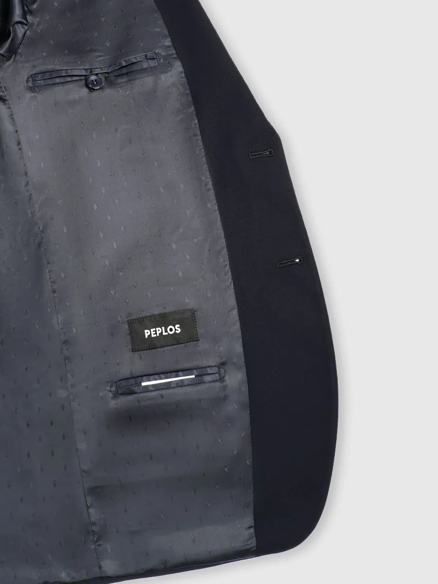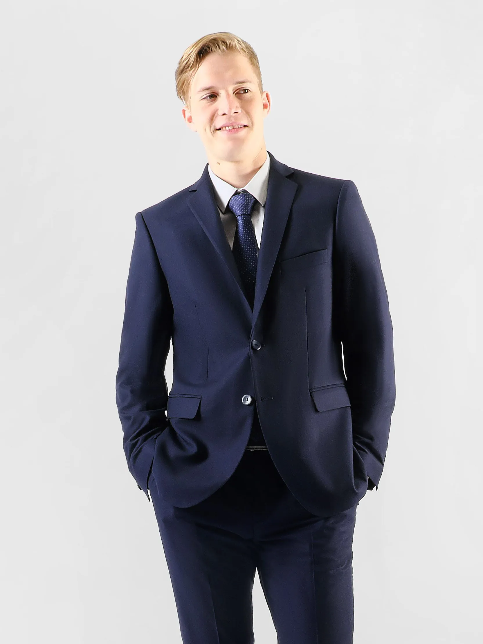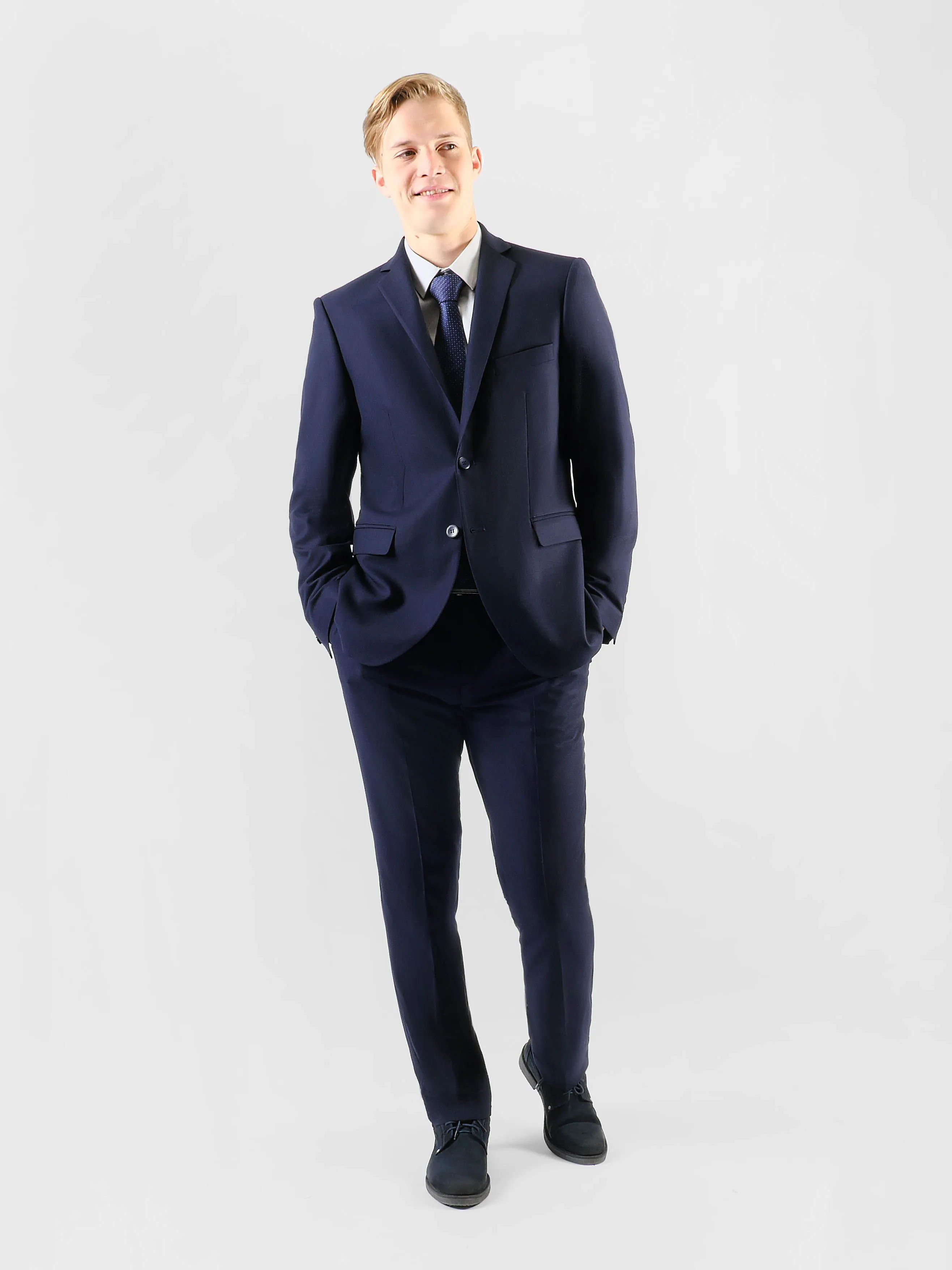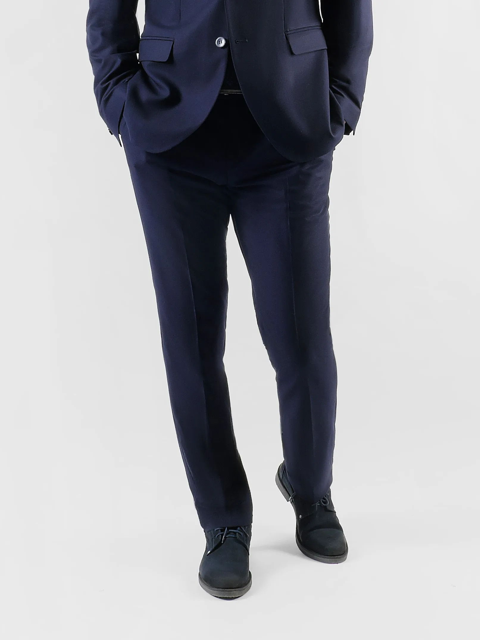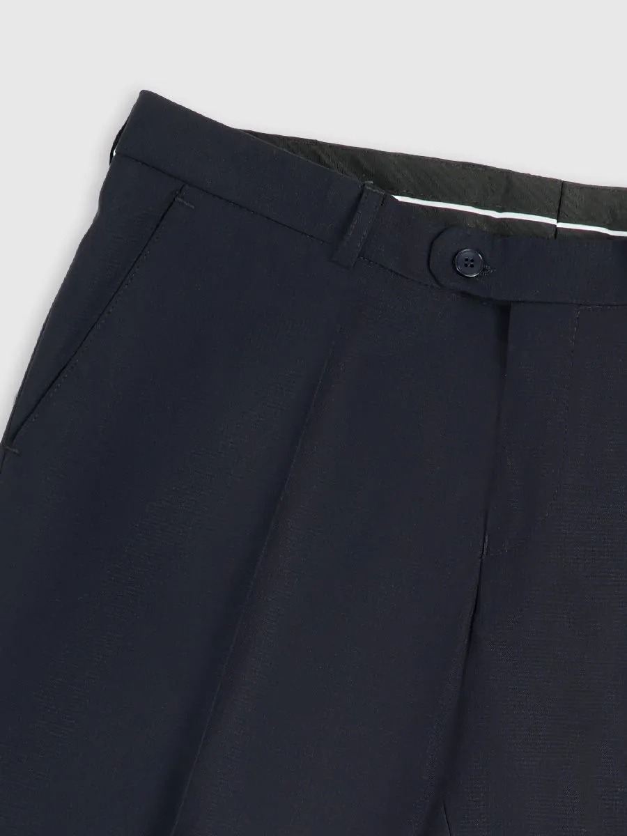 Мужской костюм в классическом стиле выполнен в темно-синем цвете. Ткань украшена легким микродизайном. Пиджак создан в современном стиле с мягкой линией плеч. У него две шлицы и традиционные карманы с клапанами. Брюки, имеющие стрелки и завышенную талию, немного сужаются к низу. На брюках — подрезные боковые карманы и один задний карман с пуговицей. Подкладка брюк выполнена из плотной ткани, пояс укреплен корсажной лентой, а по низу — тесьма. Этот костюм гармонично сочетает в себе классику и элегантность и является необходимым элементом любого мужского гардероба.