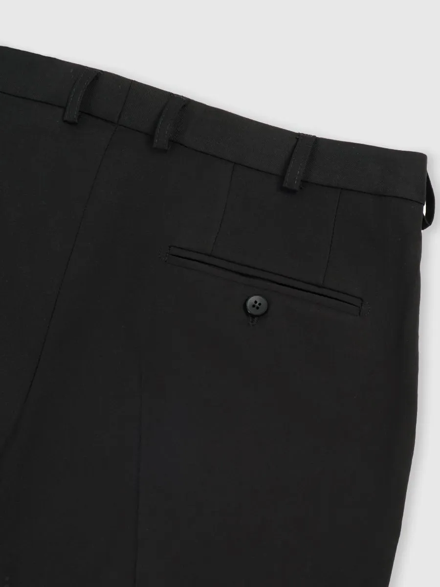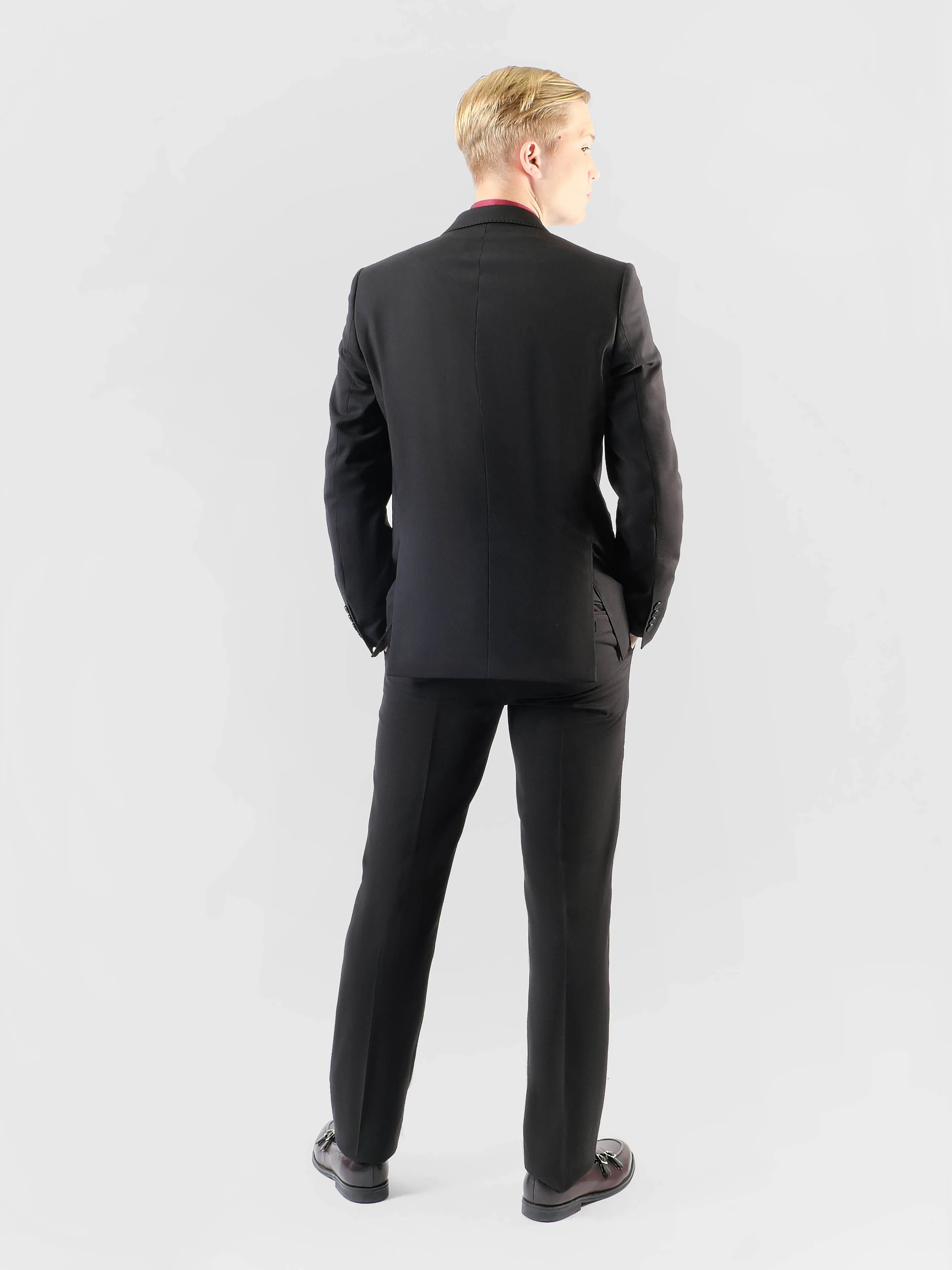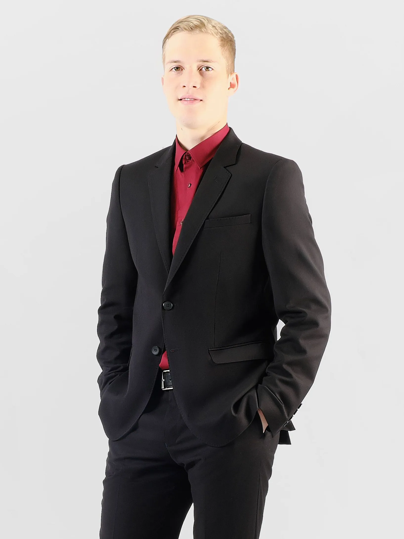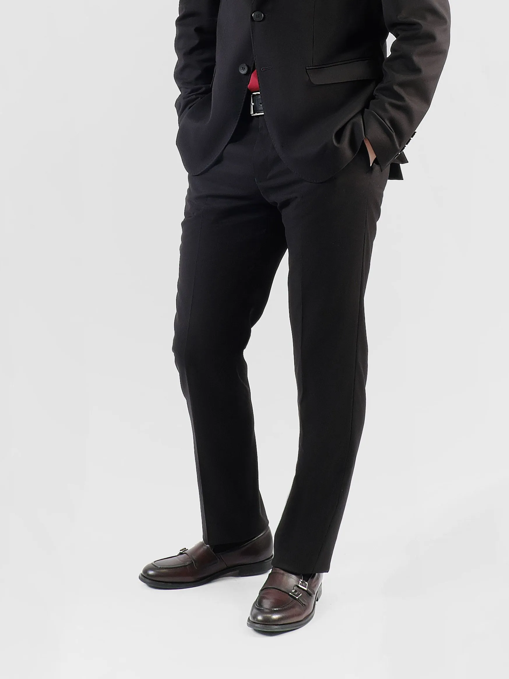 Однотонный черный мужской костюм из гладкой ткани без узоров излучает строгую элегантность и современный шик. Полуприлегающая модель костюма искусно подчёркивает стройность фигуры, предоставляя комфорт и свободу движения благодаря прекрасно подобранному фасону. Пиджак аккуратно декорирован франчиком, добавляющим изысканный акцент к классическому образу, а внешняя вспушка на лацканах привносит нотку изысканного мастерства и тонкости. Две шлицы на спине создают плавную линию и обеспечивают удобство в движении, что делает костюм идеальным для повседневной носки и деловых встреч.Брюки, составляющие ансамбль, продуманы до мельчайших деталей. Притачной пояс с восемью шлевками, боковые карманы с отрезным бочком, вытачки на задней части брюк - все это обеспечивает комфортную посадку и добавляет уверенности в каждой детали.