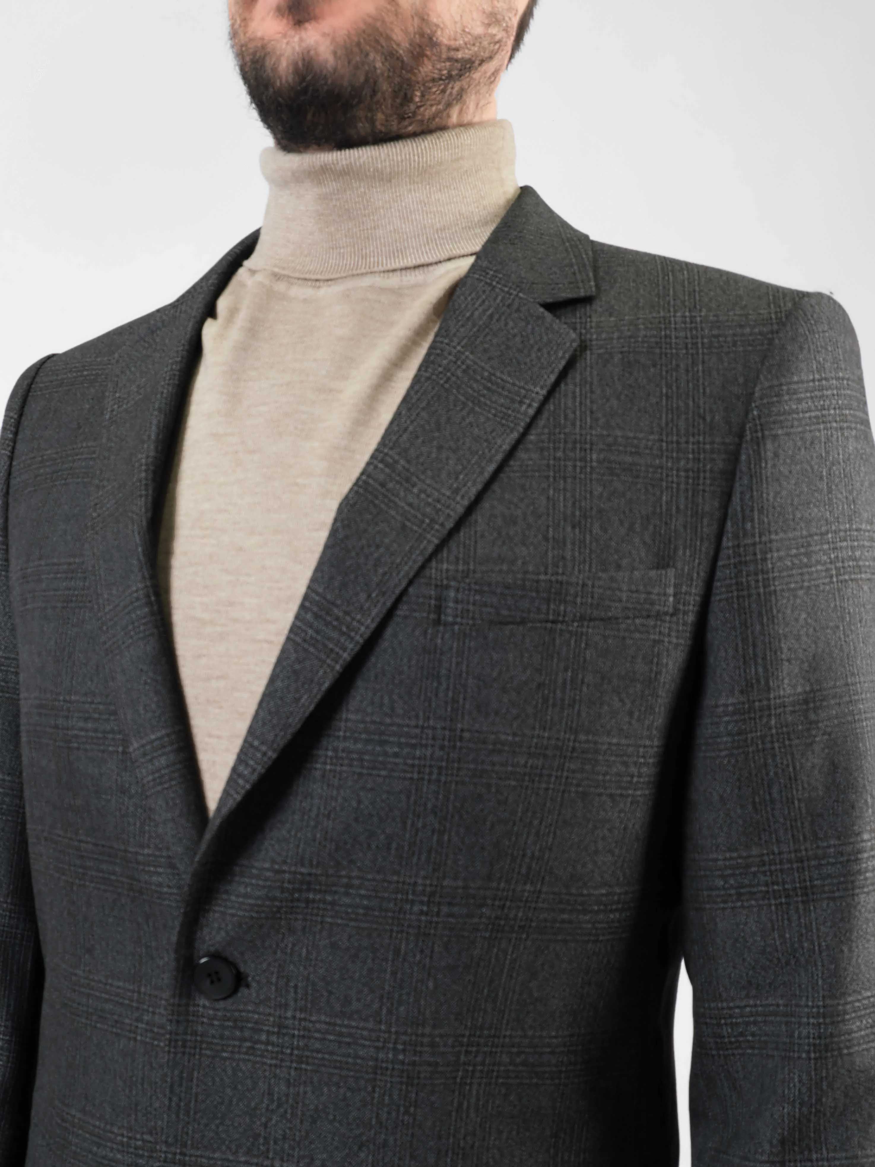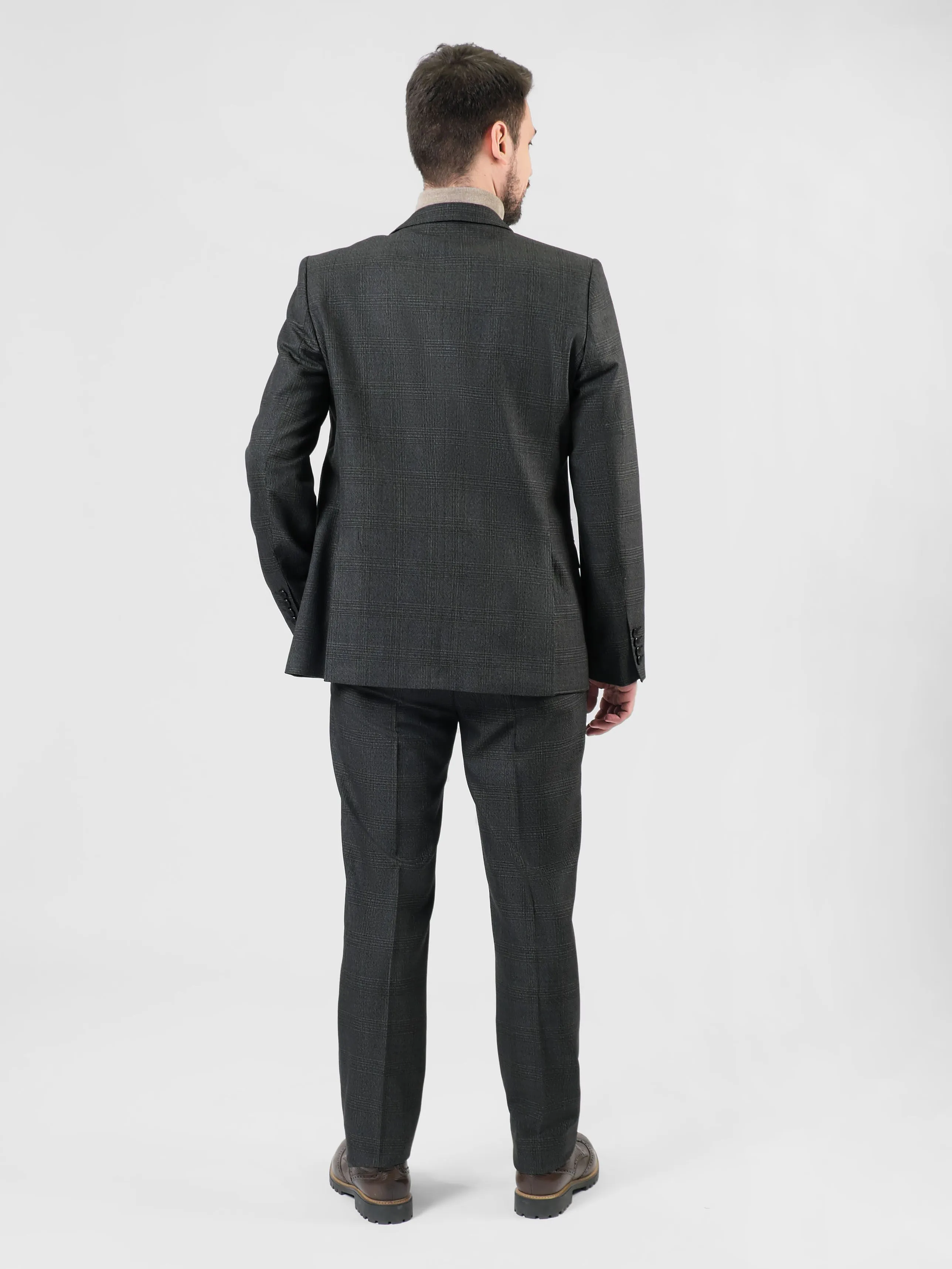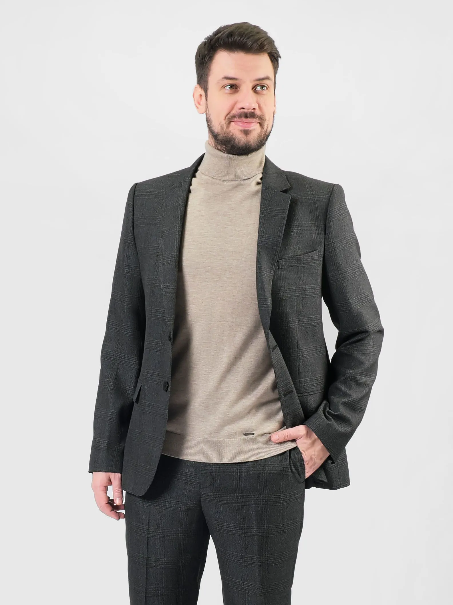 Темно-серый мужской костюм выполнен из меланжевой ткани, придающей ему особую текстурированную изысканность. В клетчатом узоре сочетаются разные оттенки серого, что добавляет глубину и стиль. Контрастный черный подклад с мелкой точкой придаёт костюму интересный акцент, незаметный снаружи, но прекрасно сочетающийся с общей строгостью и утонченностью дизайна. Силуэт костюма — классический, что делает его подходящим для самых различных ситуаций, от деловых встреч до торжественных событий. Прямой крой брюк и пиджака обеспечивает идеальную посадку и свободу движений, подчёркивая при этом мужественность и уверенность человека, который его носит.