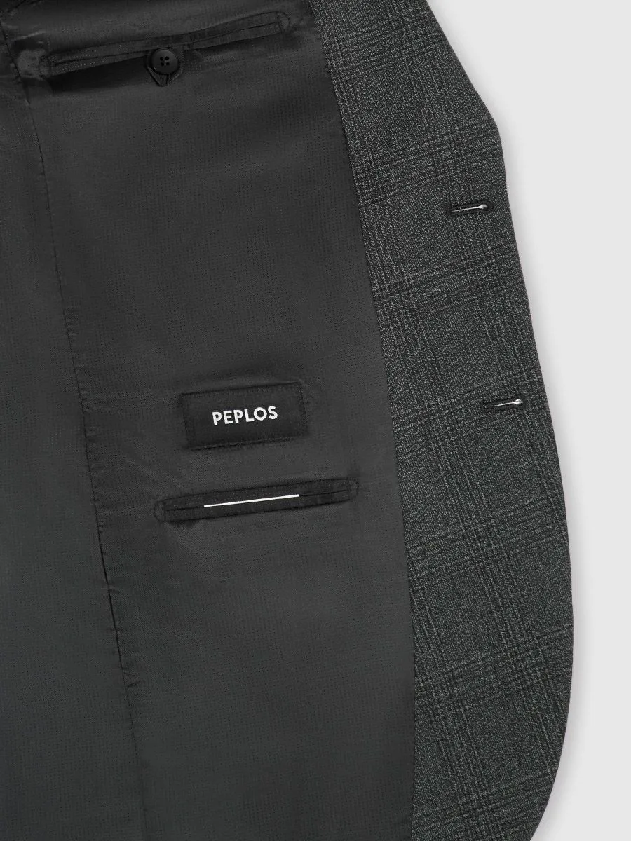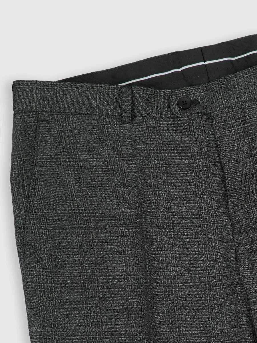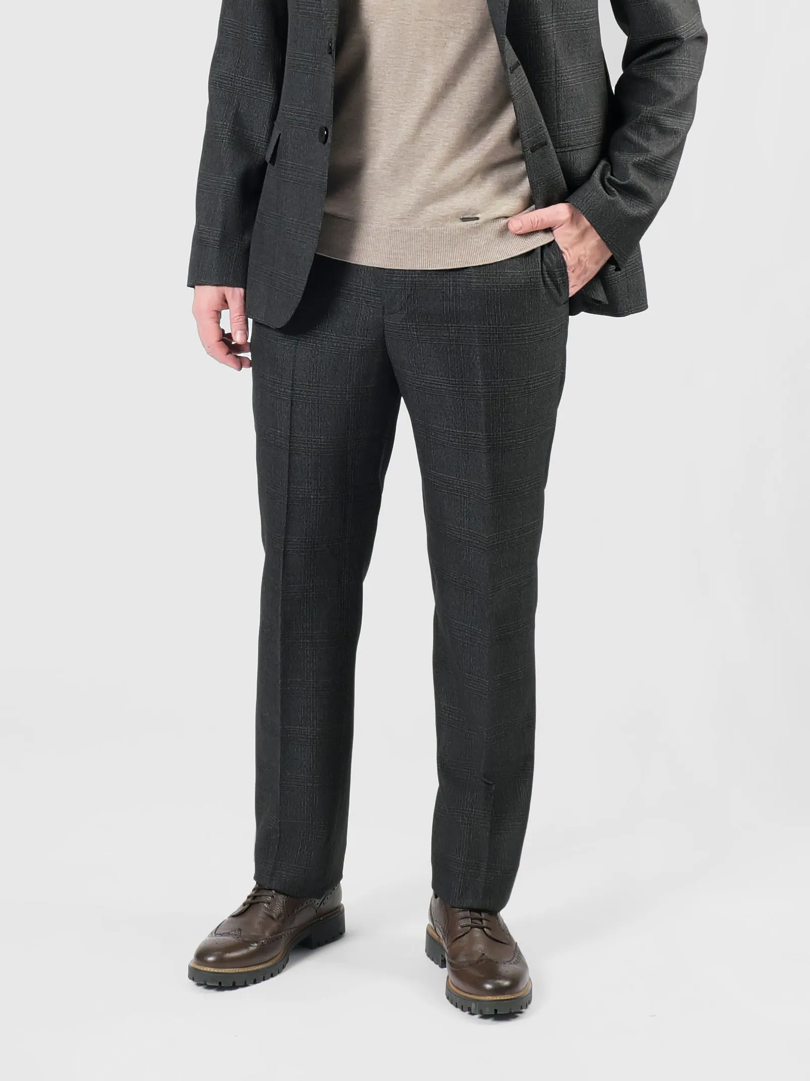 Темно-серый мужской костюм выполнен из меланжевой ткани, придающей ему особую текстурированную изысканность. В клетчатом узоре сочетаются разные оттенки серого, что добавляет глубину и стиль. Контрастный черный подклад с мелкой точкой придаёт костюму интересный акцент, незаметный снаружи, но прекрасно сочетающийся с общей строгостью и утонченностью дизайна. Силуэт костюма — классический, что делает его подходящим для самых различных ситуаций, от деловых встреч до торжественных событий. Прямой крой брюк и пиджака обеспечивает идеальную посадку и свободу движений, подчёркивая при этом мужественность и уверенность человека, который его носит.