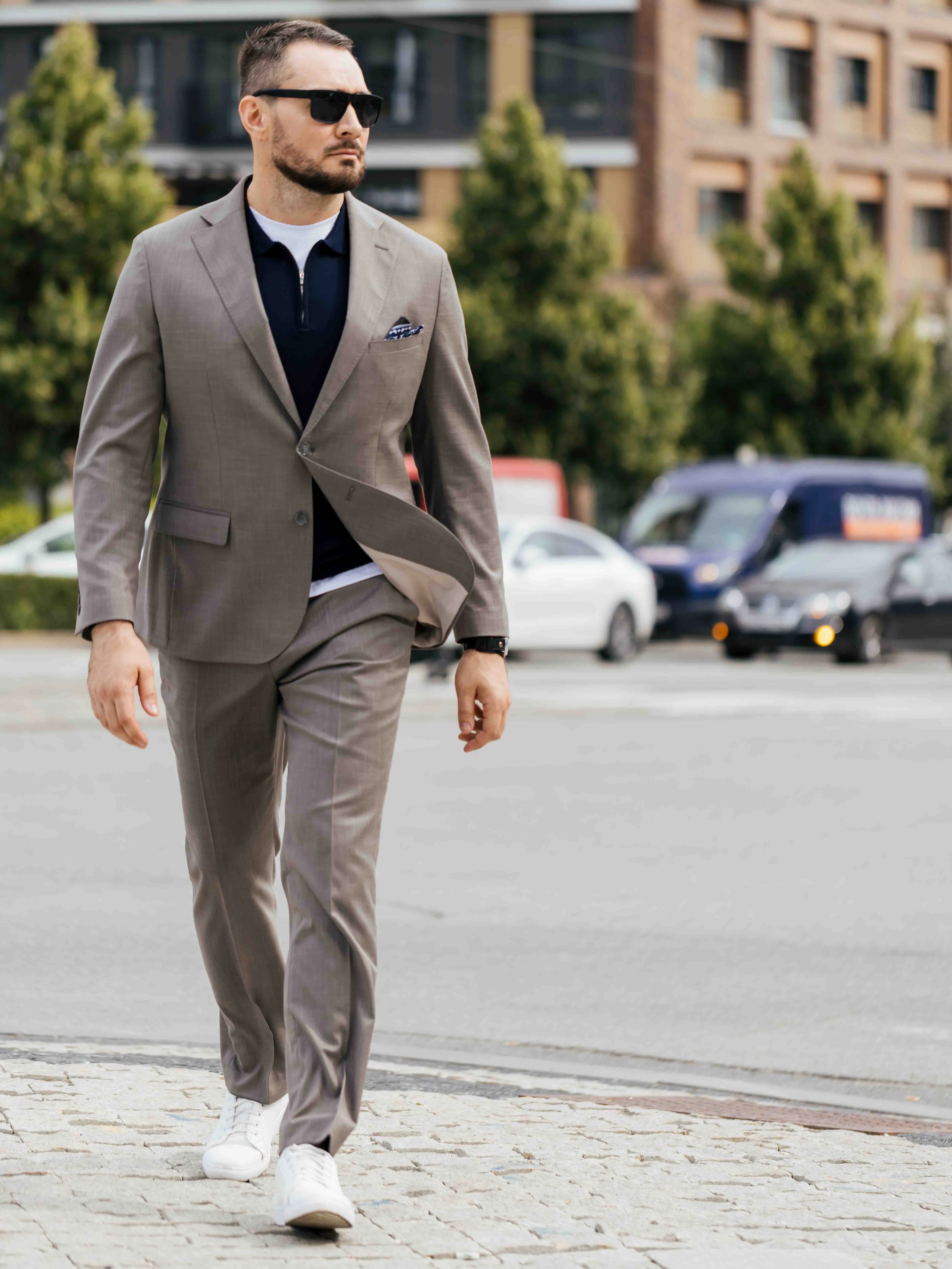 Темно-бежевый классический костюмс внешней вспушкойв тон верхней ткани прекрасное сочетание моды и непреходящей классики. Костюм соответствует всем модным тенденциям: широкий лацкан, контрастные подклад и пуговицы, к которым будет легко подобрать обувь в коричневых оттенках. Актуальный цвет позволить создавать образы в разных стилях -элегантном и более кэжуальном.