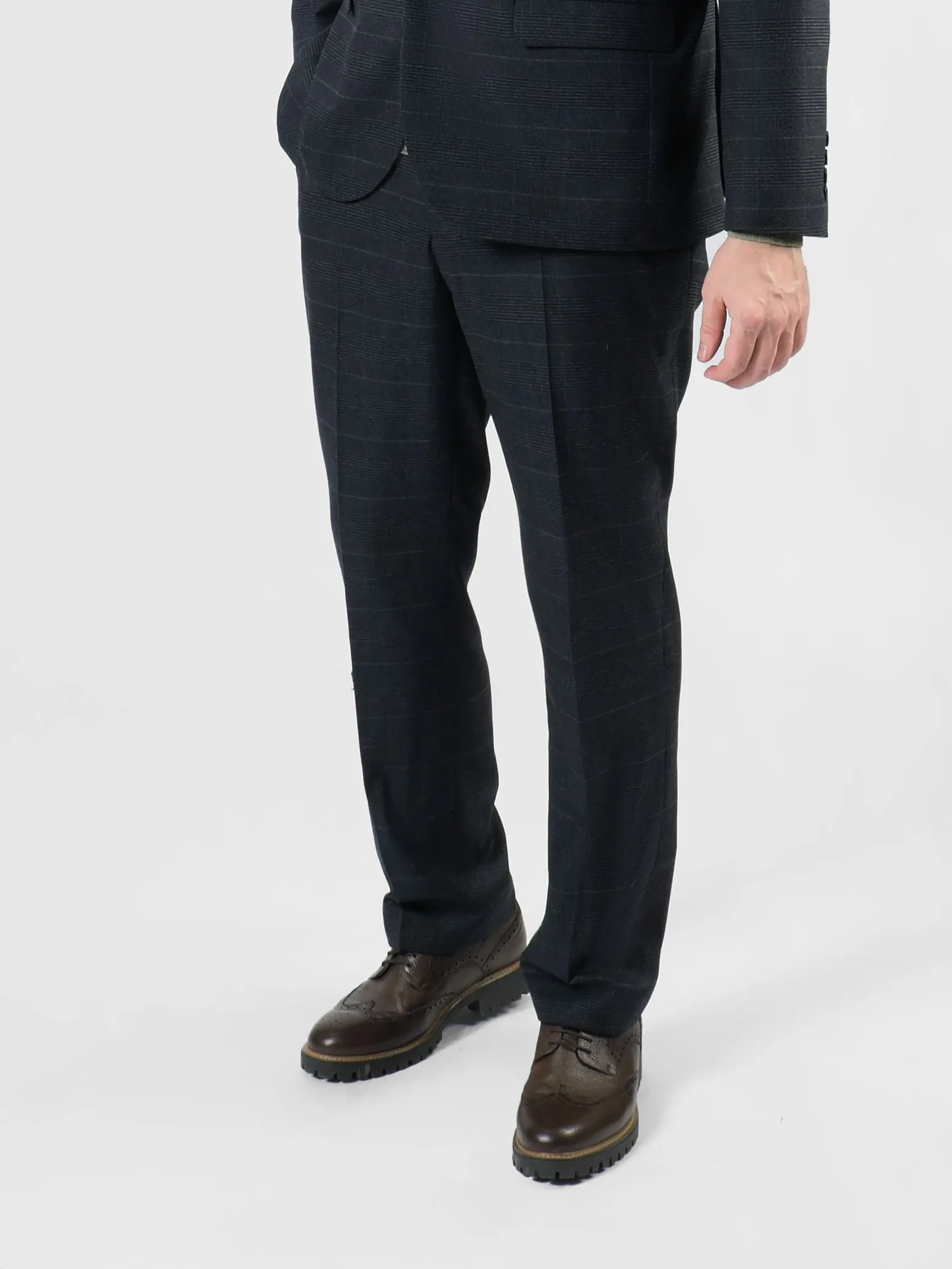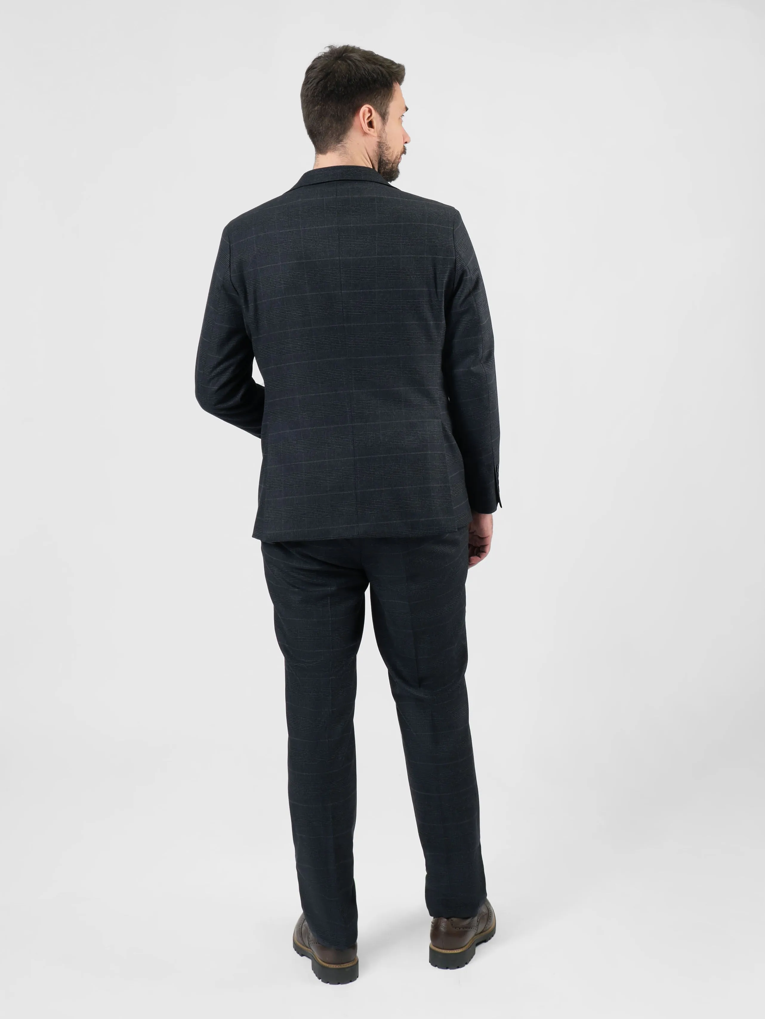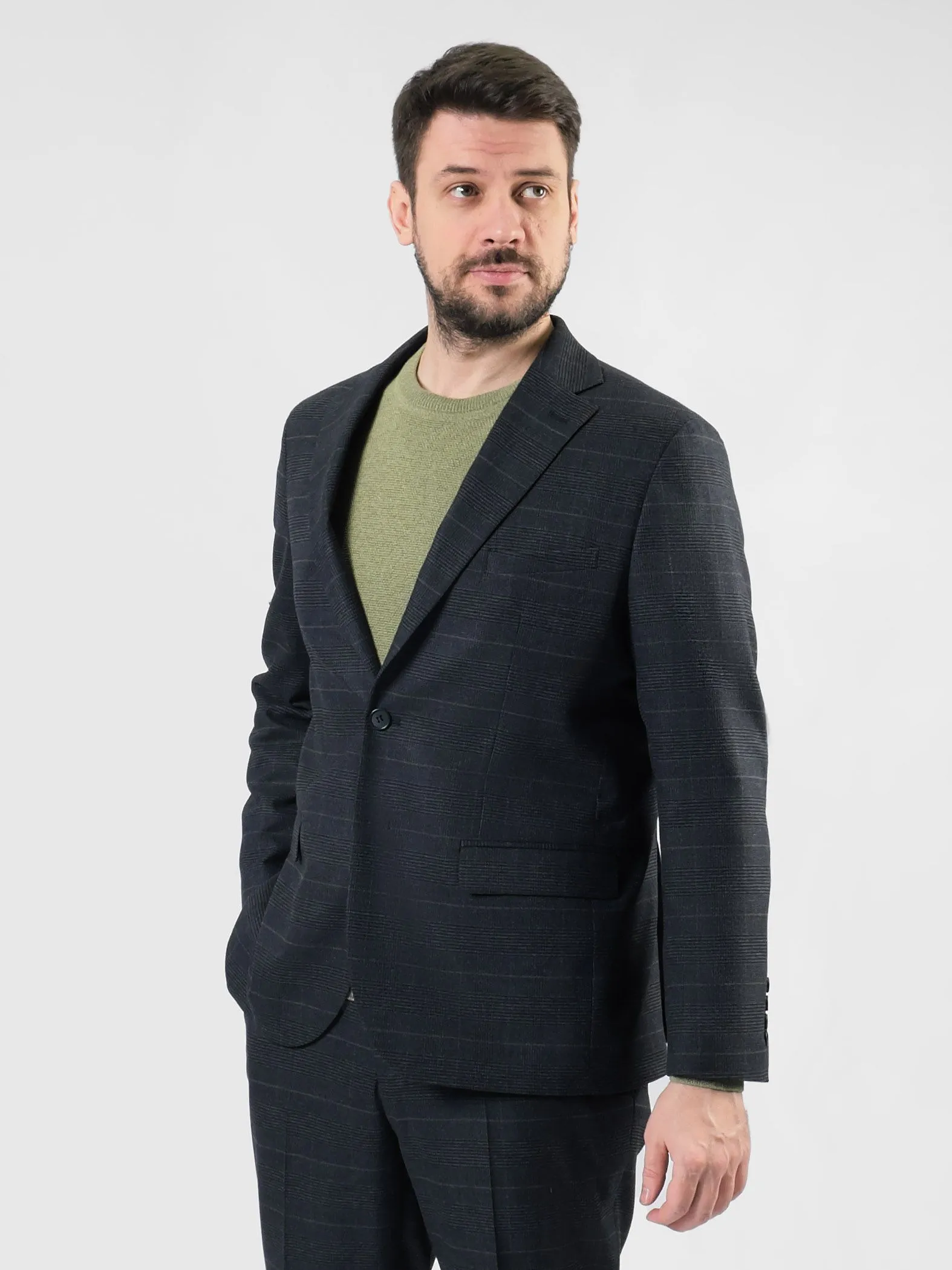 Этот темно-серый мужской костюм в стиле Business Casual выделяется своим контрастным клетчатым узором. Клетка, словно хамелеон, может переливаться и менять восприятие костюма в зависимости от выбранного оттенка сорочки или джемпера. Этот костюм - символ утонченности и гибкости, который подстраивается под настроение и обстоятельства, создавая всегда актуальный образ.
