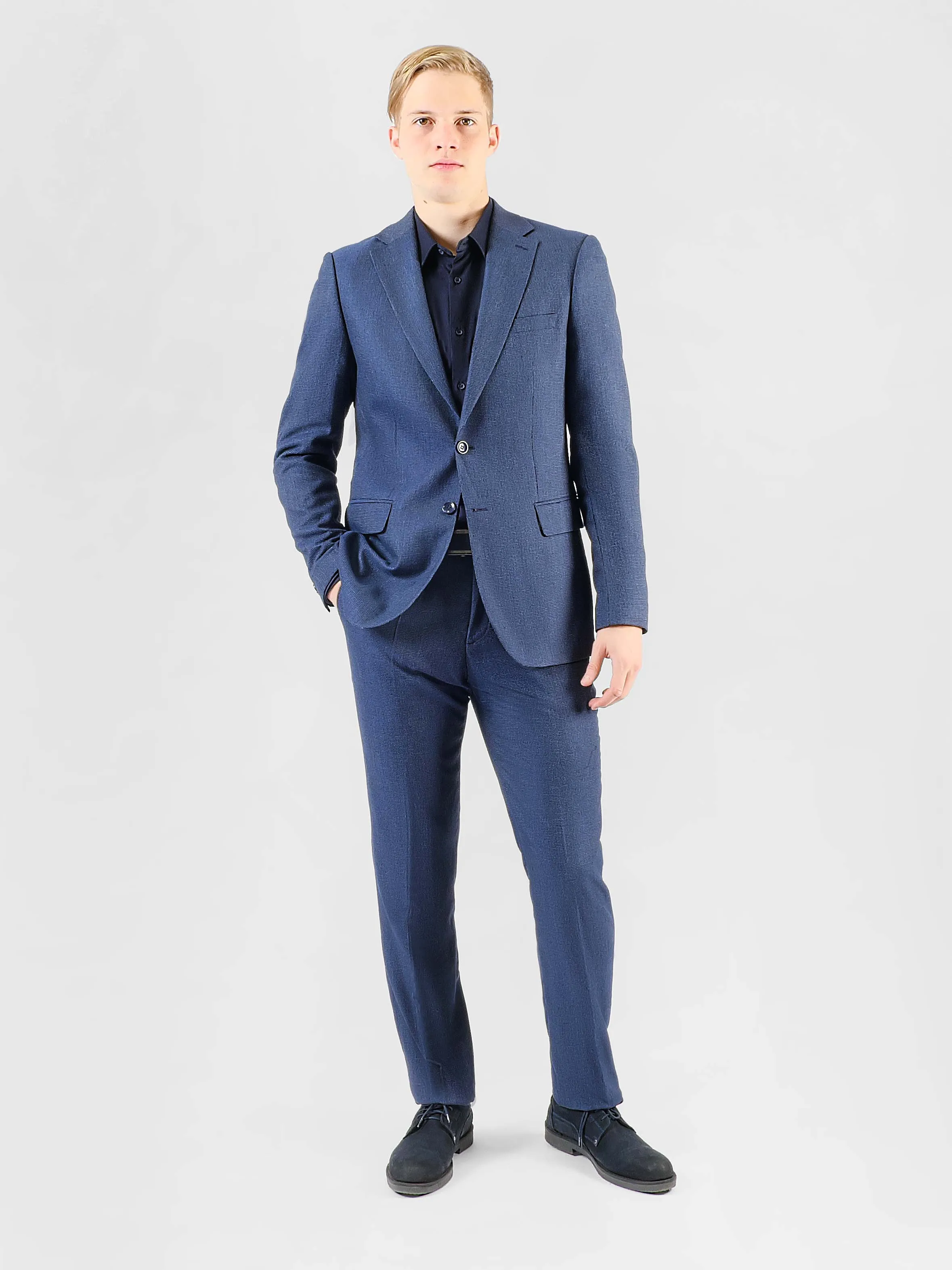 Классический силуэт костюма имеет свободный и расслабленный крой. Он не облегает тело, позволяя свободное движение и комфорт. Пиджак имеет более широкие плечи, что создает сбалансированный вид. Брюки обычно прямые, без излишней утяжки. Этот стиль подходит для различных случаев, включая деловые встречи и торжественные мероприятия.