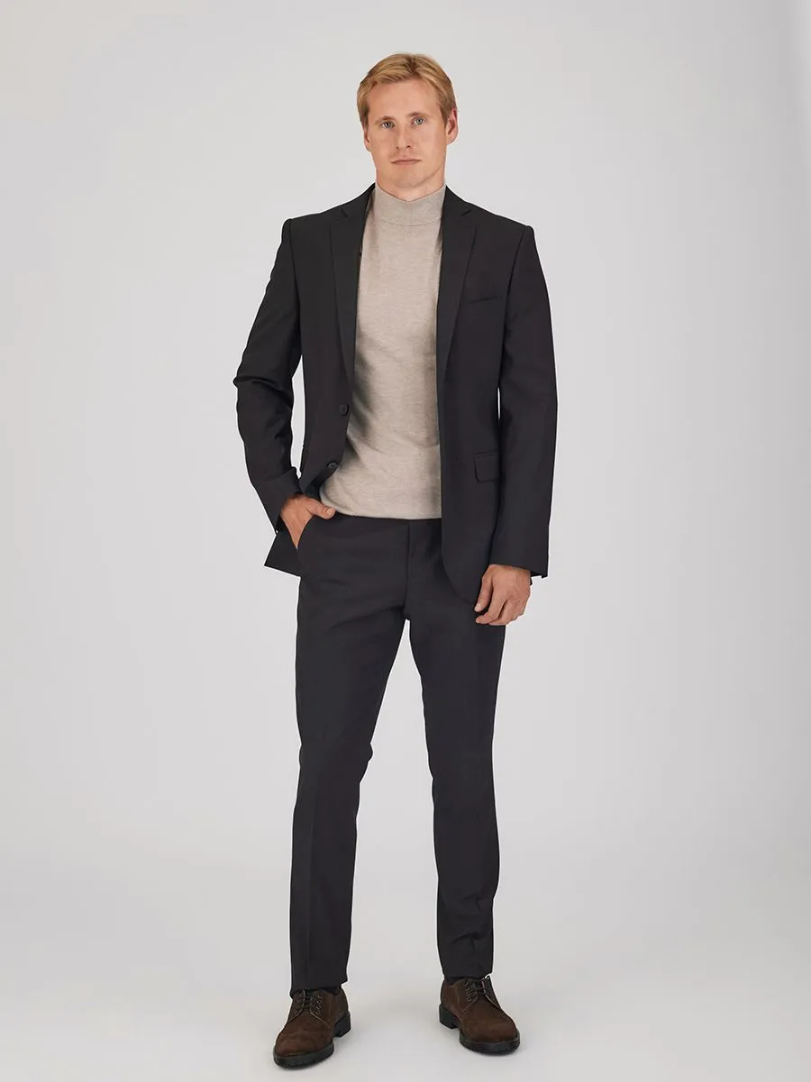 Совершенство в каждой детали, изысканность в каждом шве: черный мужской костюм, где едва уловимая клетка создает игру текстур, дарит образу глубину и объем. Приталенный силуэт пиджака подчеркивает атлетичность фигуры, а классическое плечо и две шлицы сзади добавляют свободы движений и безупречного комфорта. Зауженные к низу брюки со стрелками завершают этот ансамбль, создавая образ современного денди, уверенного в себе и своем стиле.