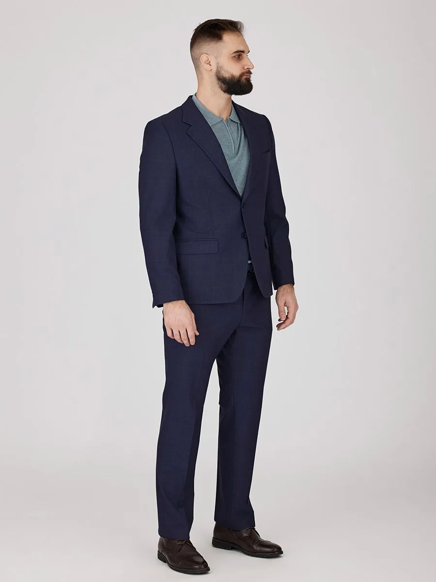 Современный синий костюм в черную клетку выполнен в элегантном полуприлегающем силуэте. Пиджак с облегченным плечом и выразительным широким лацканом дополнен классическими прямыми брюками, создавая цельный и сбалансированный образ для деловой среды.