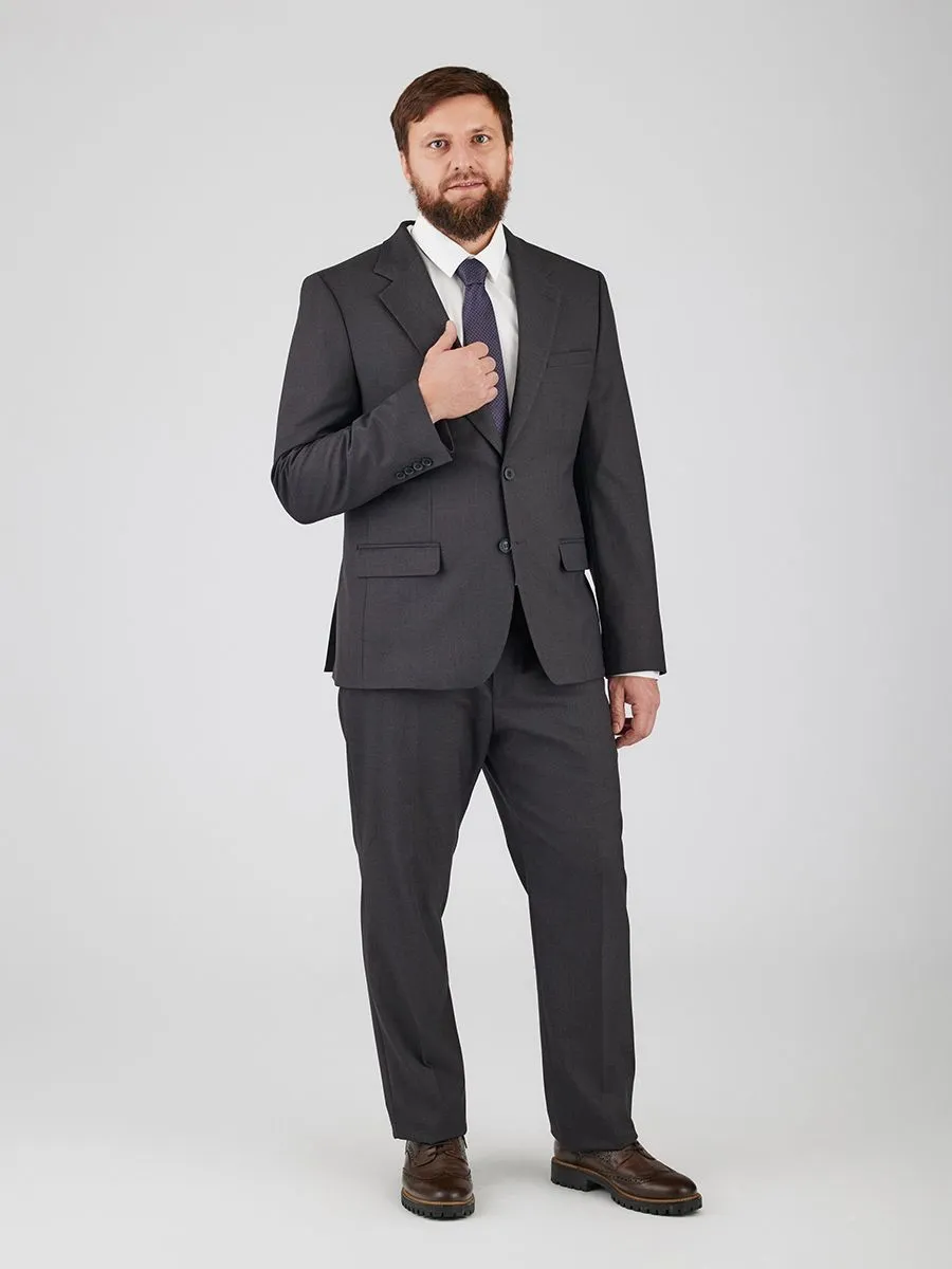 Этот темно-серый мужской костюм – воплощение элегантности и современного стиля. Полуприлегающий силуэт мягко очерчивает фигуру, не сковывая движений. Классическое плечо пиджака и широкий лацкан добавляют образу уверенности и респектабельности. Две шлицы обеспечивают комфорт и свободу движений. В комплекте – классические брюки со стрелками, высокой посадкой талии (по задней слонке) и слегка зауженным низом. Боковые карманы с подрезным бочком и один задний карман на пуговице добавляют функциональности. Брюки на подкладке, пояс на корсажной ленте гарантируют идеальную посадку и комфорт на протяжении всего дня.
